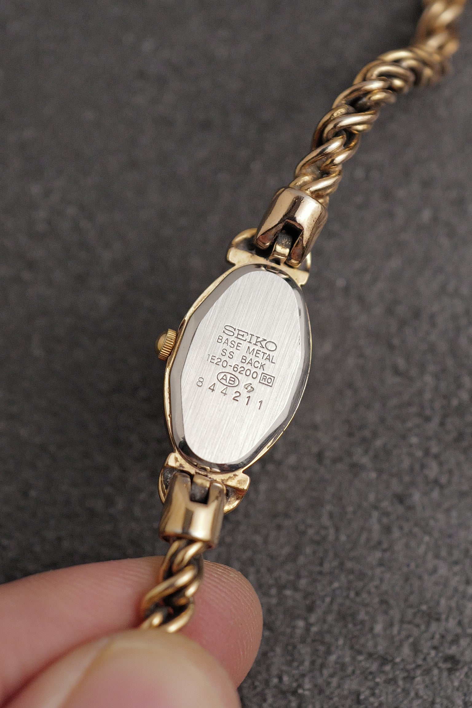 | Watch Summary | The famous 1E20 models of the seikos during the 80s... pretty sure they were high on something as they created the most elegant and demanded models ever. Usually priced at the premium on the current market, many were set with gemstones with low production numbers. Slim oval gold-tone polished case paired with a narrow two-tone bracelet. The bracelet alternates gold leaves and pink crystal-studded accents. The entire silhouette flows like a vine along the wrist, with floral-like articulation in the links. maximum wrist at 16cm. minimum at 14cm |