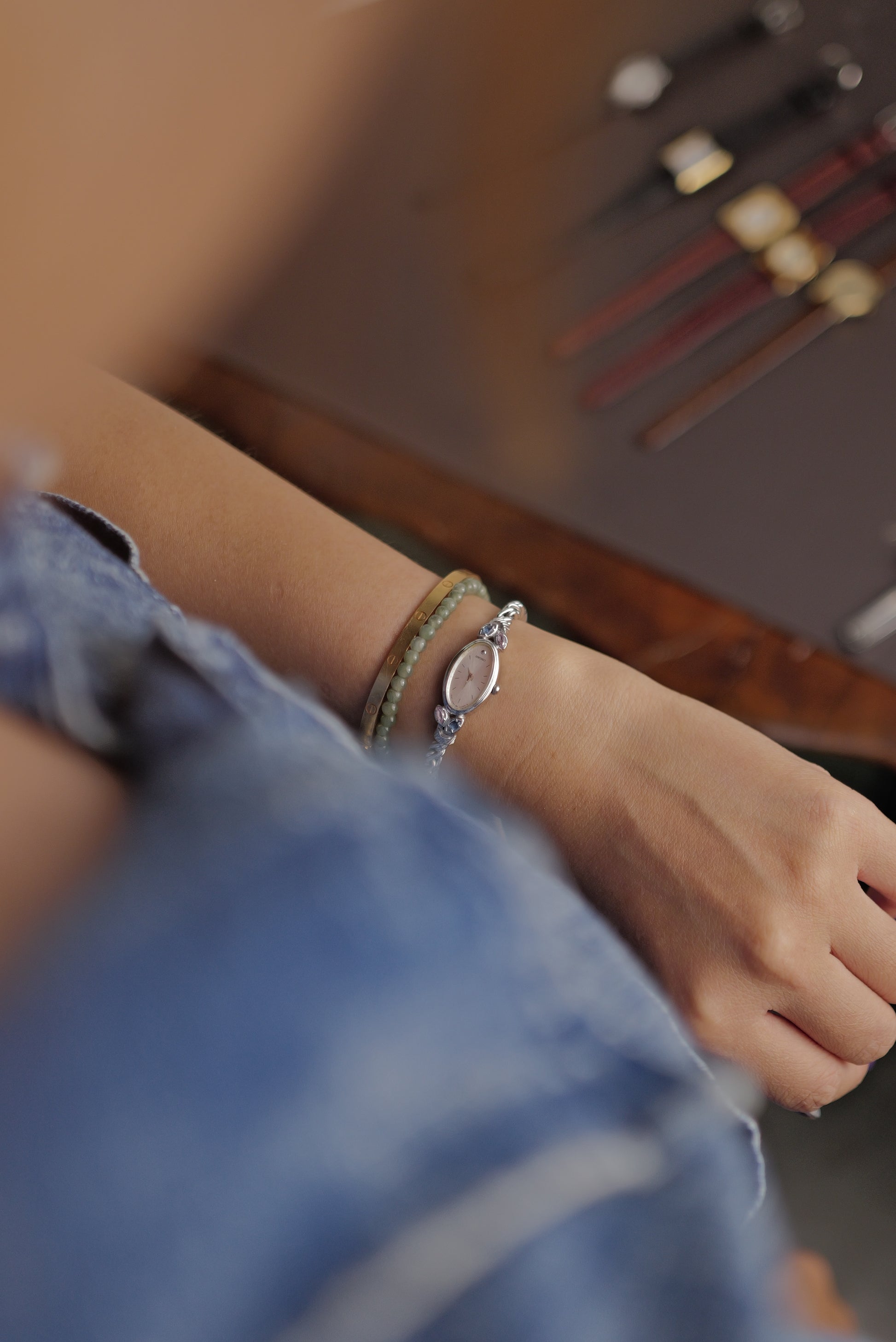 Watch Summary | Usually priced at the premium on the current market, many were set with gemstones with low production numbers. Slim oval silver-tone polished case paired with a narrow vine-esque bracelet. The bracelet alternates silver leaves and pink crystal-studded accents. The entire silhouette flows like a vine along the wrist, with floral-like articulation in the links. Watch has a bracelet length of 16cm. with links removable to 14cm. . |