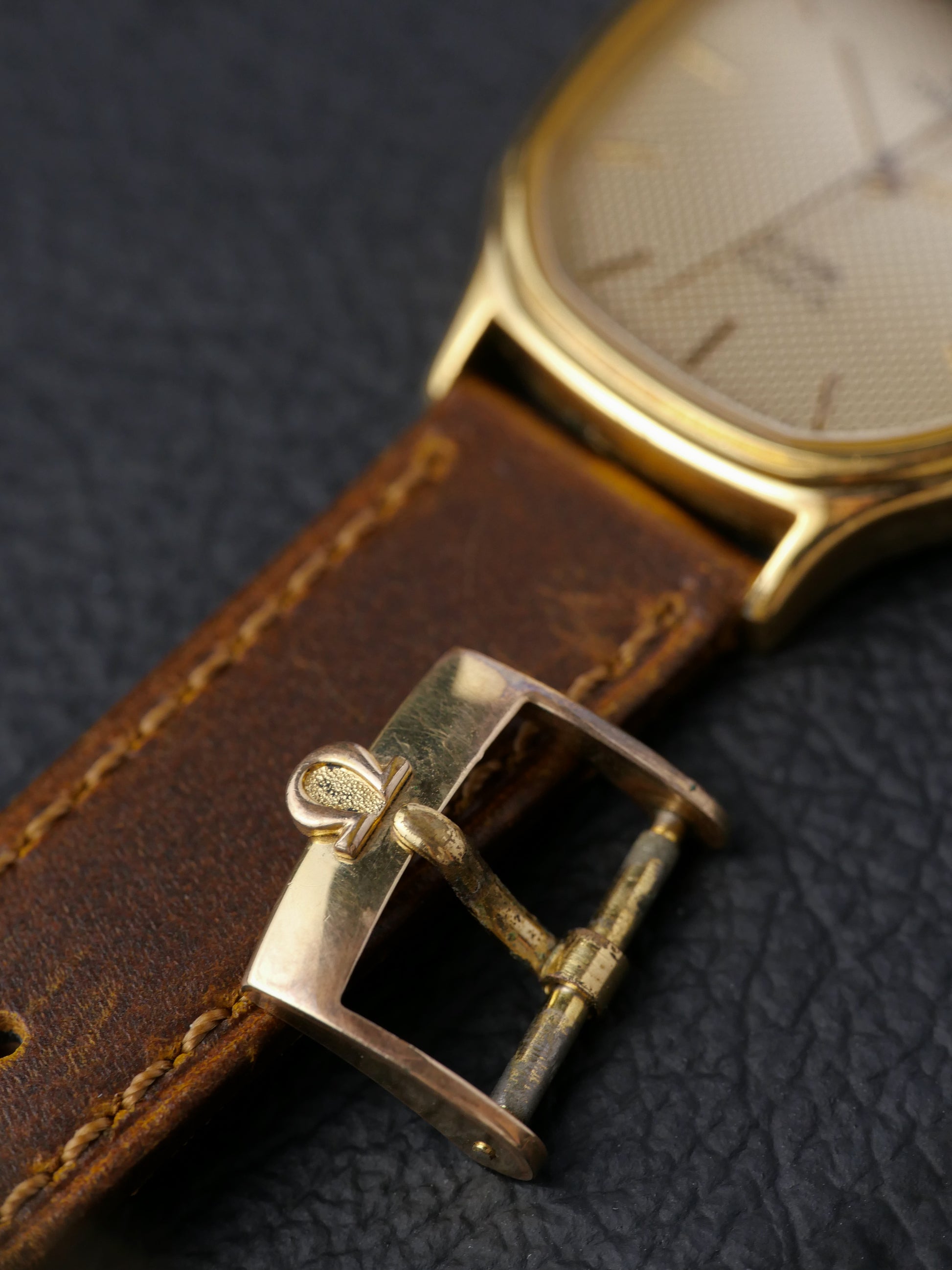 New aftermarket brown distressed leather strap and gold-toned buckle (16 mm), and included original Omega buckle (16mm)