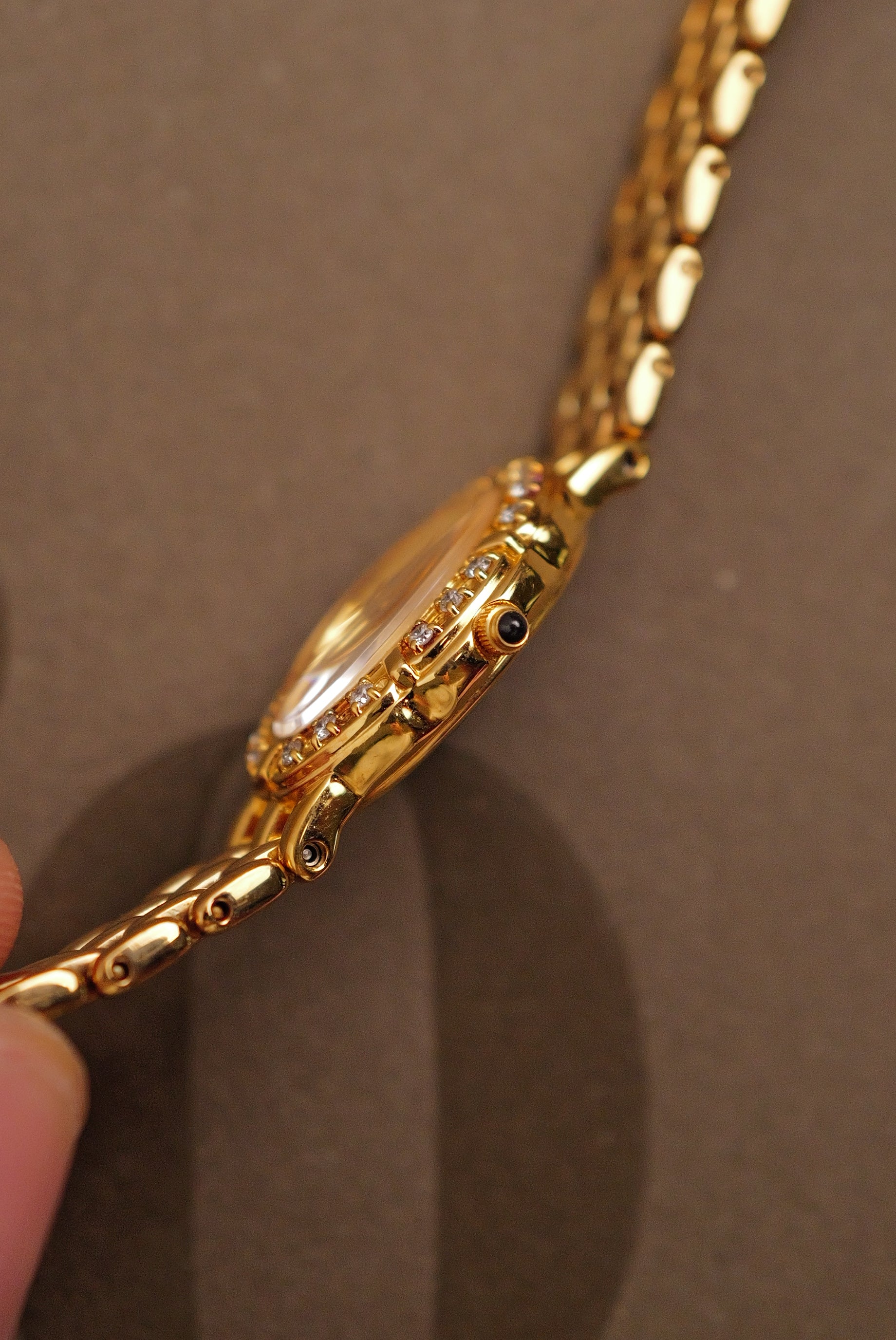 A rare Exceline women's vintage dress watch, which comes in a luxurious gold-tone finish. Features a beautiful oval shaped case with an eye catching diamond bezel . Further complimented by the mother of pearl champagne colored dial ,which adds to the overall aesthetic of the watch . . It comes with the gold plated multi link bracelet with max wrist size of 16.2 cm. |