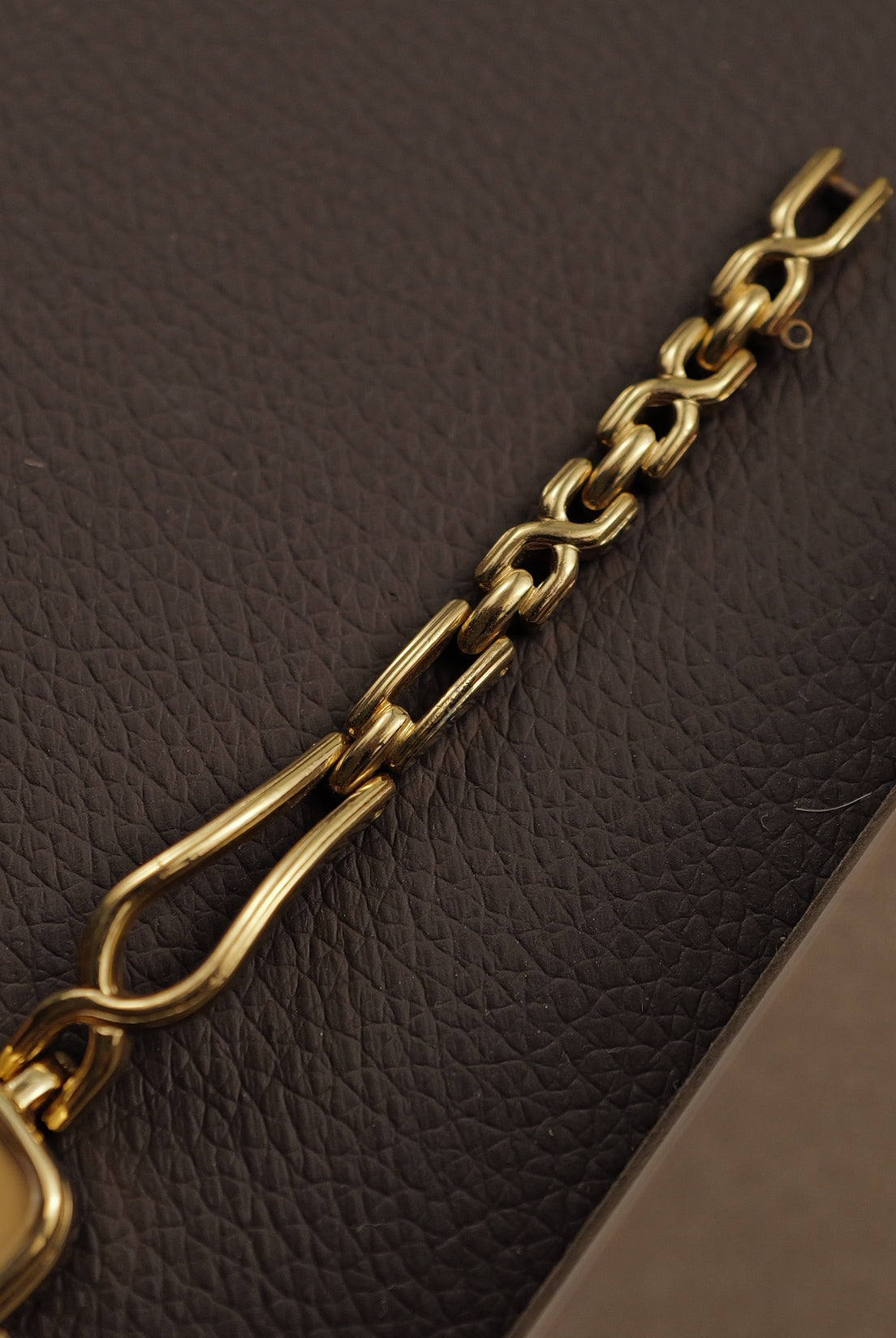 | Watch Summary | An soft angle rectangle gold-tone case with polished finish and fluted lugs forming a knot-like shape. The champagne dial has applied gold baton indices and pencil hands. Just love how captivating the bracelet design is! |