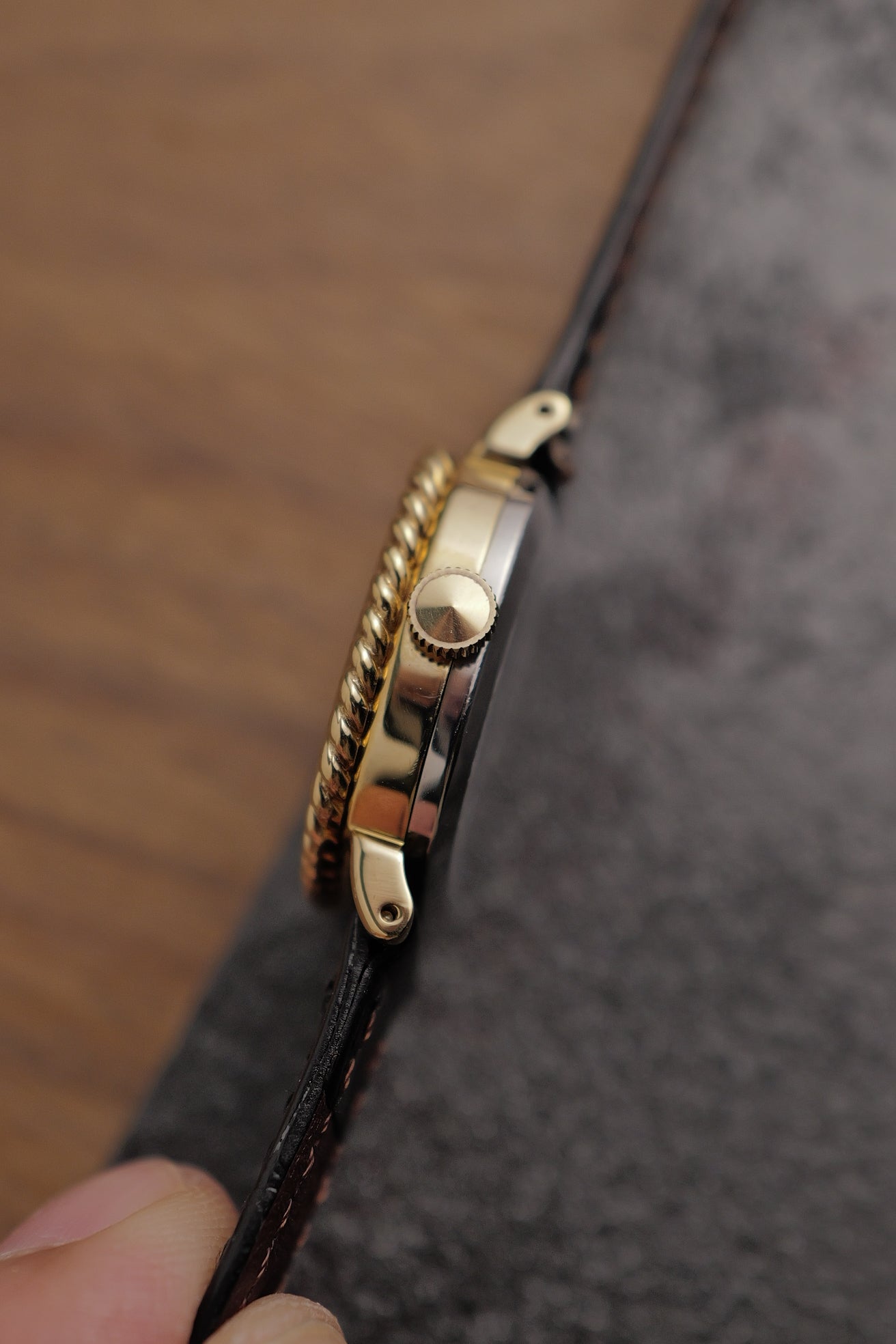 | Watch Summary | a series which experimented on ladies watches with manual winding movement. Comes with a ribbon bezel and a lacquer "onyx black" dial without any minute markers. Early 70s stuff is always welcomed to the store as the brand was more daring with case design and dial materials. watch has no dial corrosion and glass has a few light hairlines due to age. Watch is attached with a new aftermarket strap and gold buckle. Watch has been regulated to an average +-20s/day |