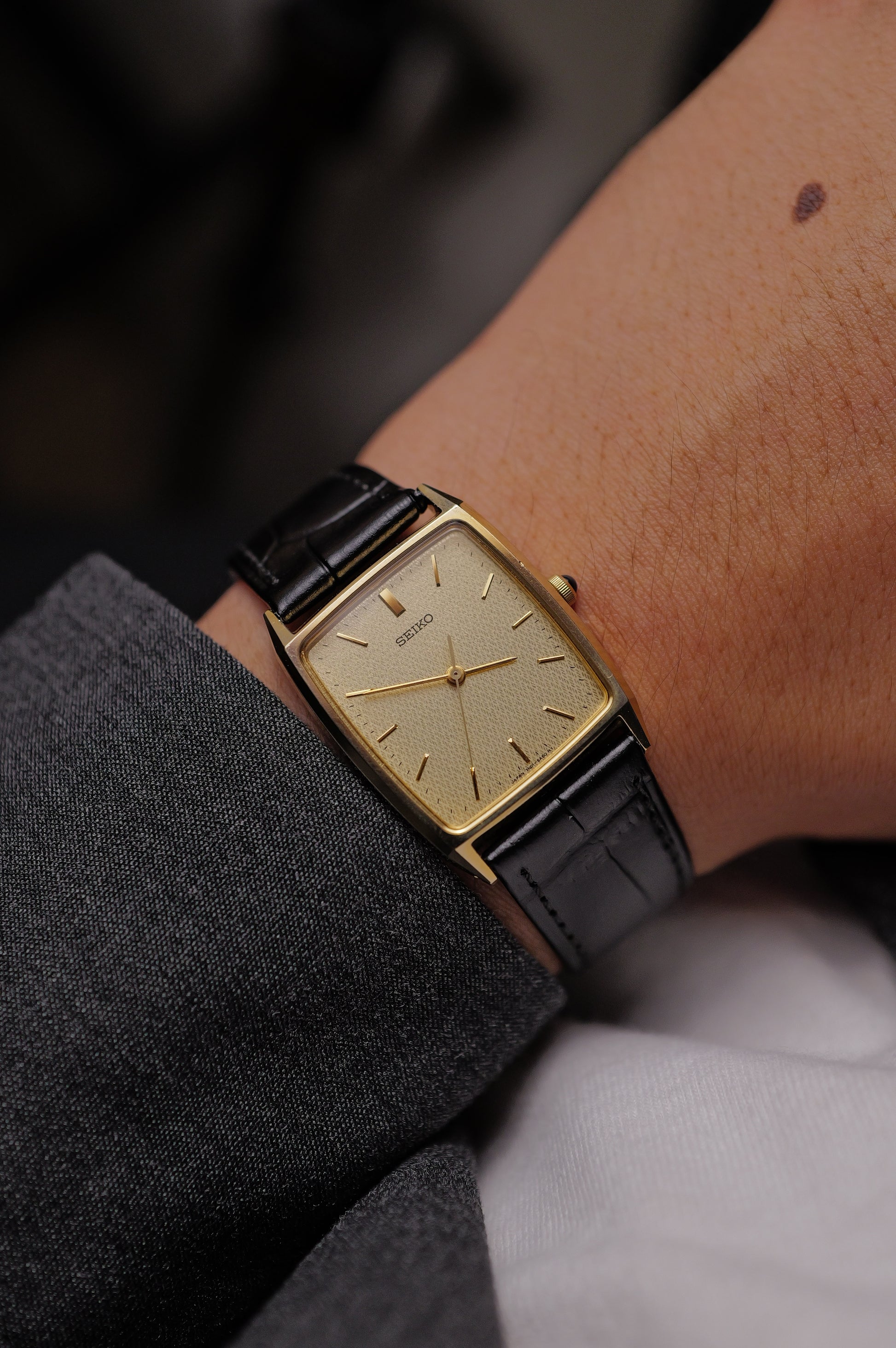 A rather simple Seiko Tank with a close up Tapestry Dial. Quite the surprise that this was not added into the dolce series as it satisfy all the "dolce" criteria, yet possibly seiko was trying to create a new line with just the SEIKO brand. Comes with a speical commemorative stamping at the caseback.
