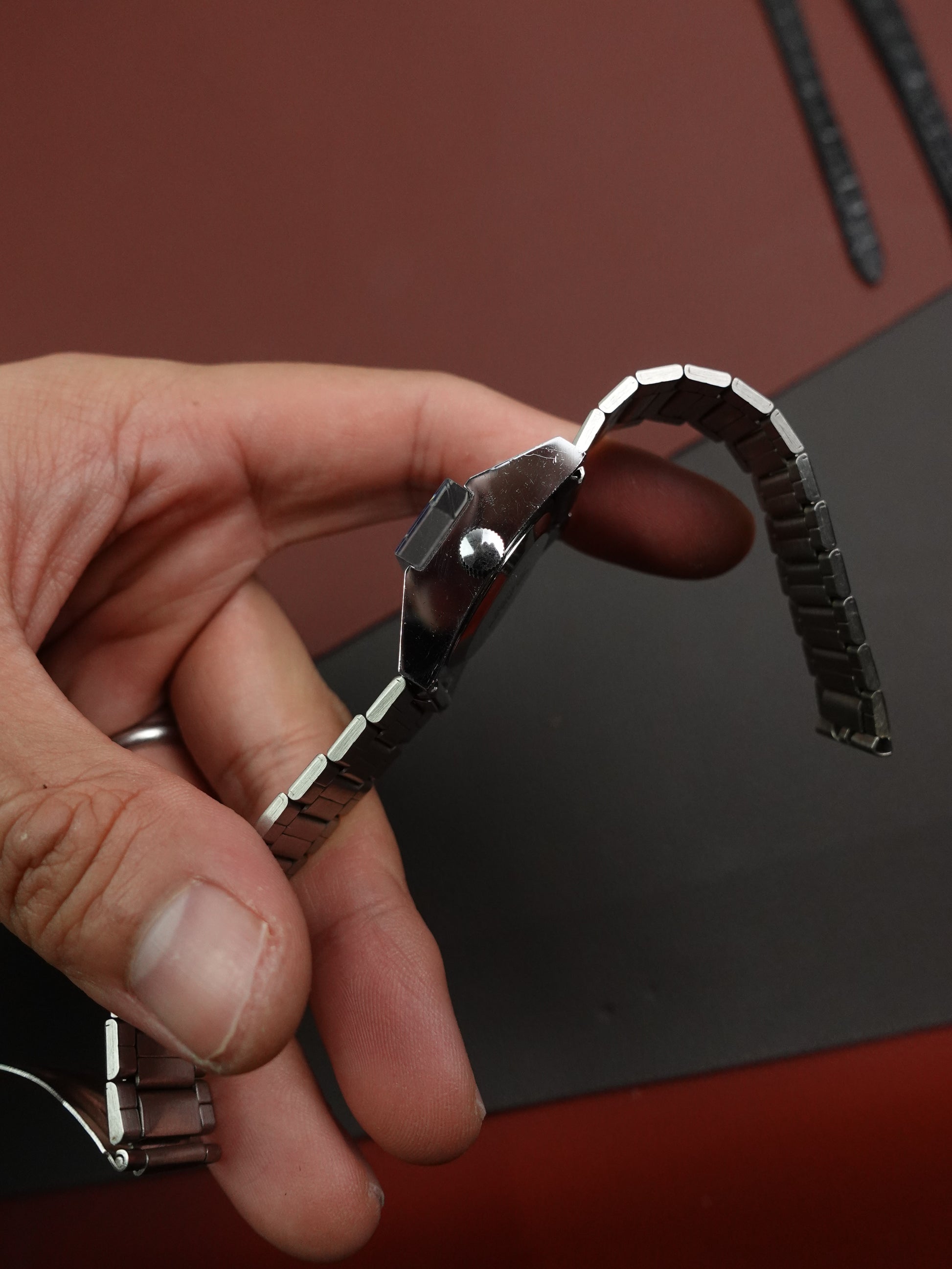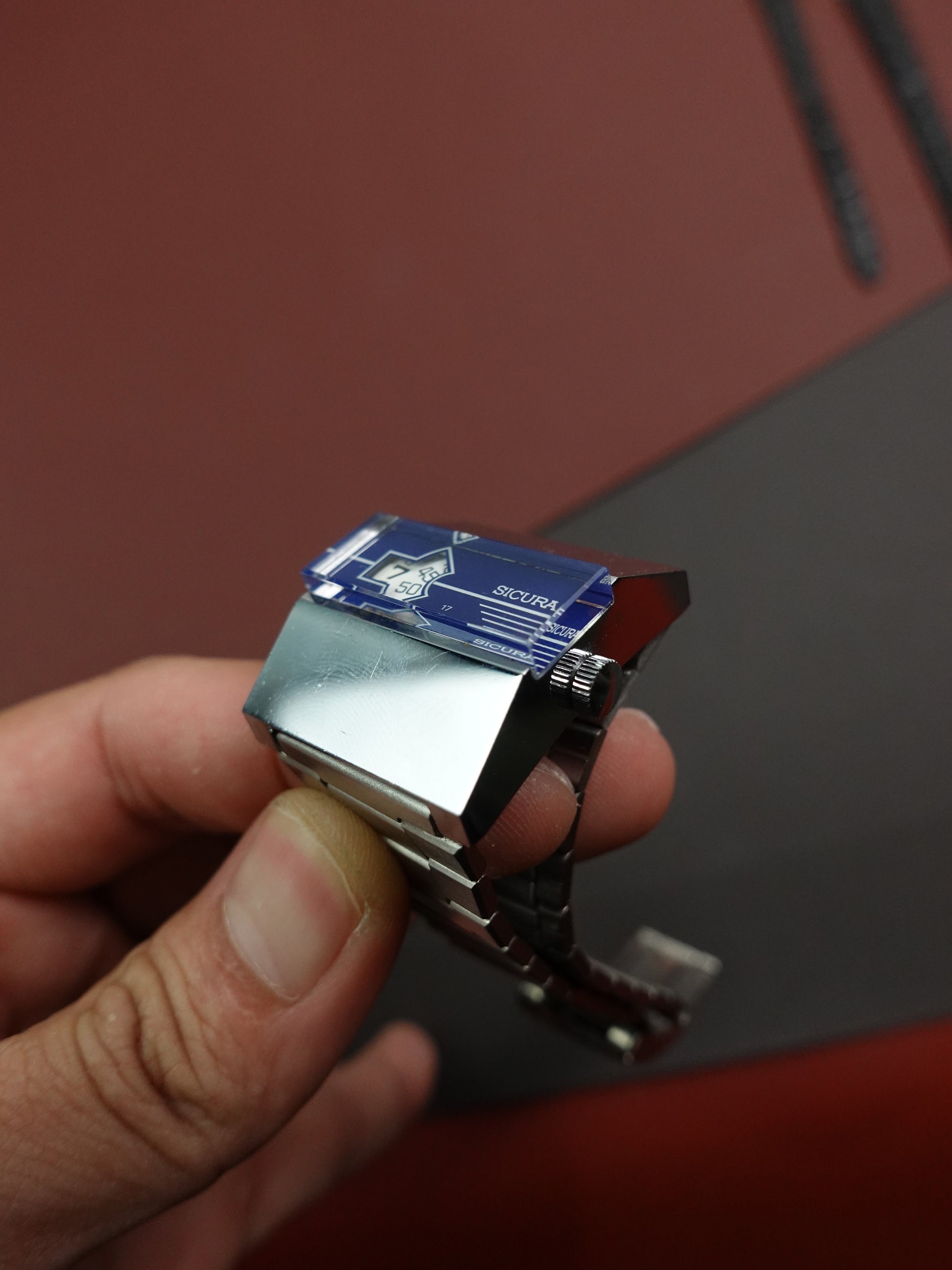 The time of space age! a swiss made jumping hour from a now defunct brand Siruca. A very angular case design with a full polished case (with hairline scratches). it indeed looks like a spaceship from all angle. A navy blue dial to keep it simple and not too complicated.