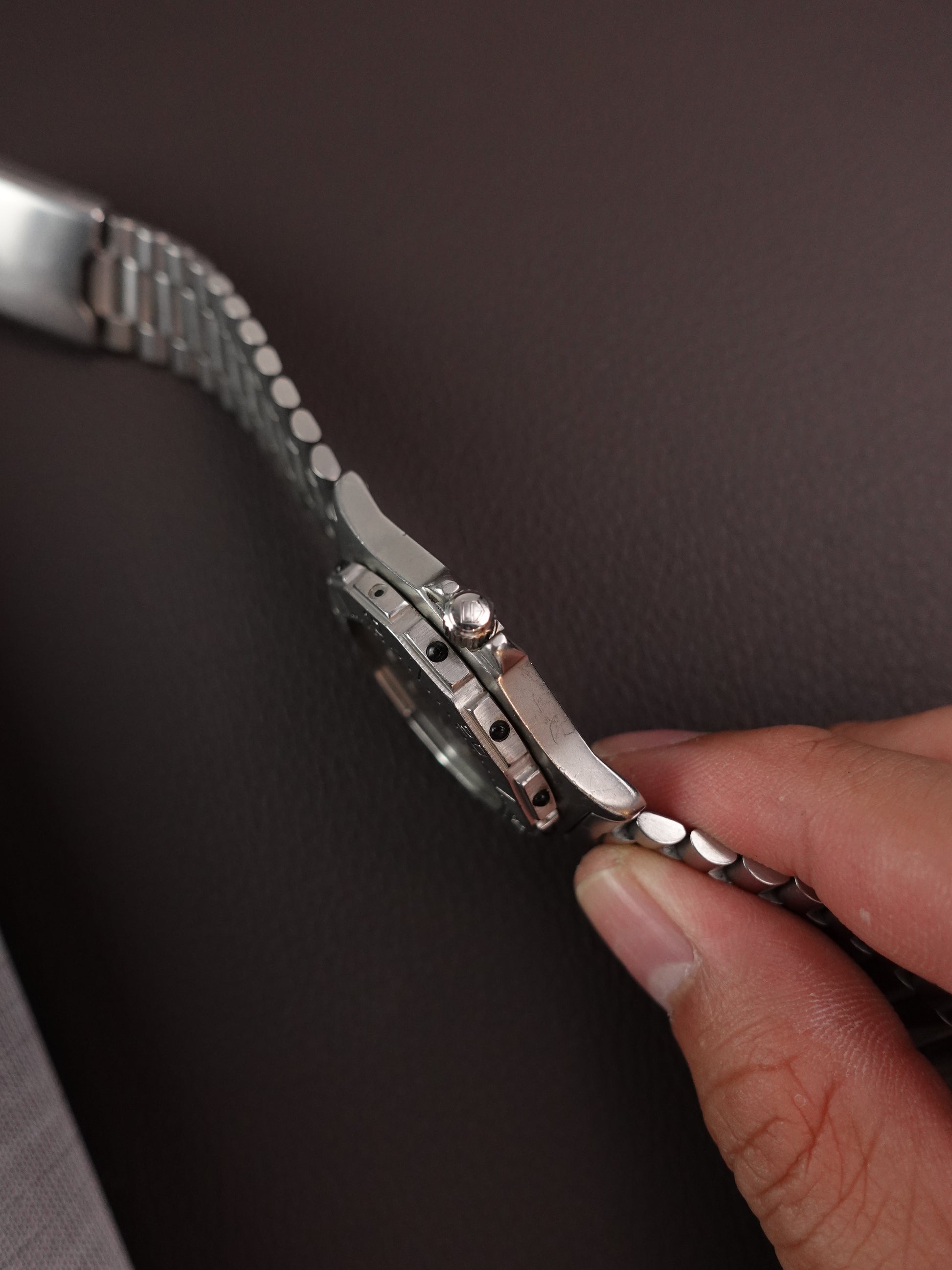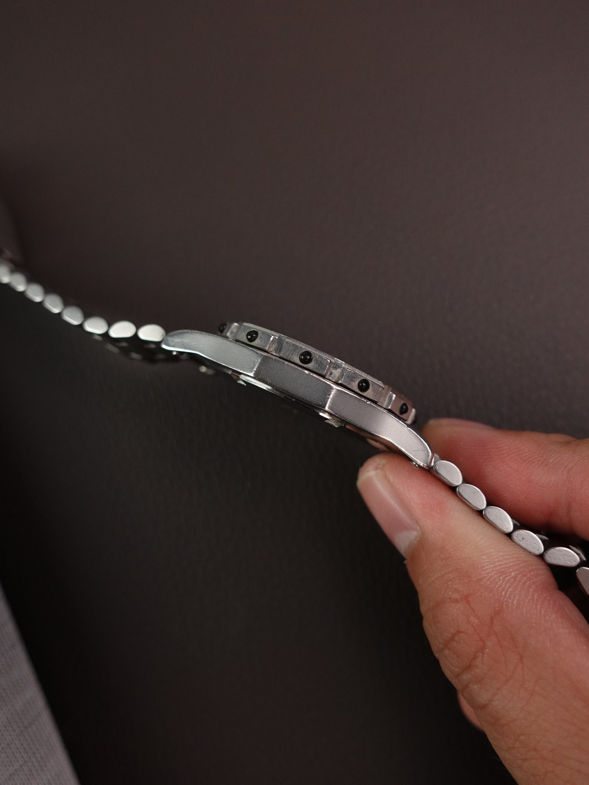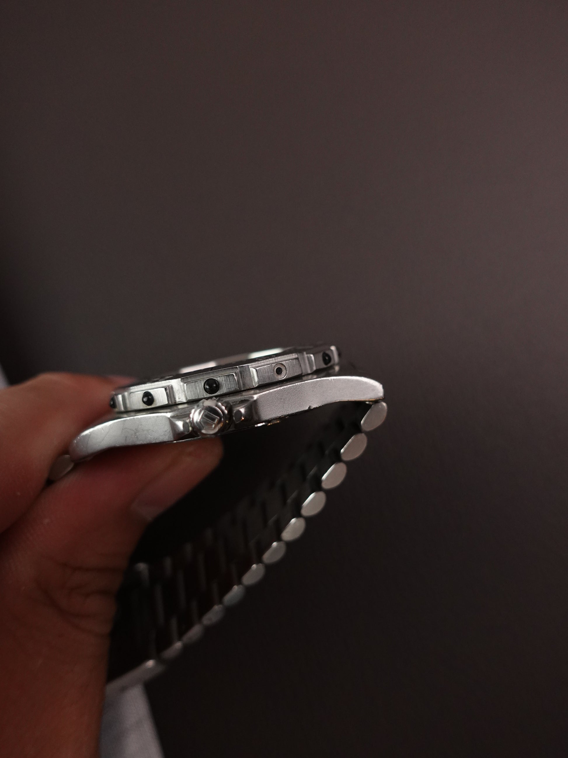 This variation is the Large-SIZE variation, hence at a diameter of 39mm. watch is worn as seen from all the scratches on the bezel. please take note that bezel DOES NOT click and spins bi-directional. One of the bezel dots is missing (as shown in photo). Can be fixed with a new steel wire but i have not done it as i do not have the machinery to fabricate it. Max wrist at 18cm. o