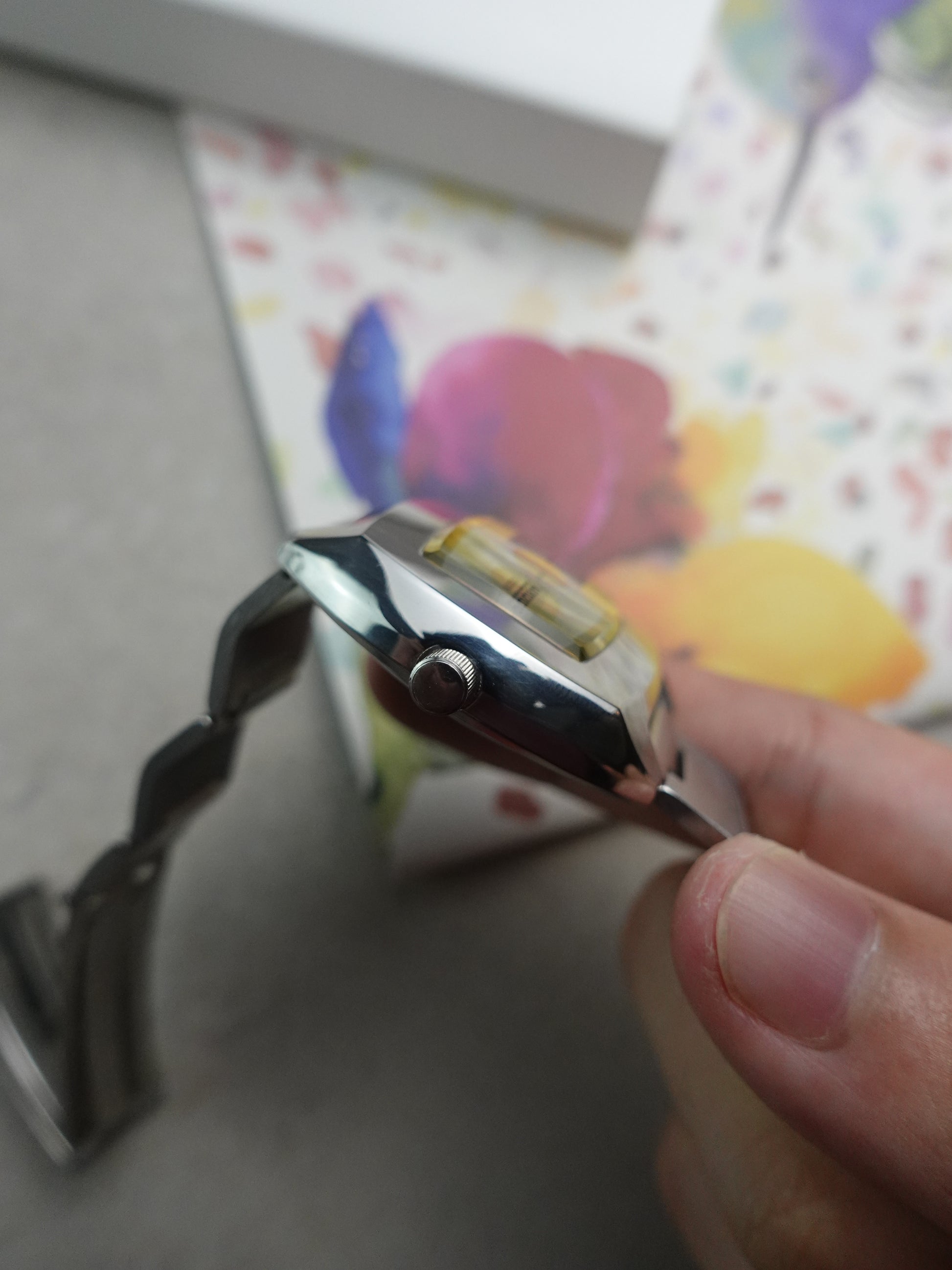 A cool yellow and a super funky angled bracelet design! extremely pristine with very like hairline scratch on the case.