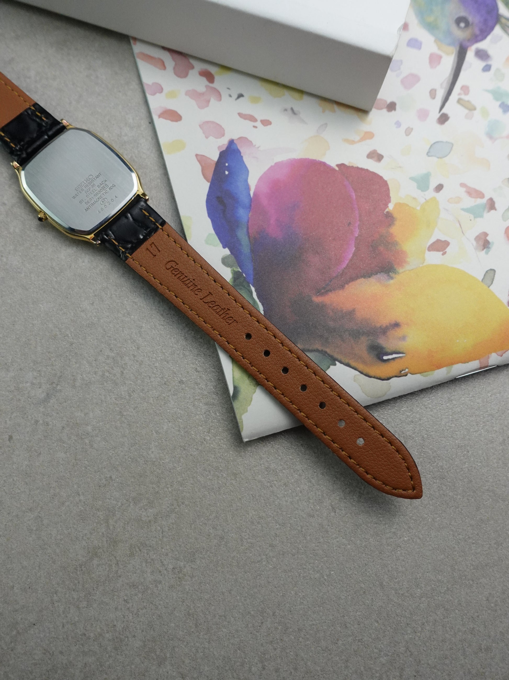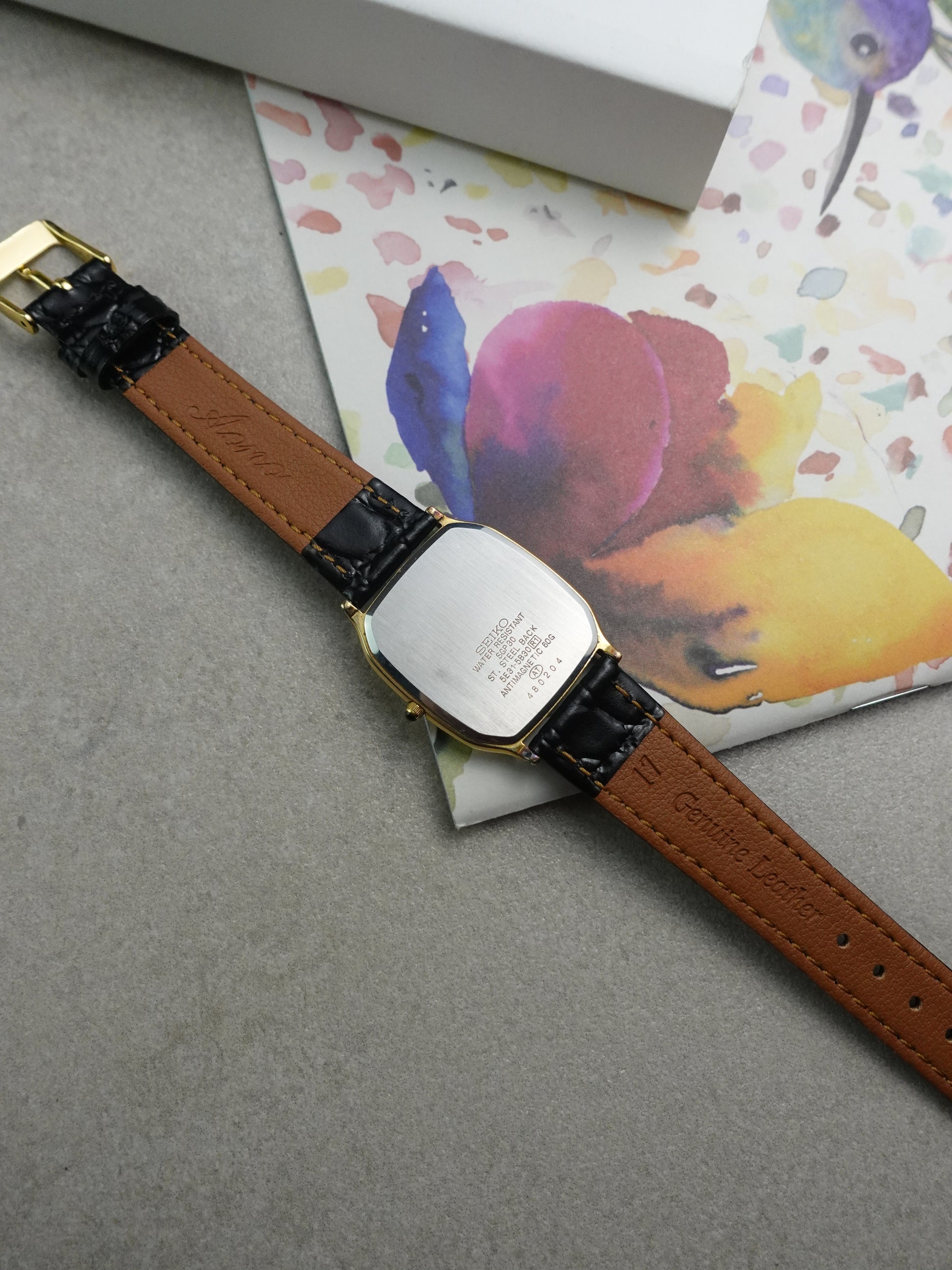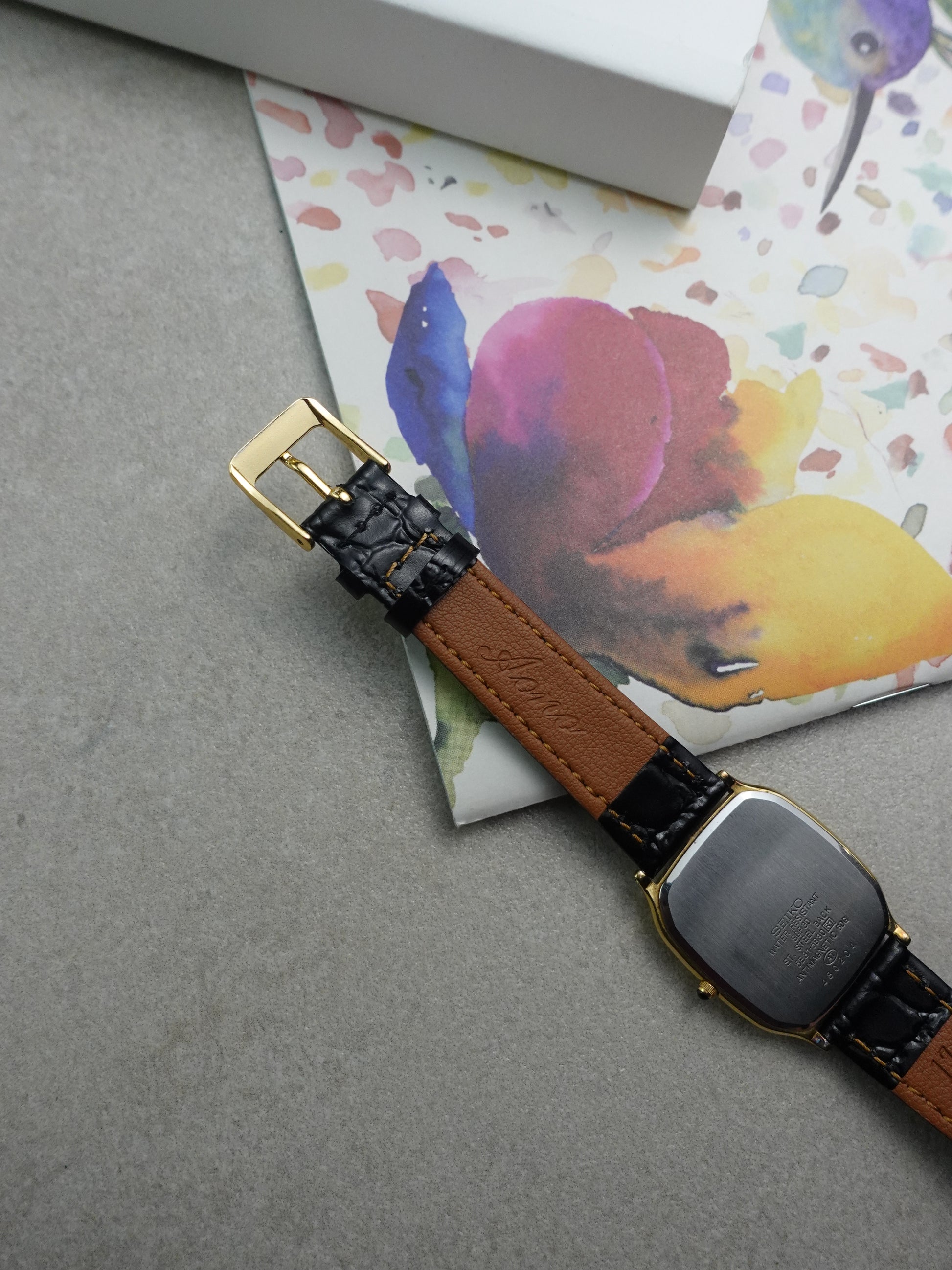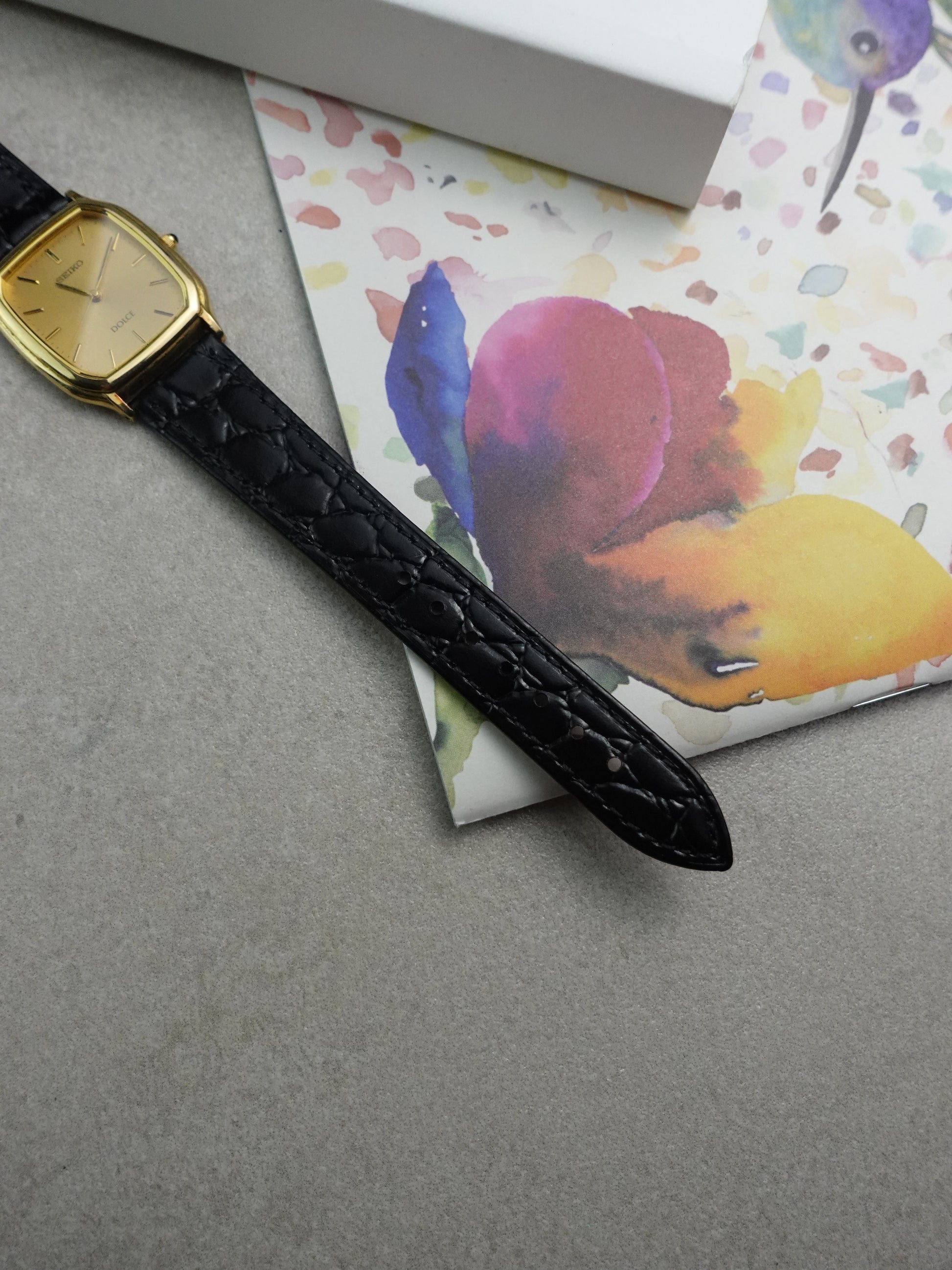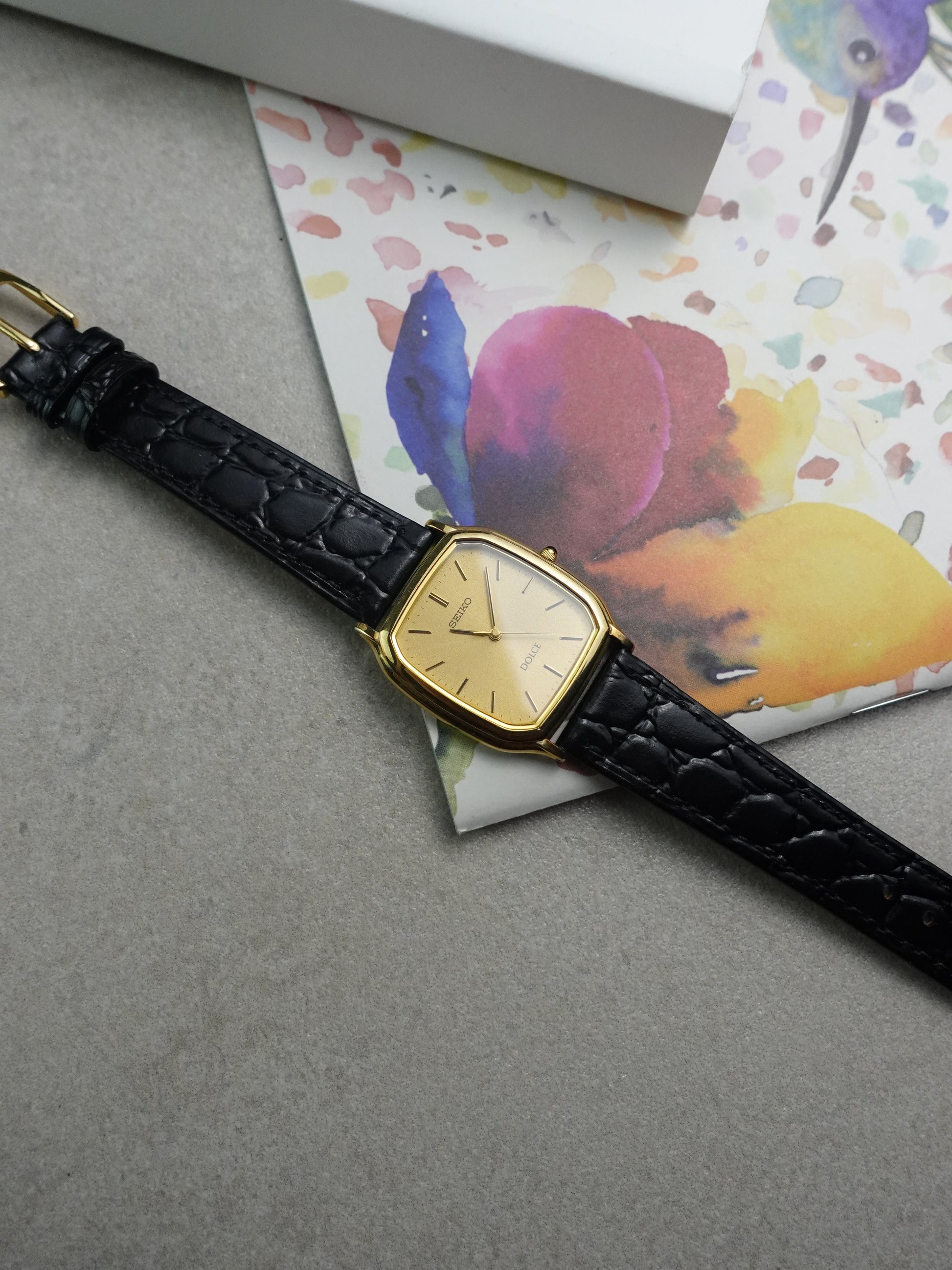 one of my favourite dolce shapes, slightly softer n the corners, with a bezel like design, very different to the typical angular design dolce. 90s piece as it is stamped DOLCE in capital. overall condition of the watch is great, the watch is perfect in timekeeping.