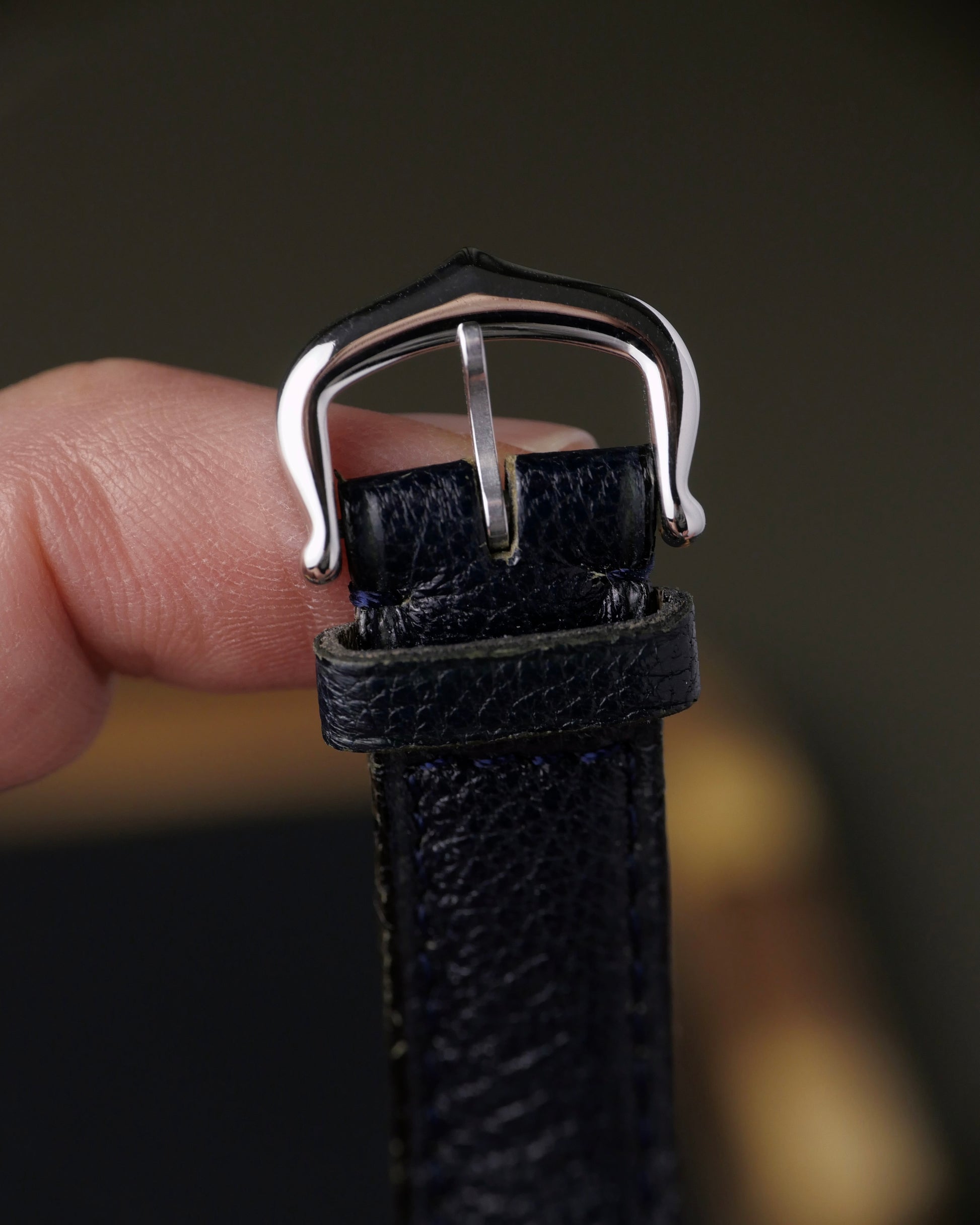 Original Cartier dark navy leather (used), original Cartier pin buckle (14mm)