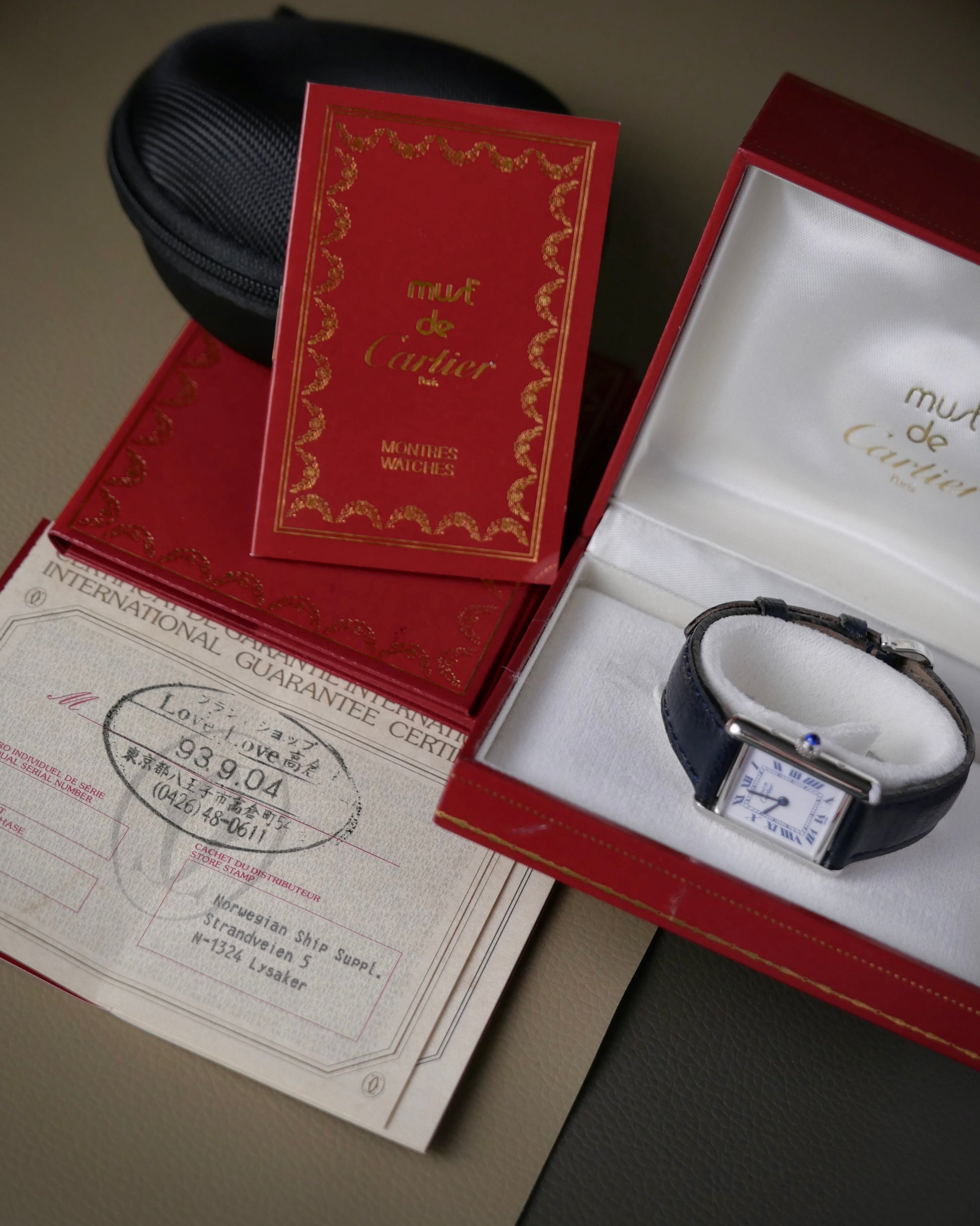 Watch, original Cartier strap with original Cartier buckle, full set Cartier box, document folder, literature, warranty certificate
