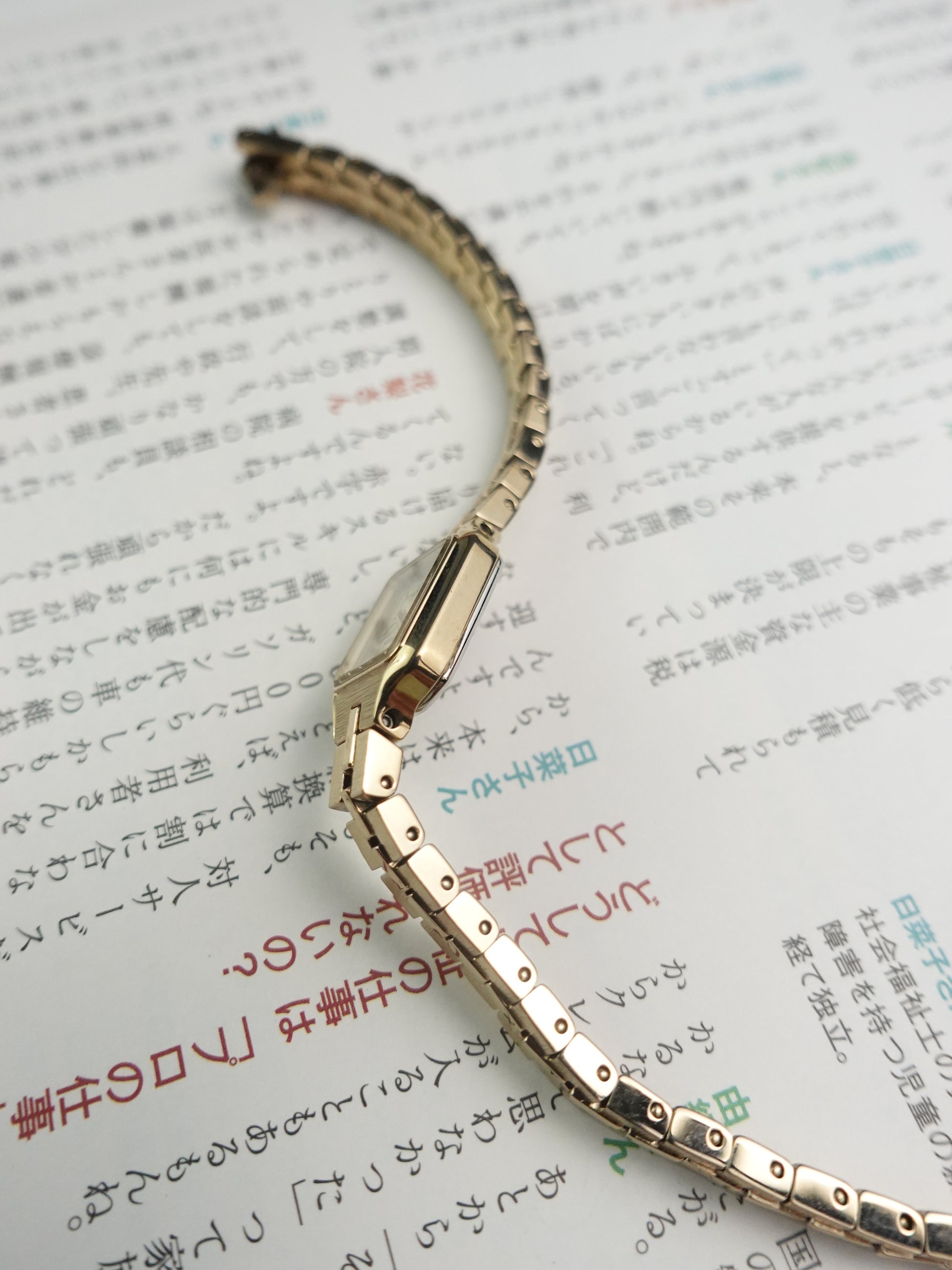 a very chiq, mini, citizen tank with integrated bracelet. unique guilloche dial which is one of my favourite! extremely detail and well made. bracelet has a textured like effect to it.