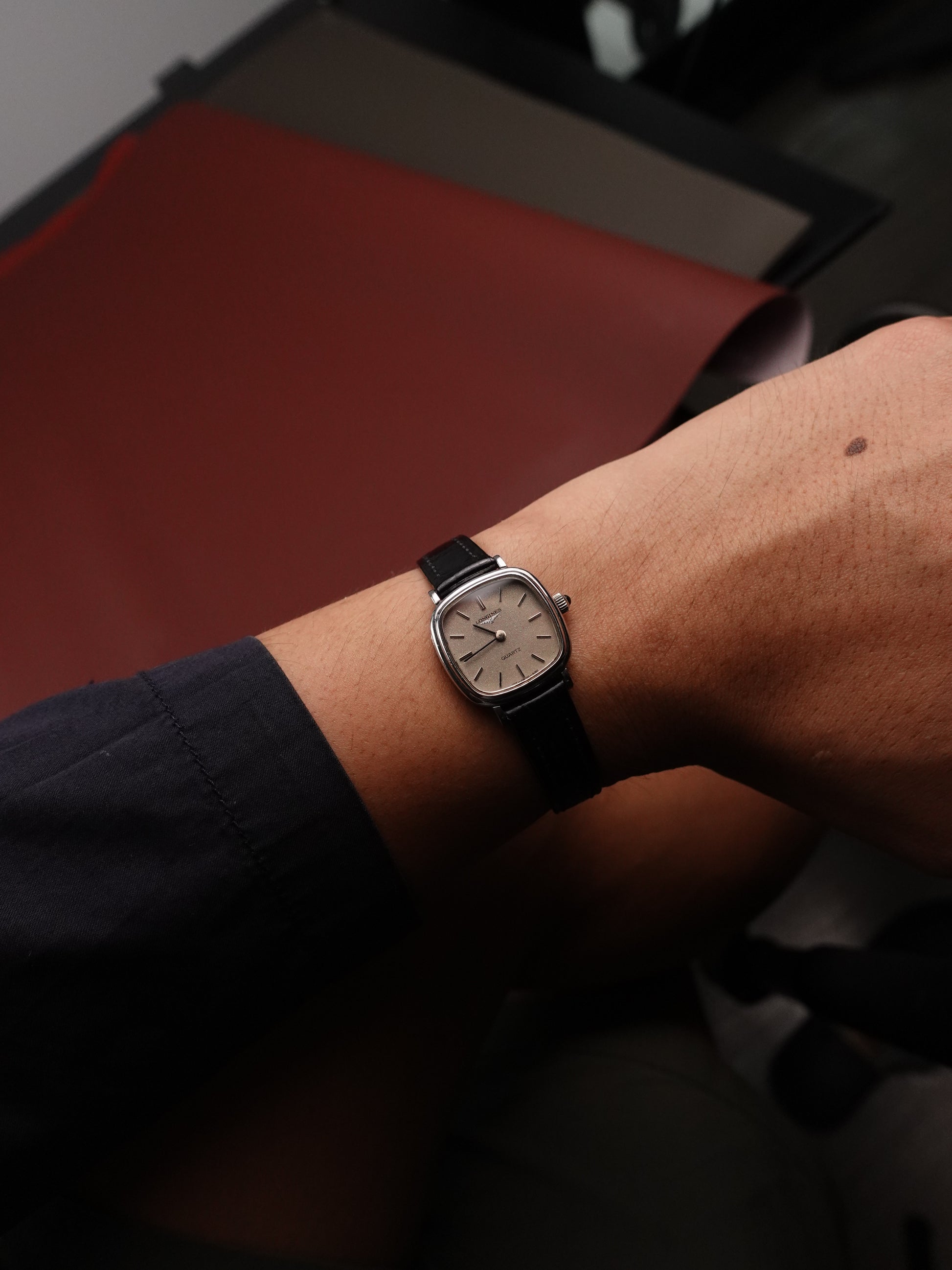 I always have a deep appreciation for Longines, and especially the 80s series of Longines, in which they had the highest curiosity in dial and case design. A Cushion case ladies longines as with this example, complimented by a grey satin like dial. Comes on a new strap and its original longines buckle as shown.