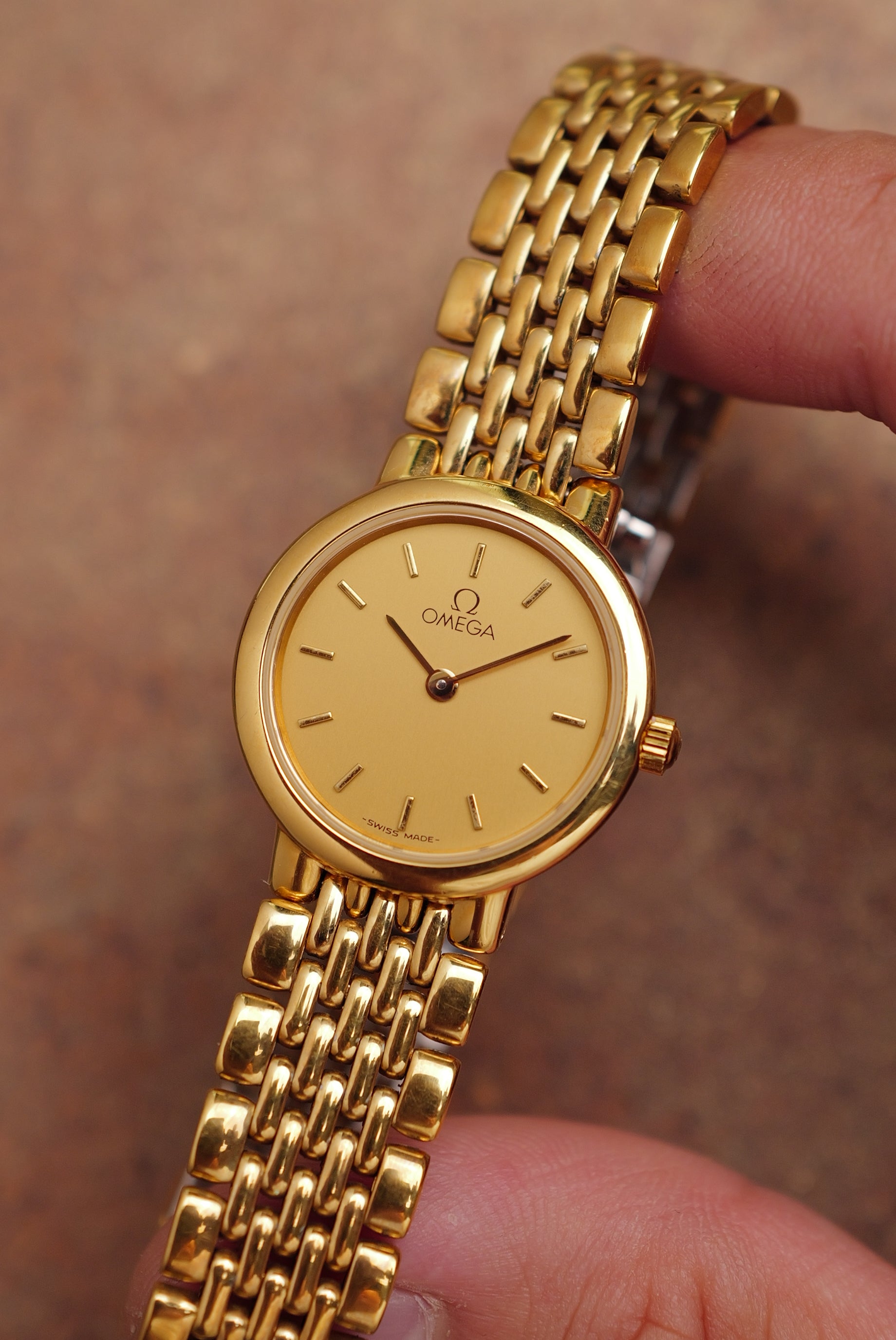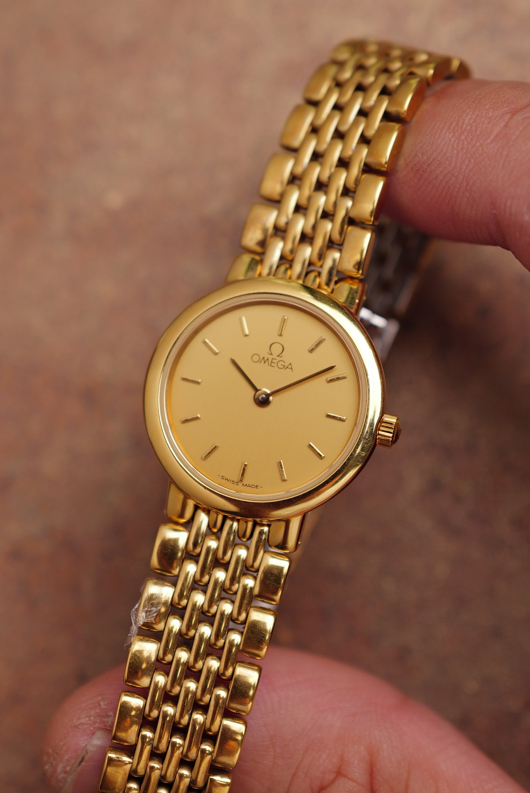 | Watch Summary | My love for circular watches continues with this multi-link omega ladies de-ville. A Circular polished gold-tone case with a flat crystal. The dial is a solid matte gold with short baton indices and pencil-style hands. comes with a bracelet size of 15.5cm |