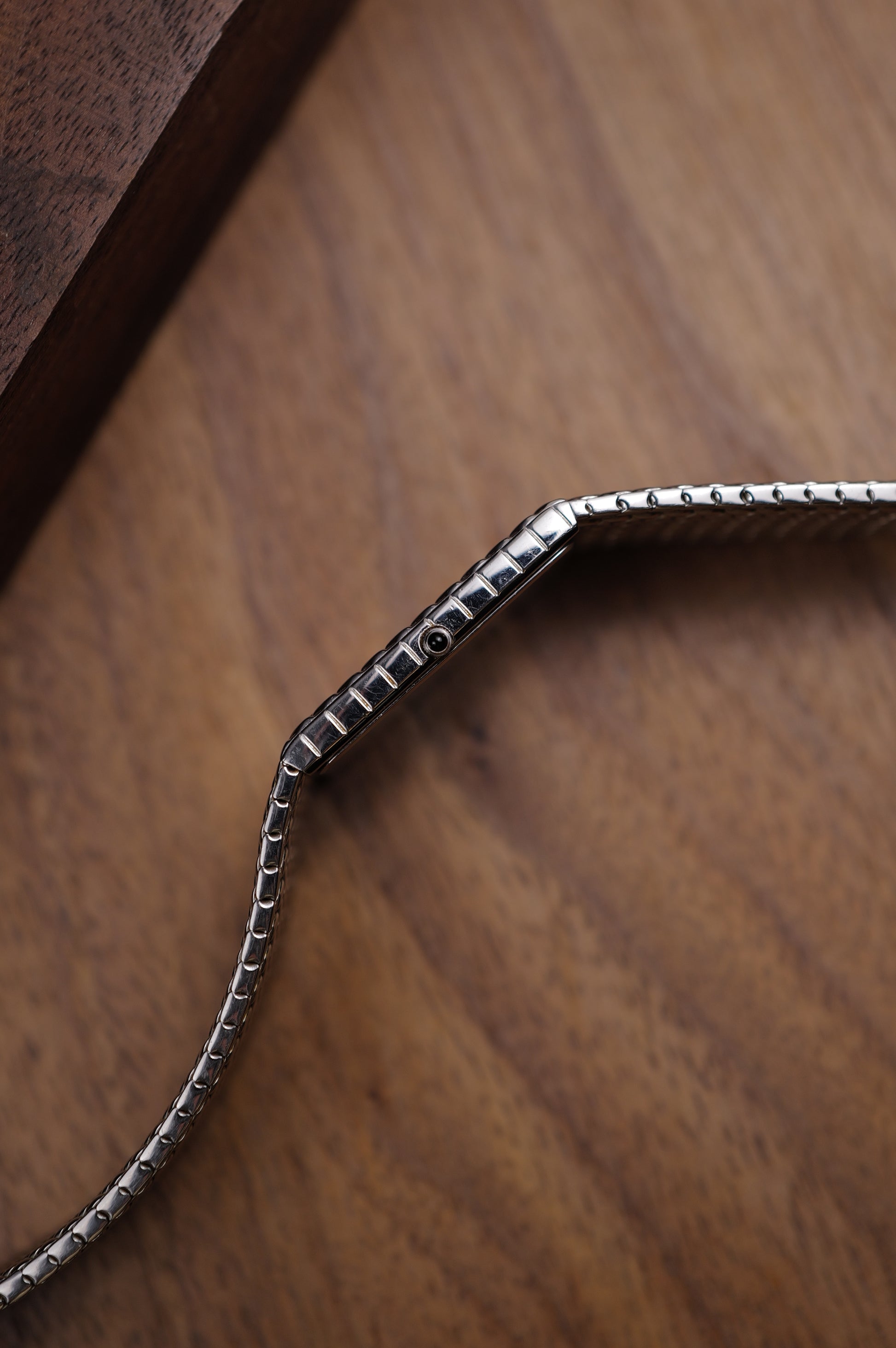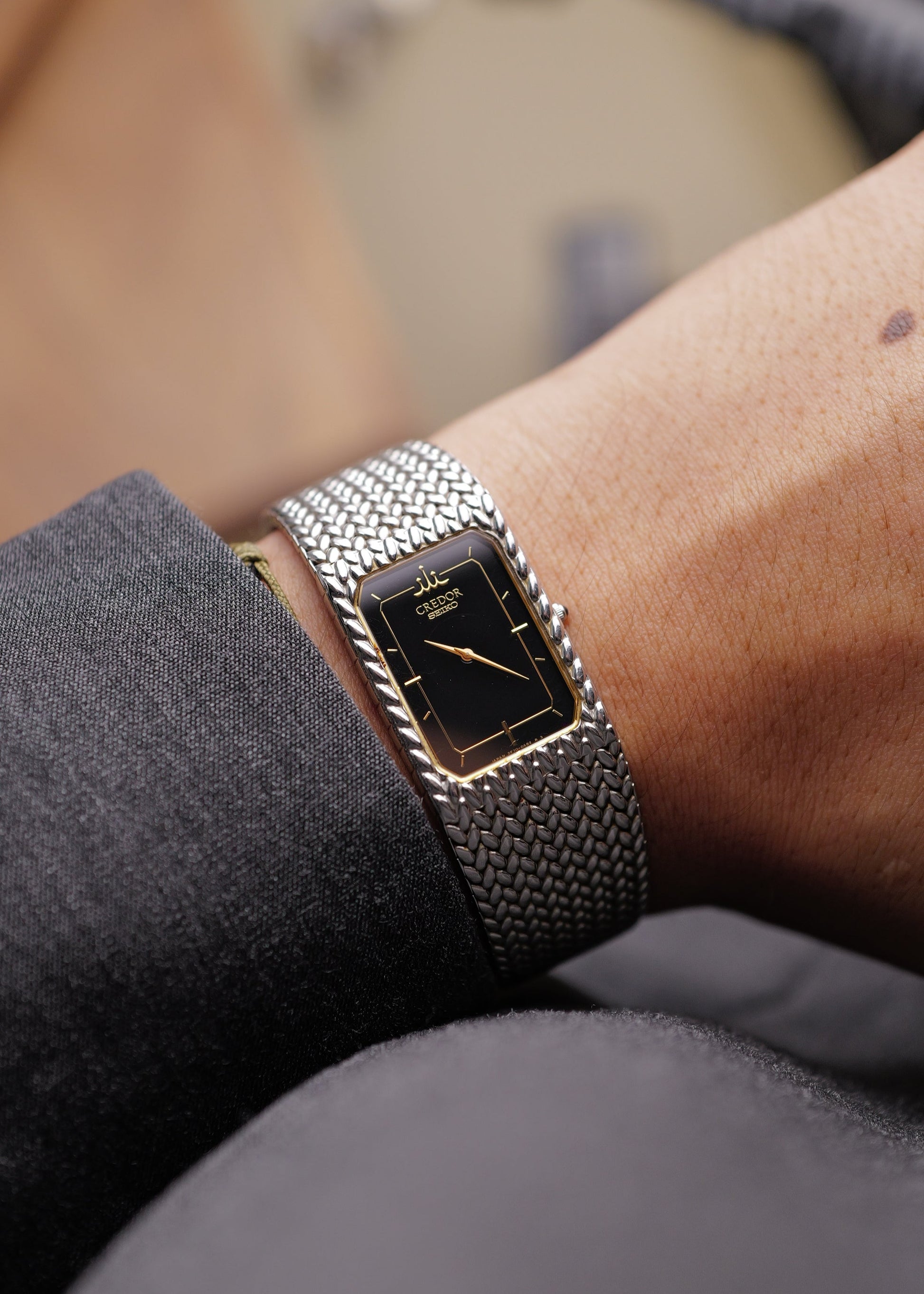 The Credor 2F70-5330 is a vintage quartz dress watch that beautifully demonstrates this philosophy. It features a rectangular steel case with the design of its original integrated steel bracelet, providing a seamless flow from case to bracelet .The dial is a smooth black tone with a matte finish, offering quiet contrast against the gold toned stick indices and slim hands.