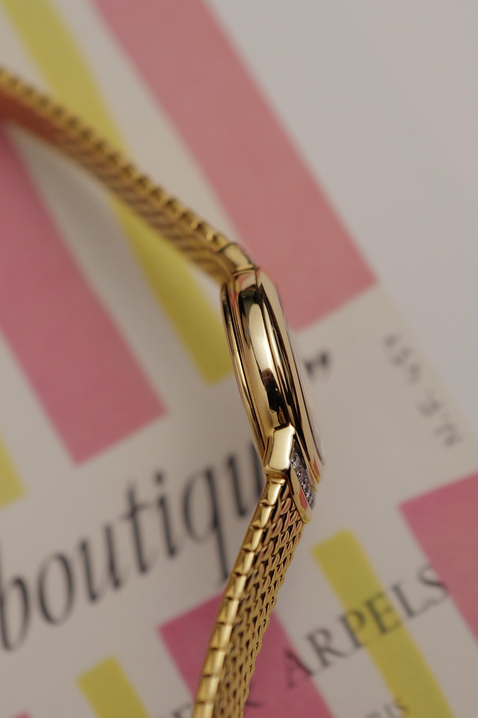 | Watch Summary | one of the rarest exceline model in existence and a first time curation in our store. A quick search and this model isnt available at all (as of my current listing). A subtle mother of pearl dial with simple baton markers and breguet 6 and 12. 14 original diamonds encrusted on the top and bottom bezel. Comes with a cut to size bracelet (please dm if you need it to be shorten) currently sized at CM. |