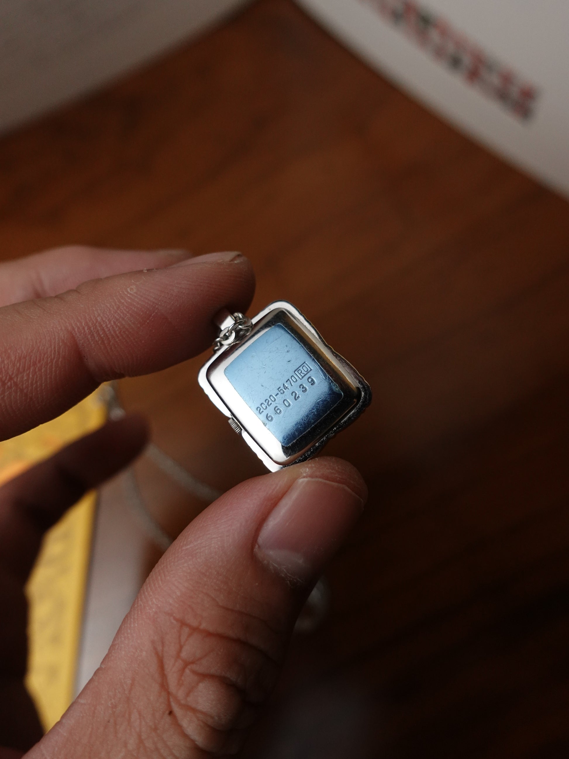 A rectangle pendent with "candy" case design. a beautiful quartz piece with gold-inlay design around the cotton candy-esque design. Original Caseback stick still attached
