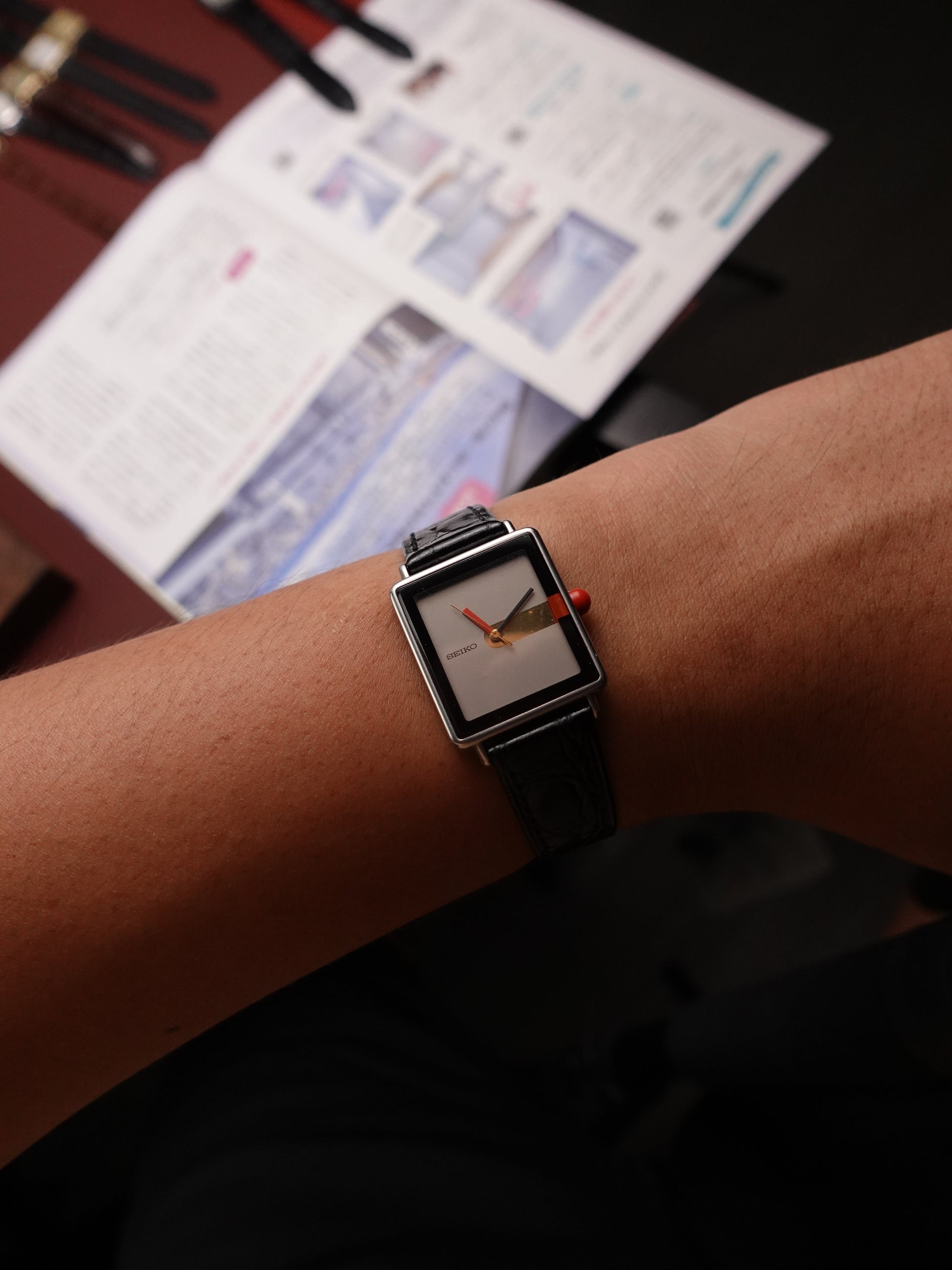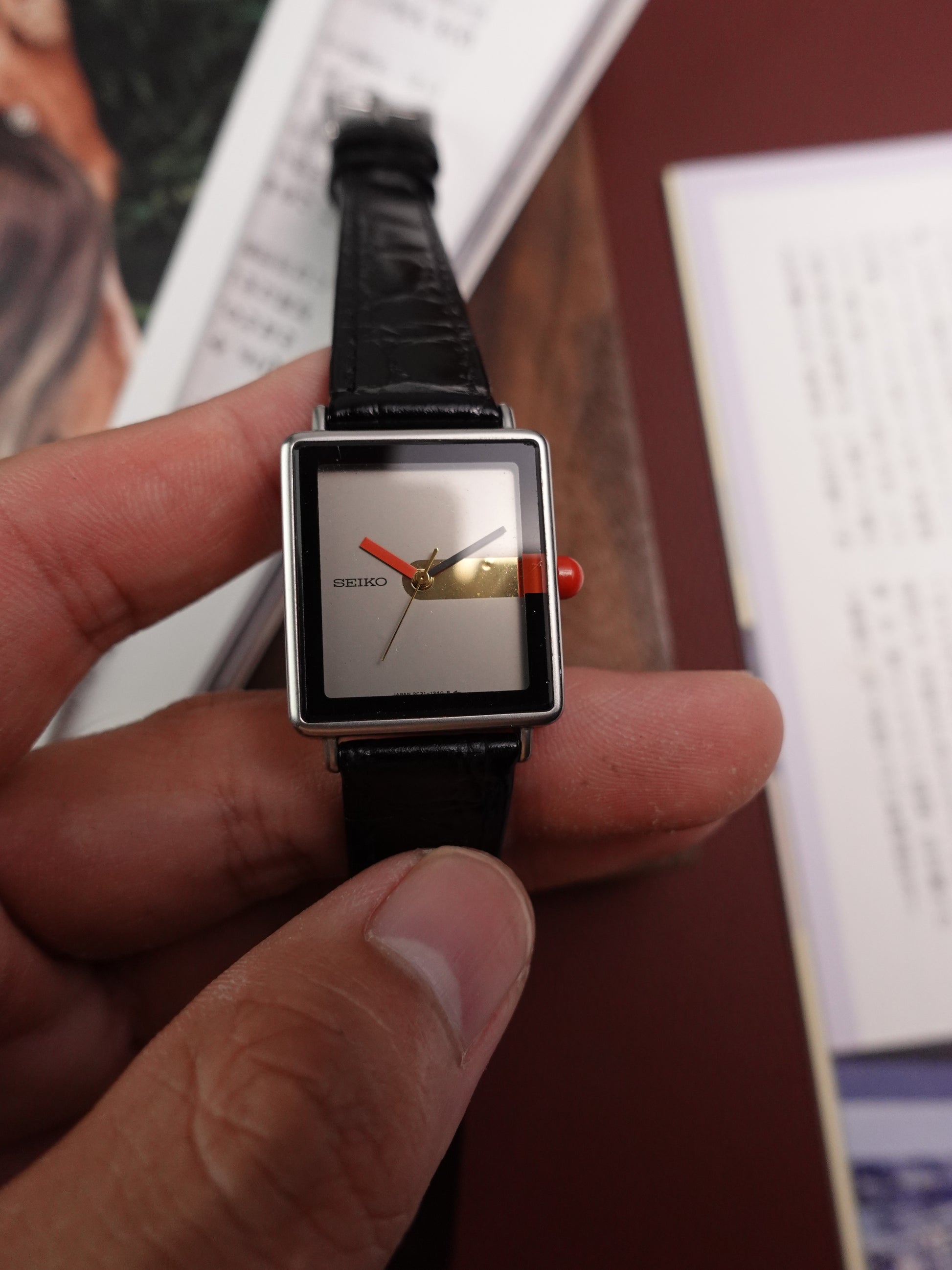 During the 80s, Seiko had a very innovative period of dial and case design, and one of the whackiest ones i've seen are these art deco designs! A red-nose like crown, a modern art-ish hand design, and a very abstractive square case design.|
