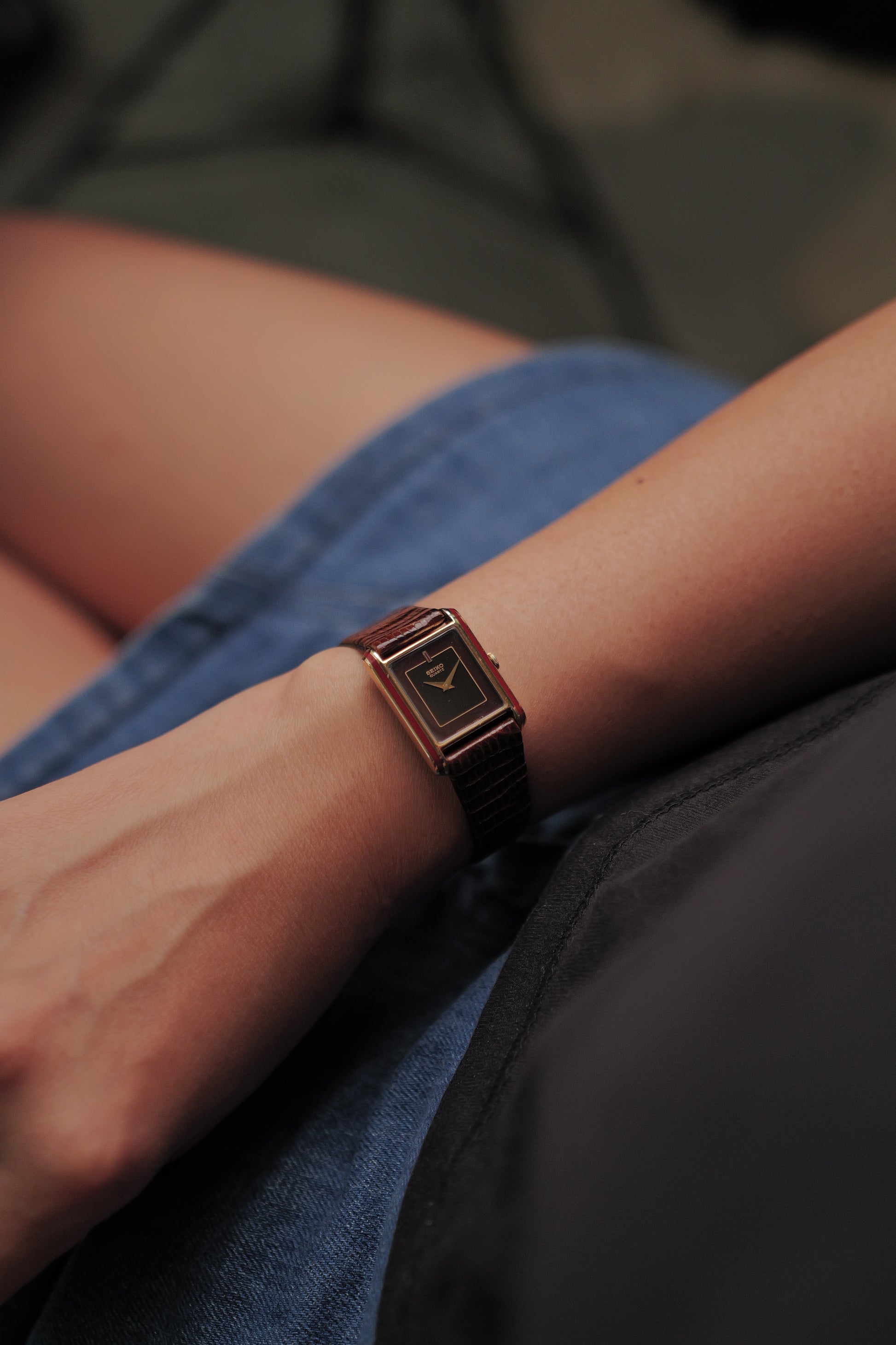 | Watch Summary | A very cool seiko tank with some lacquer accsent around the case and on the dial. One of the rarer variation seiko tanks in the market. Comes with a 2-tone sector design on the dial as well. Comes attached with an aftermarket strap and gold buckle. |
