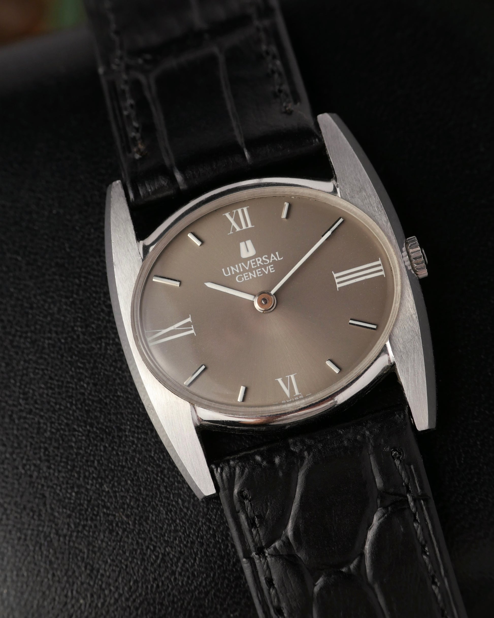 Followers will know our soft spot for vintage UG. Once a high-end brand, crushed by the quartz era, but recently acquired by Breitling and on the verge of resurrection. Beyond collector favourites like Polerouters/Tri-Compax are myriad time-only pieces to be discovered at amazing value. Like this “batwing” with its horizontally-biased oval case, broad lugs, faceted sides and taupe dial. We love the clever compressed/elongated printed romans at 12, 3, 6, 9 with similarly shortened/lengthened applied indices to achieve balance against an audaciously shaped backdrop. So seldom-seen, you’ll be assured of never meeting someone else with the same watch anywhere. In great wabi-sabi original condition!