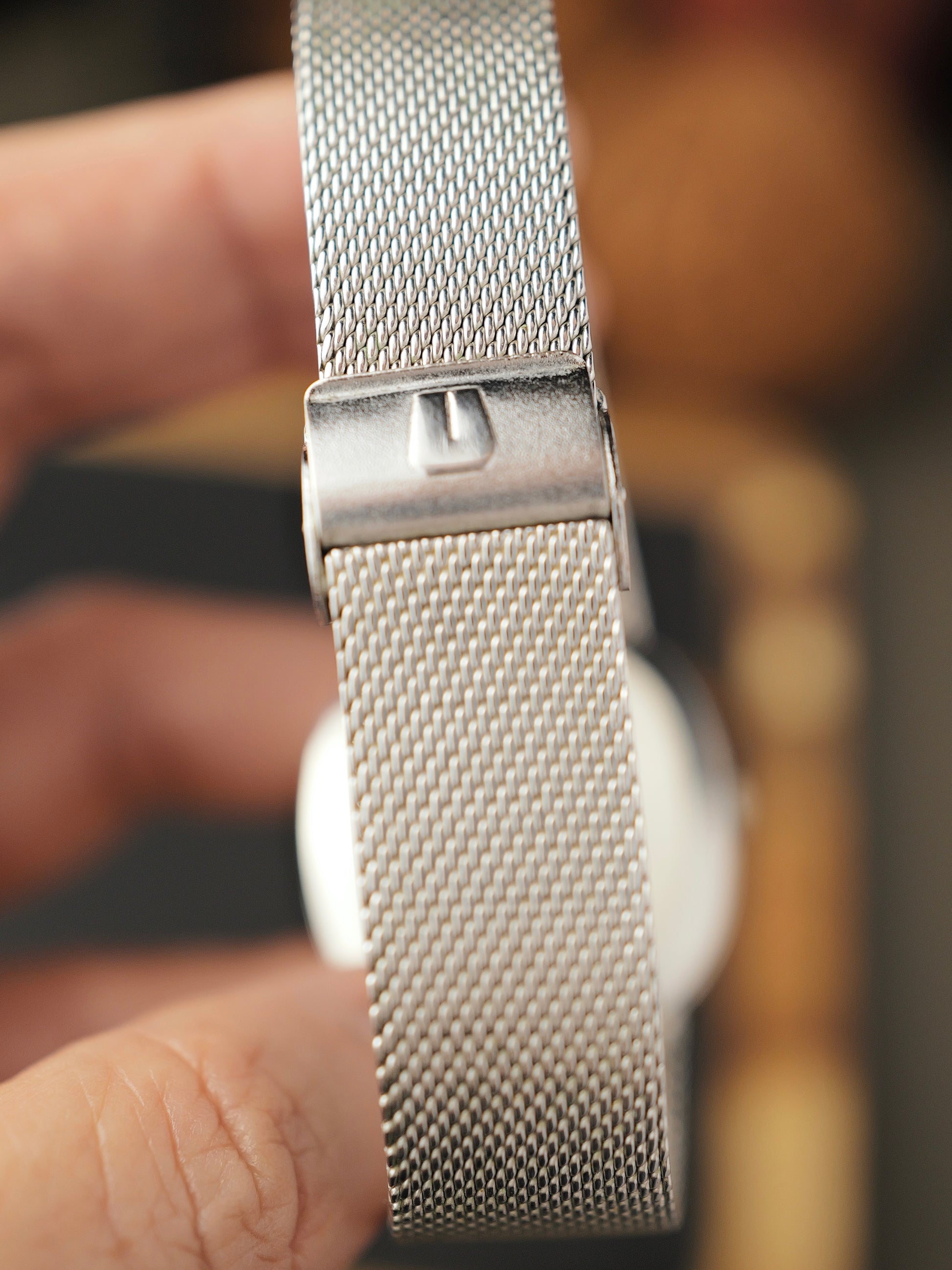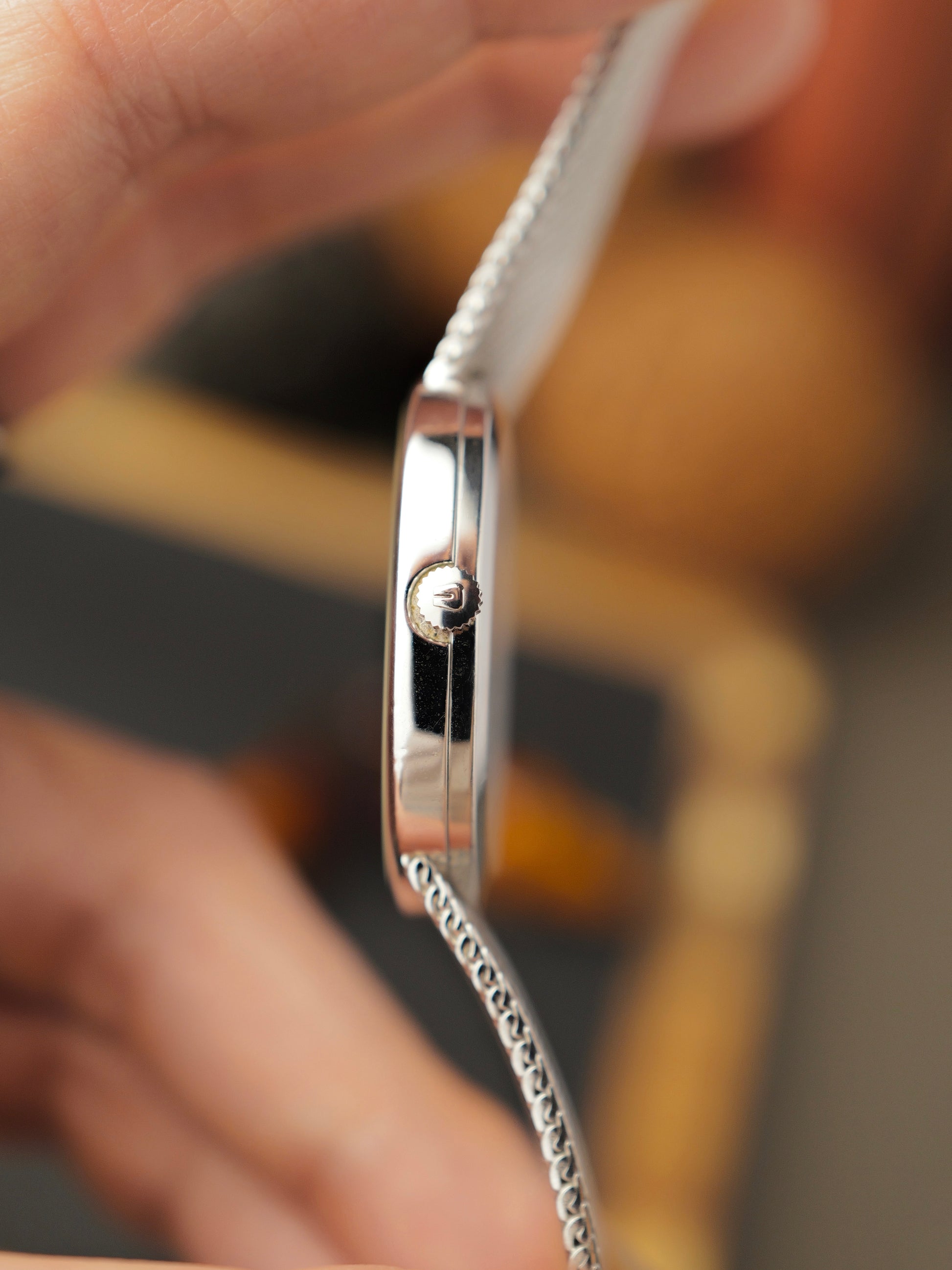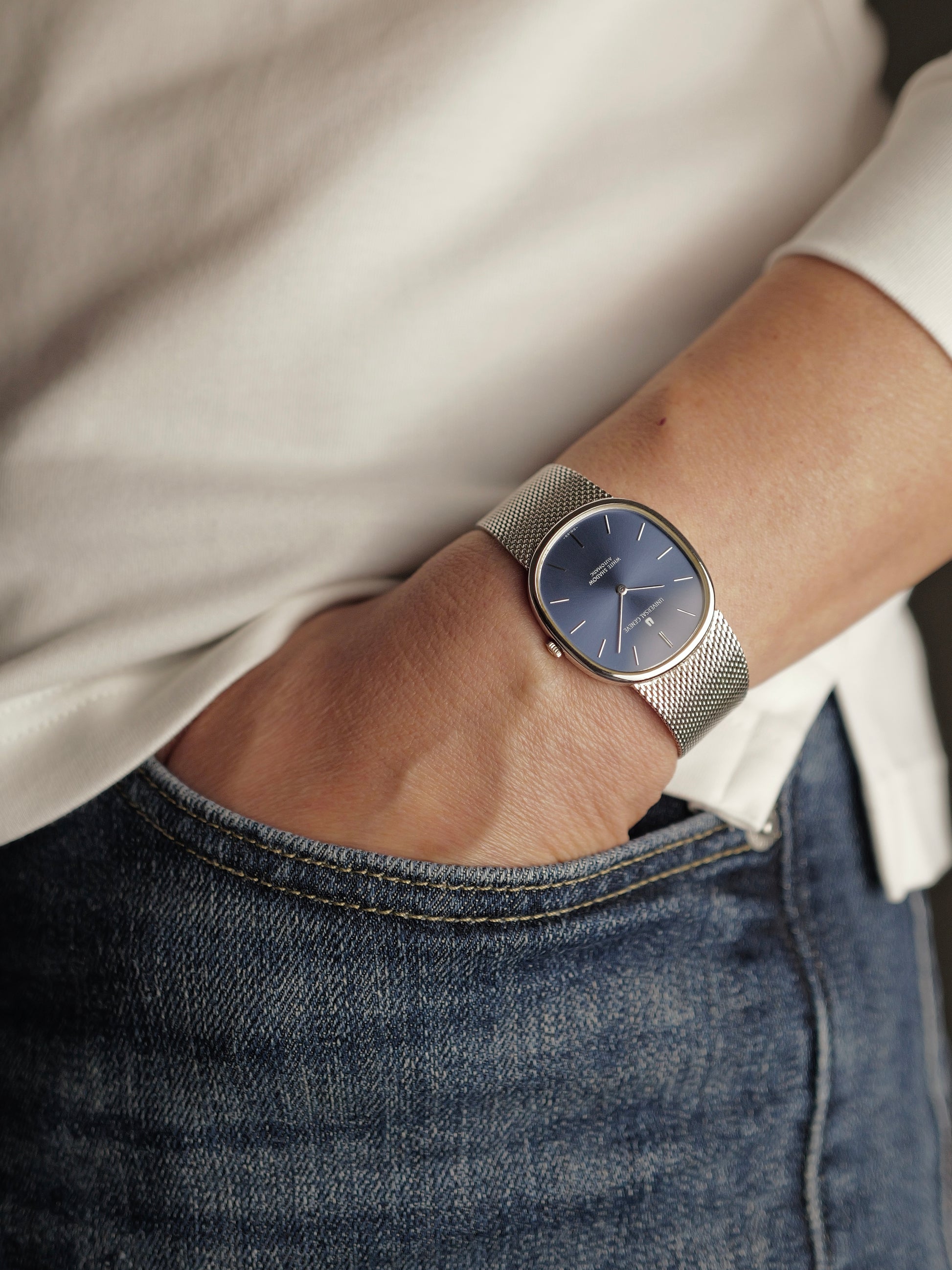 NOT a rip-off of Patek’s Ellipse, but more the other way around! You might know our love for vintage UG. Once a high-end brand, decimated by quartz, but poised for revival under new Breitling ownership. Beyond the usual UG suspects, this White Shadow is UG’s true unsung hero. It’s been said that Gerald Genta designed Patek’s 1968 Ellipse. But in fact, Genta himself confirmed that to be false, crediting Jean-Daniel Rubeli (who also penned a similar shape for AP). The Patek was inspired by this watch right here, launched in 1966, and actually designed by Genta! With the beautiful legendary UG microrotor Calibre 2-66, the world’s thinnest automatic at the time (Patek’s 1968 Ellipse was manual, but followed 9 years later with a microrotor Cal 240 on a somewhat “familiar” architecture). A fantastic specimen with the coveted blue dial, zero brown/orange patches/worms/filigree patina and with the less common two-line dial. Requires a wrist 15.8cm or larger due to the limited bracelet articulation.