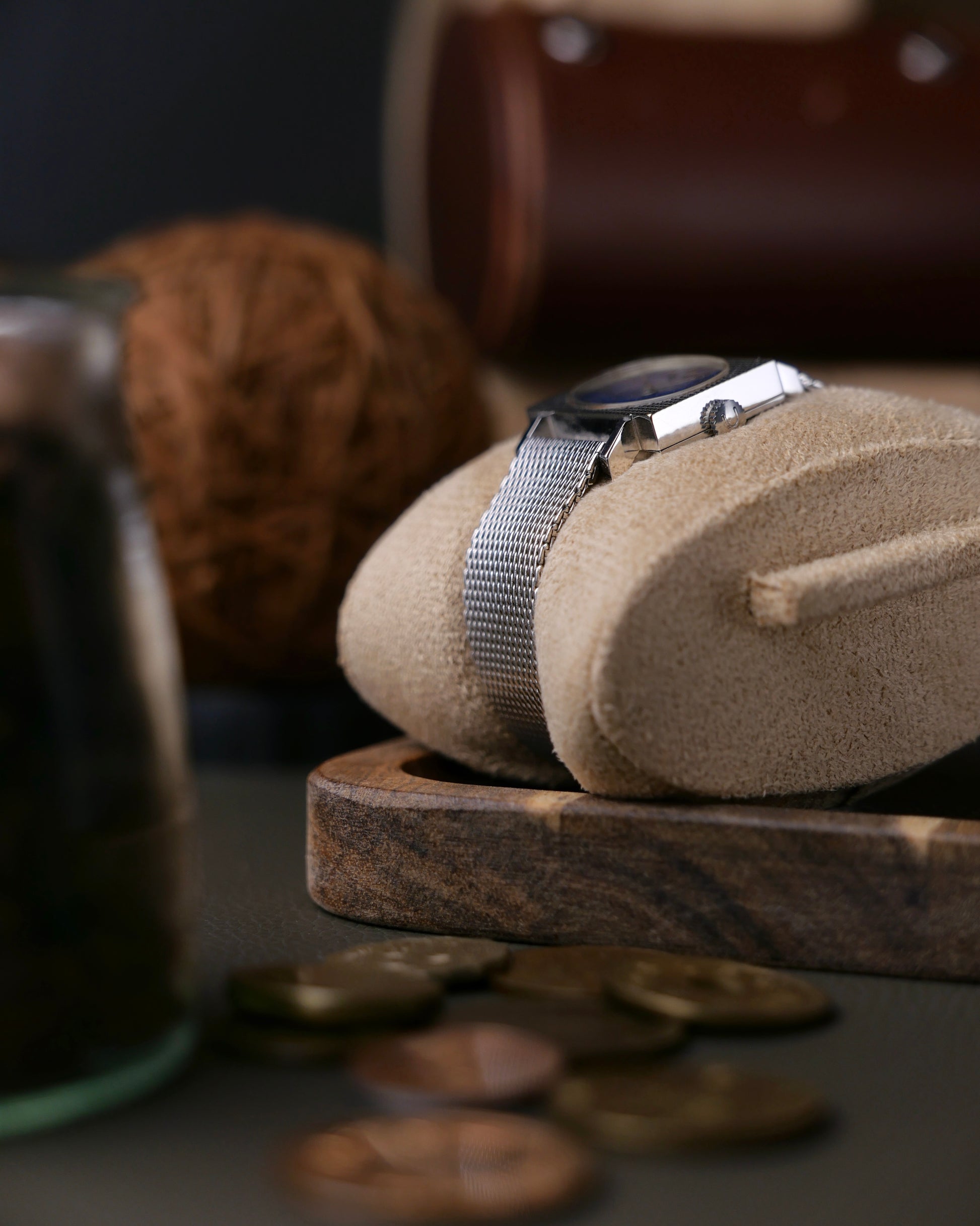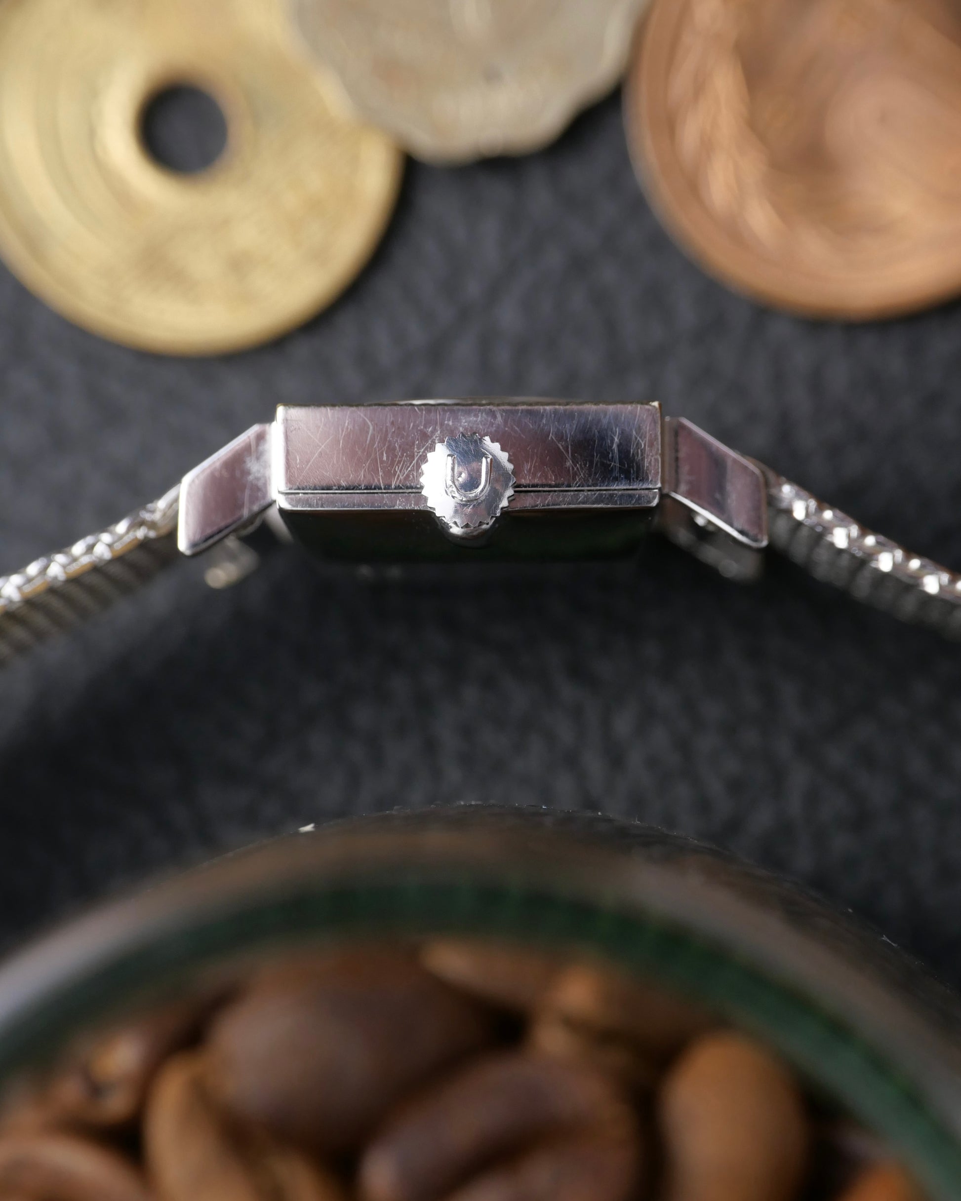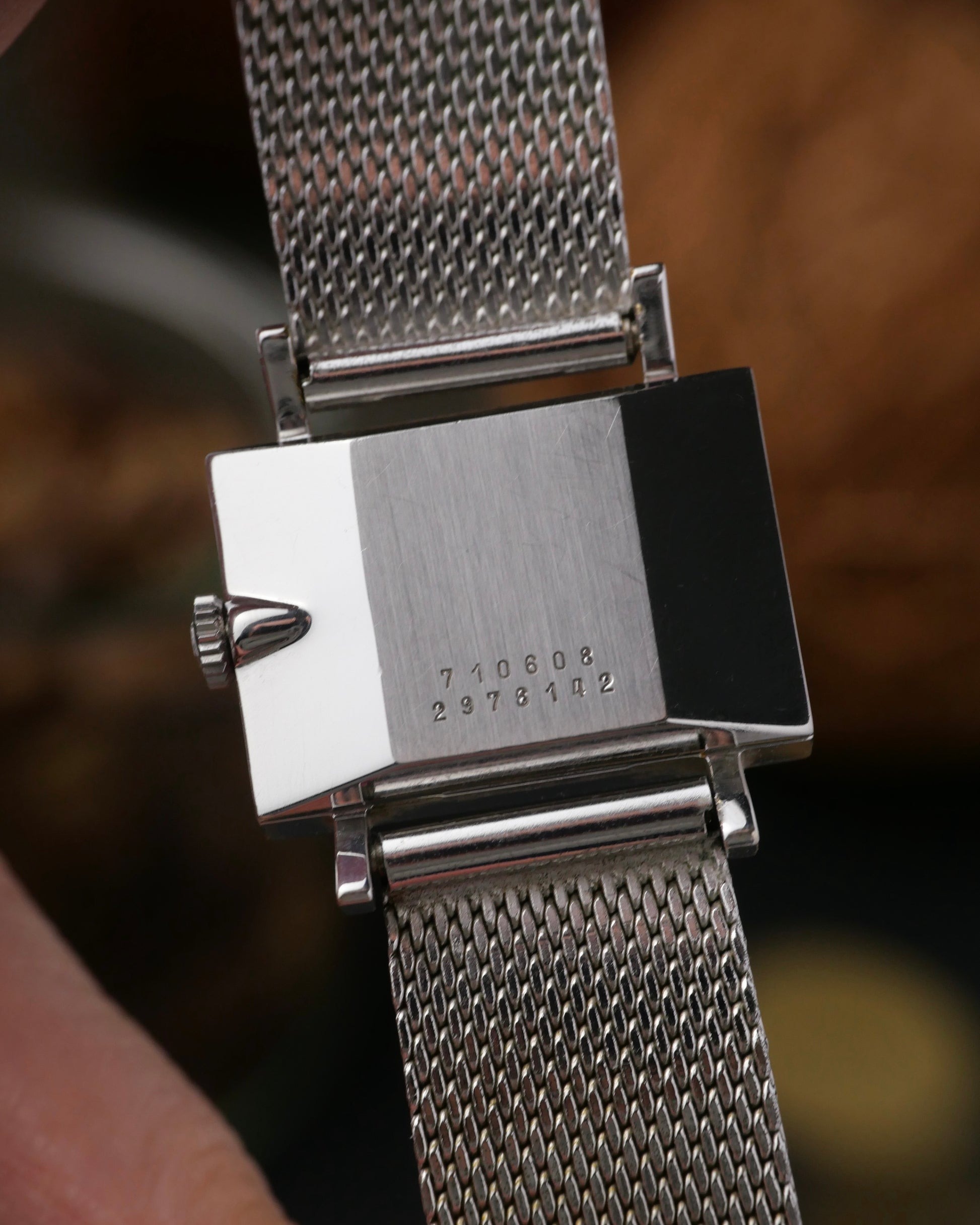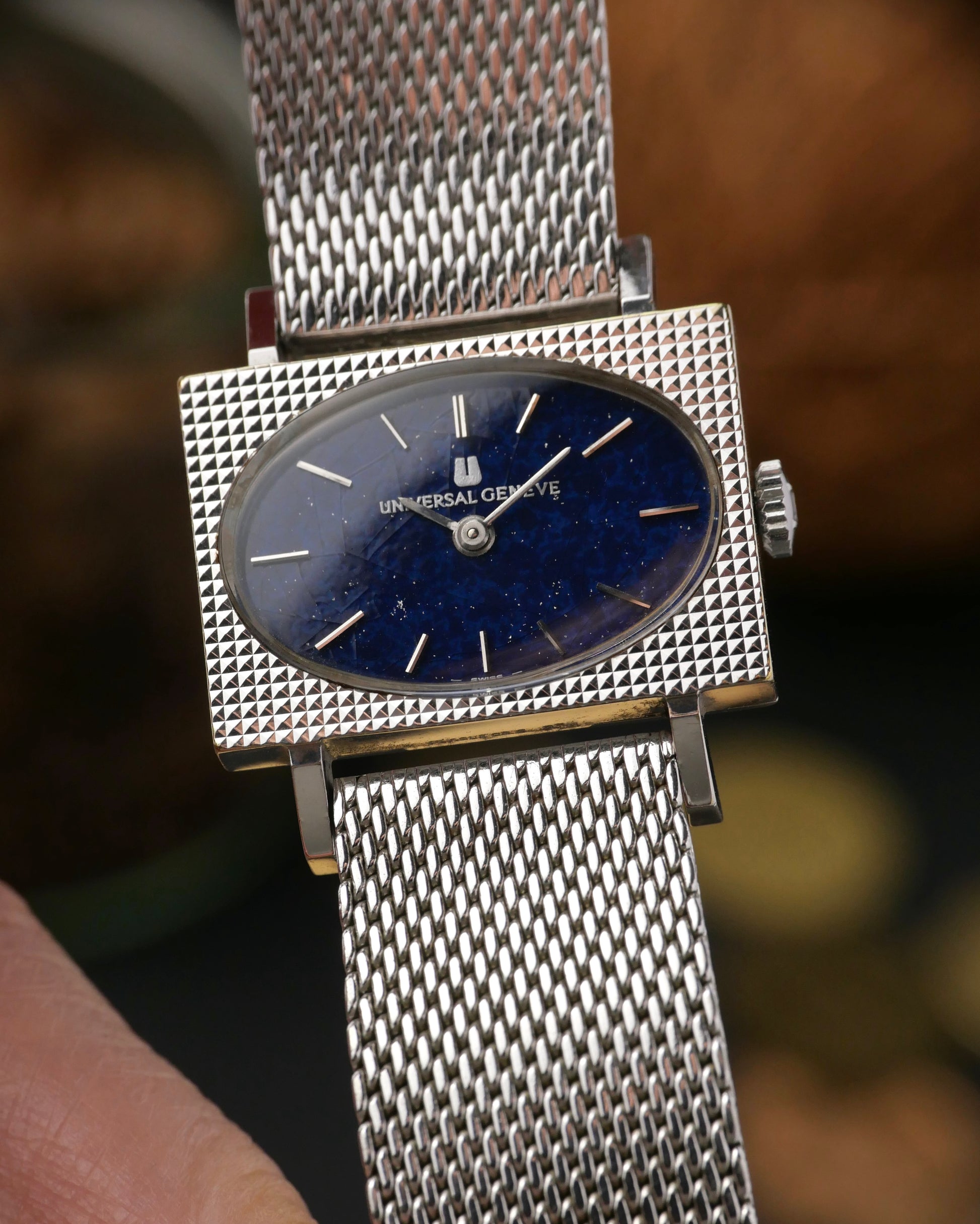 Here’s something you won’t see everyday. A horizontal rectangular “tissue box” UG case with Clous de Paris/hobnob finishing on the top surface. With a mesh bracelet and oval lacquered “lapis lazuli” style dial. Just what you need to stand out if you appreciate something uniquely jewellery-adjacent with full vintage feels. Movement is serviced and warrantied. Followers will know our love for UG. Once a high-end brand, crushed by the quartz era, but on the verge of revival under Breitling. Beyond hyped models like Polerouters/Tri-Compax are dressy treasures like this, waiting to be discovered at amazing value.