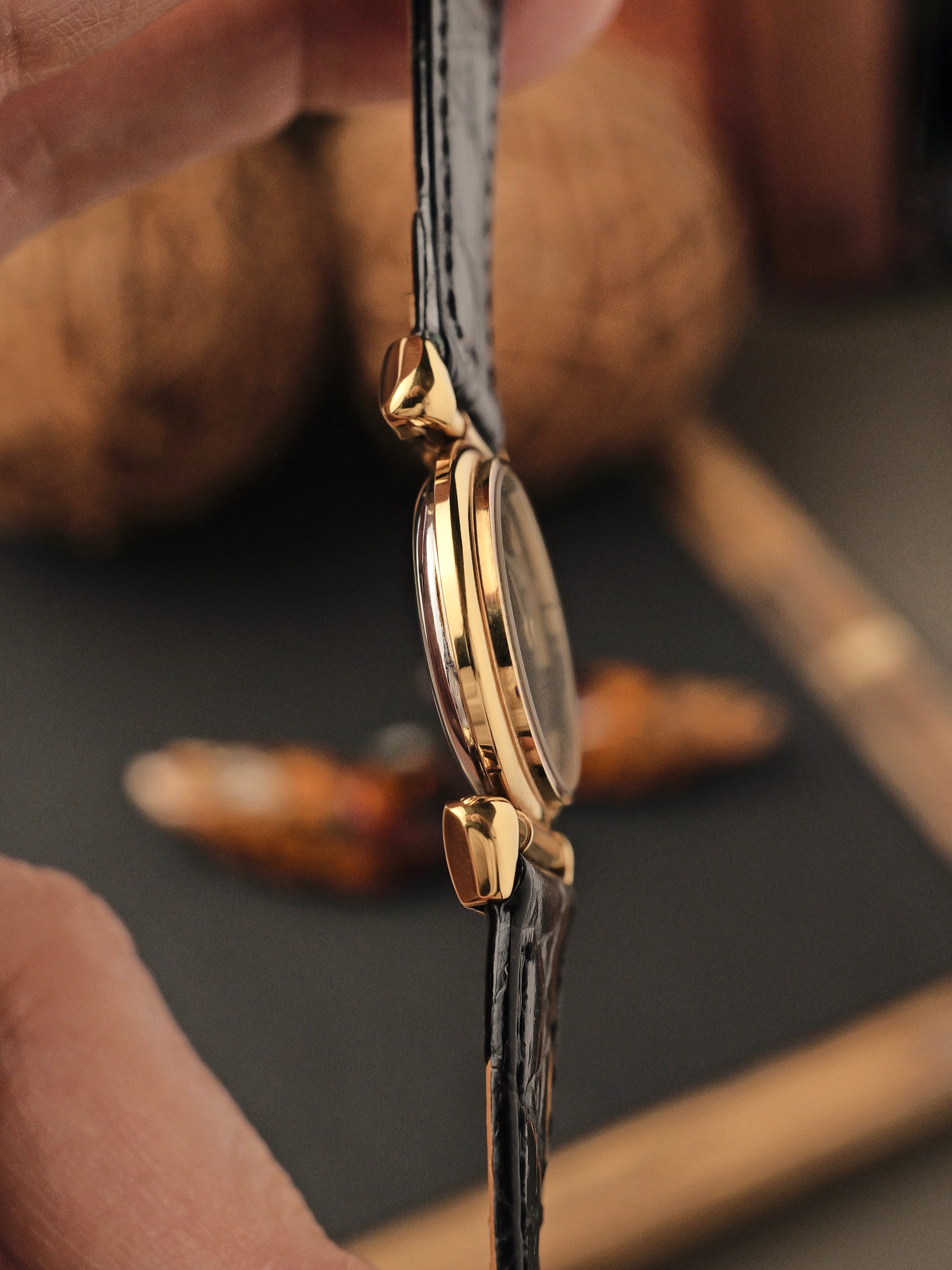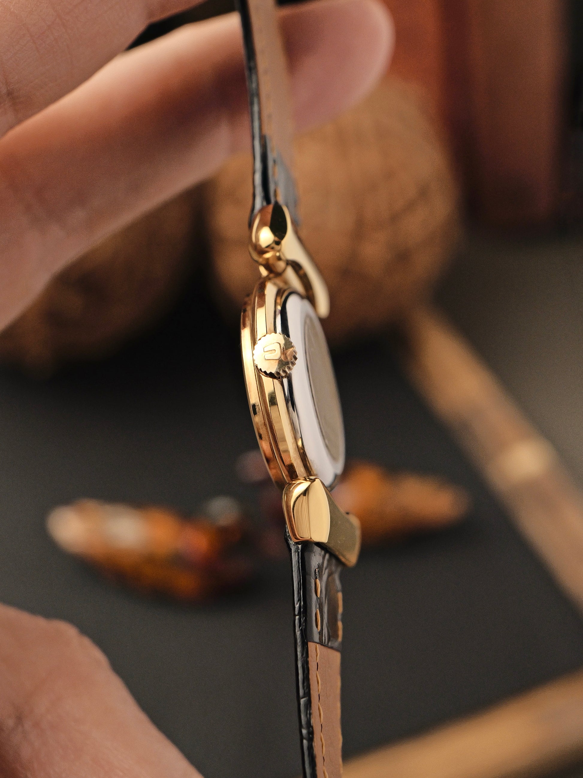 9.5/10 with intact plating showing only mild signs of wear and some very lovely rainbow aging around the bezel. Original signed crown. Caseback sticker still intact. Lacquer dial has the slightest spidering, hands and crystal have microscopic age spots, all visible only under a loupe. Aftermarket handmade strap and buckle are new, but we’re including the (worn) original UG strap and buckle. Movement in excellent condition with to-spec power reserve, negligible beat error and accurate to ±5 secs/day averaged from 6 timegrapher positions.
