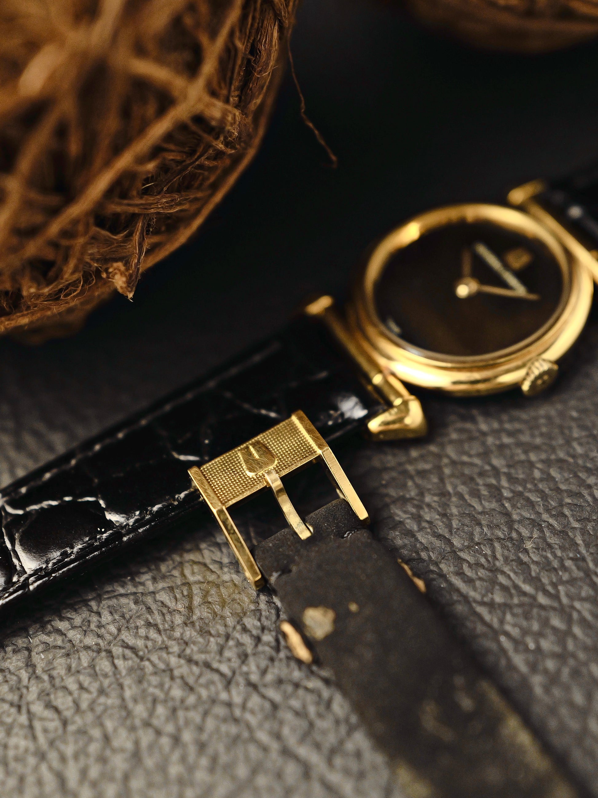 Aftermarket gloss black croc-embossed, aftermarket buckle (12mm), original UG strap and buckle (10mm)