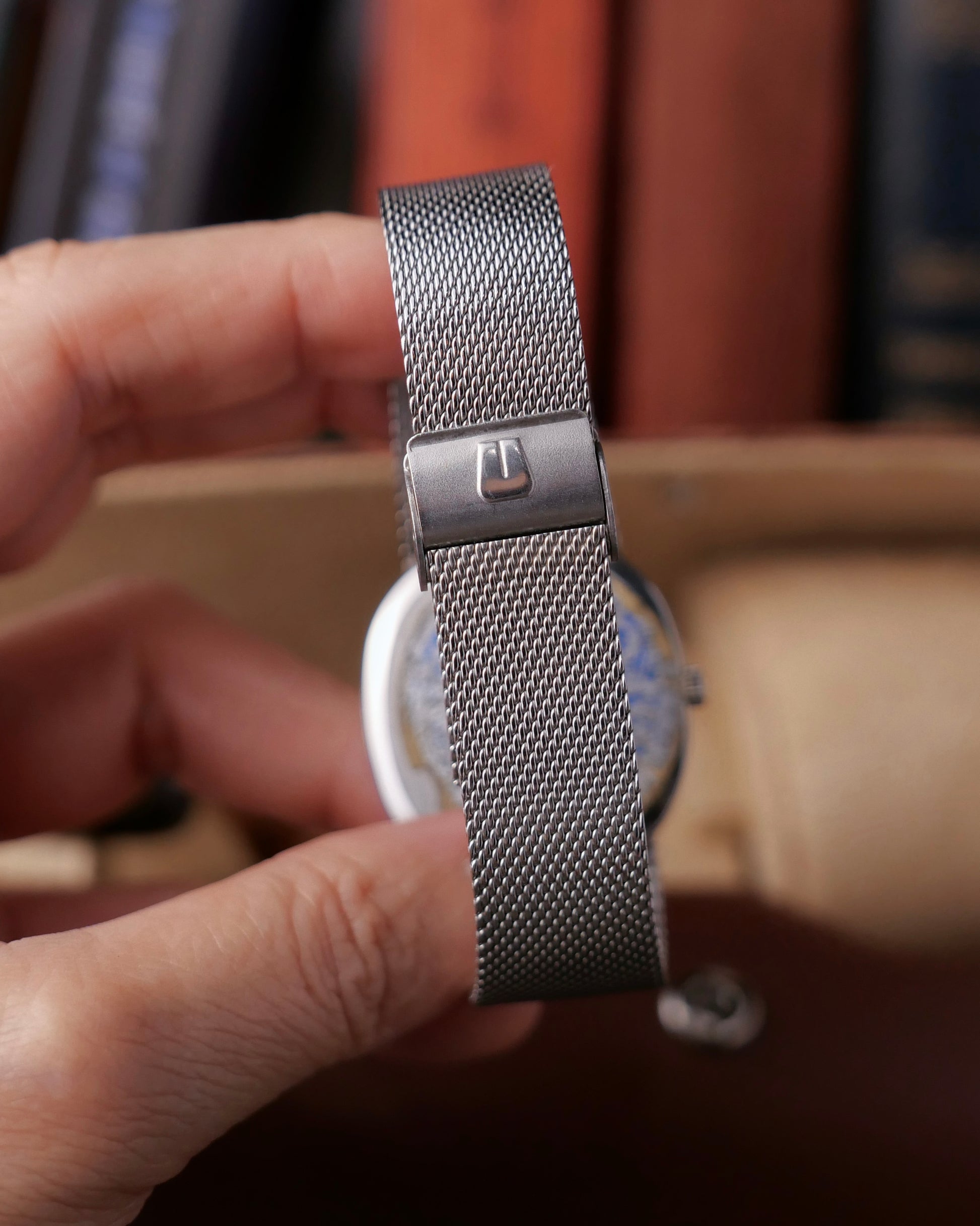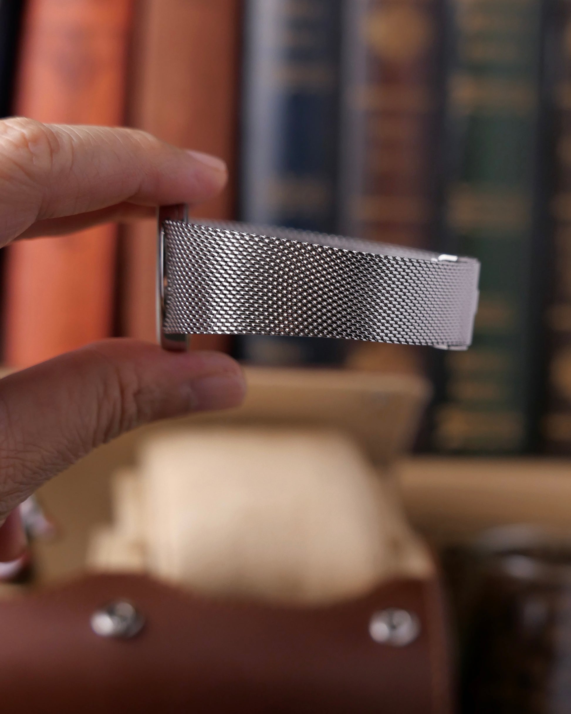 Integrated tapering steel mesh with UG-signed free-adjust tuck clasp