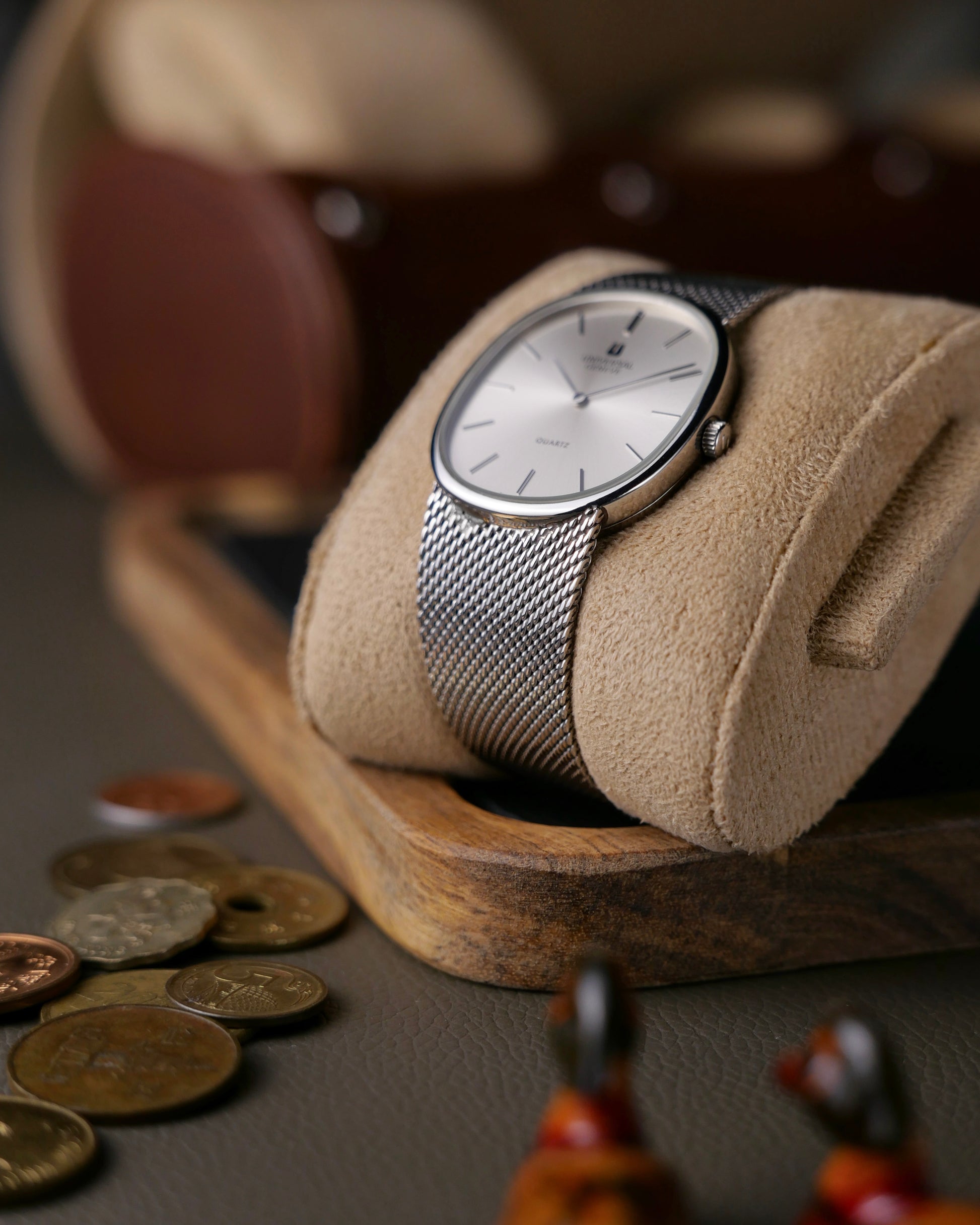 Silver-dialed version of the UG “Blue Ellipse” we had previously. Equipped with an in-house quartz calibre, made in small numbers at the end of this model’s lifecycle during the late-stage era of UG. Emblematic of the brand’s last-ditch attempt to join the quartz revolution and even rarer than the microrotor automatics! Not a rip-off of Patek’s Ellipse, but this in fact inspired Patek. Designed by Gerald Genta, and followed by Patek two years later. An unsung hero from UG’s history, but now the target of collectors who are done with overhyped Polerouters, Tri-Compax and Nina Rindts. A fantastic specimen with a pristine warm silver dial. Looks and feels more expensive than it is and incredibly versatile whether as a daily or occasional special piece.