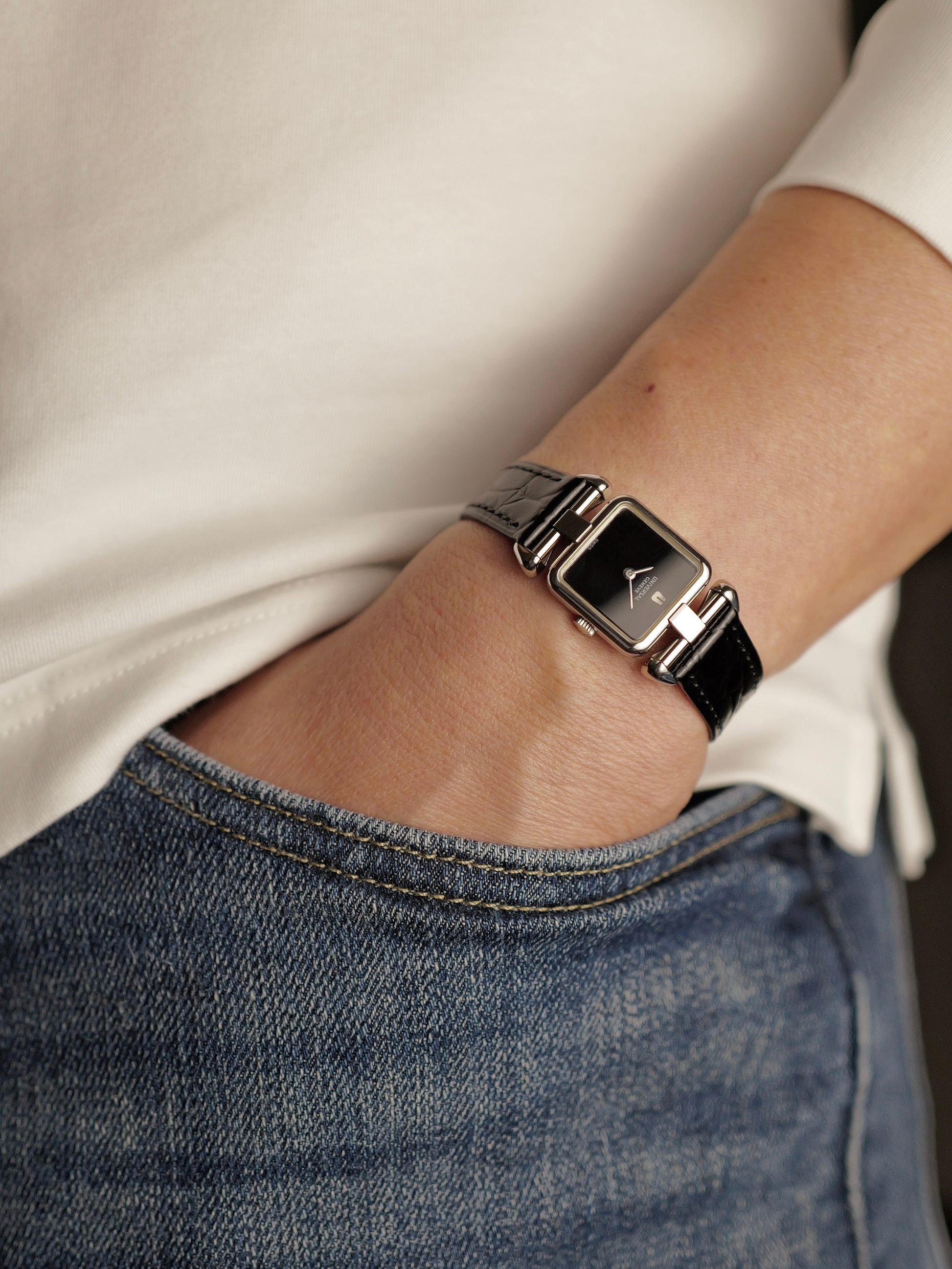 An absolutely beautiful UG with not just the hooded, hinged, reversible, crab claw lugs we’ve come to love, but also a rounded square case shape and an exquisite deep black index-less dial with applied UG logo. Truly an exceptionally elegant and versatile piece but we must warn you that onlookers may harass you to find out more about it lol. Interestingly shaped watches are so typical of the 60s and 70s and as relevant as ever today. Followers know our love for UG. Once a high-end brand, crushed by the quartz era, but on the verge of revival under Breitling. Beyond hyped models like Polerouters/Tri-Compax are uncommon, dressy treasures like this, waiting to be discovered at amazing value. Serviced and warrantied.