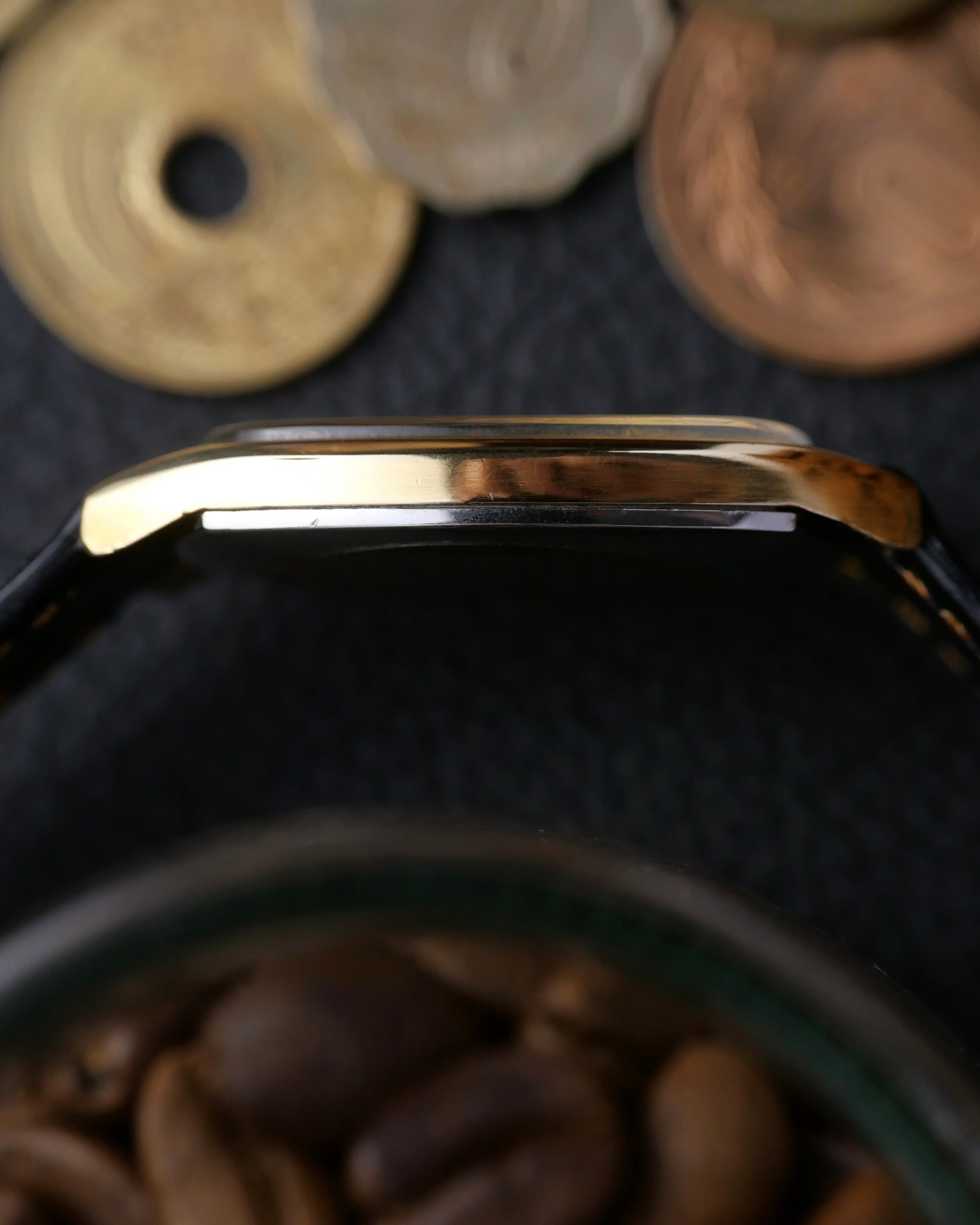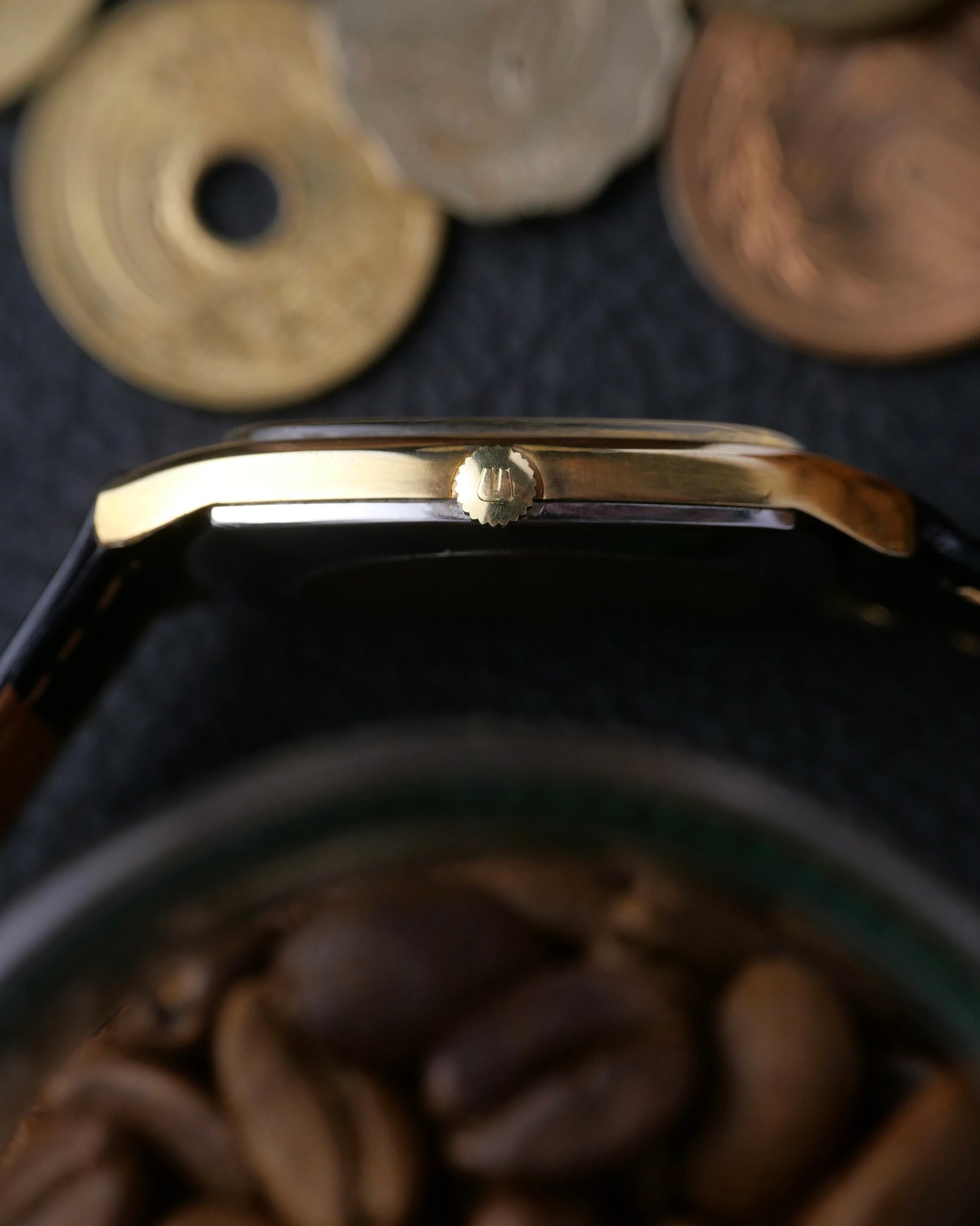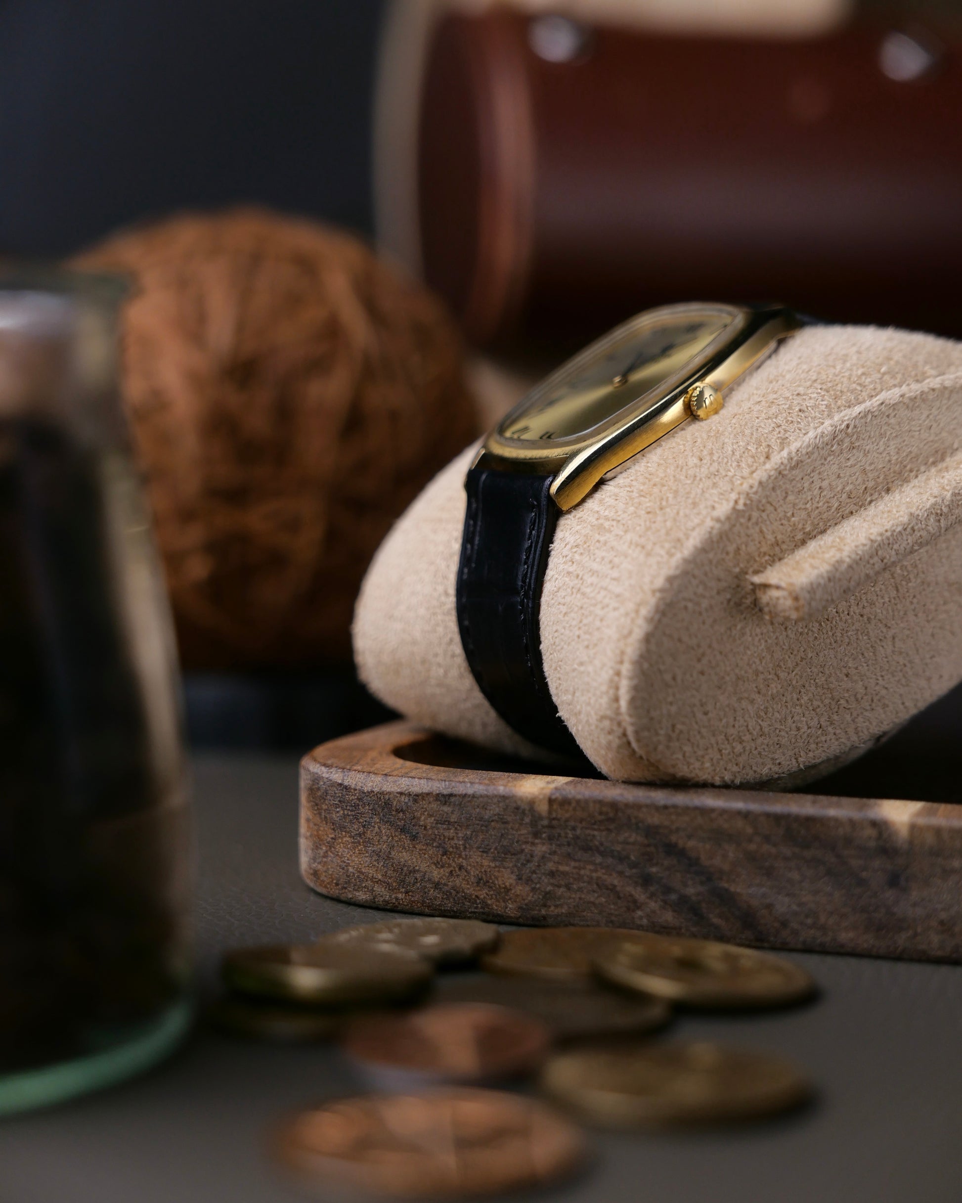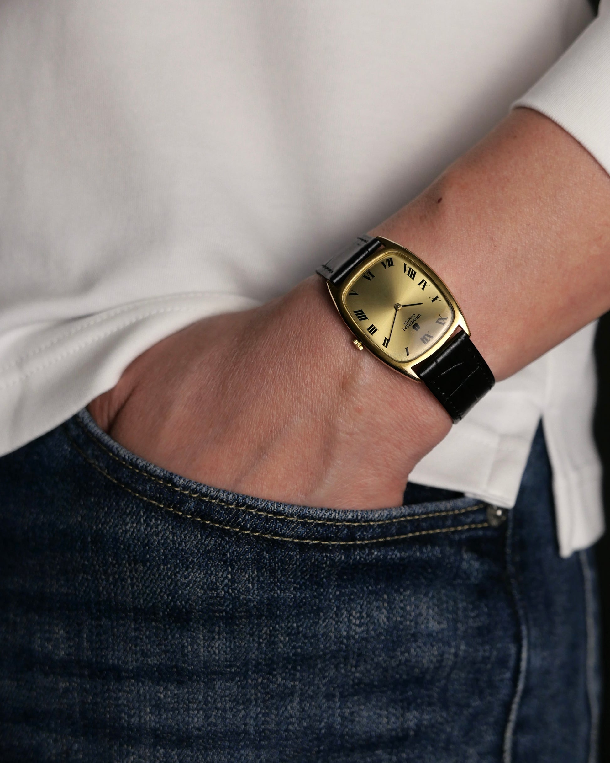 A very bold on-wrist presentation from this tonneau-shaped ultra-thin. With a deeply textured champagne sunburst dial (significant light- and shadow-play) and thick black Roman numerals. Serves perfectly as a dress watch but because of the larger footprint, is well-suited as a daily driver too. This case shape is both typical of the 70s as well as ever-relevant today. Followers will know our love for UG. Once a high-end brand, crushed by the quartz era, but on the verge of revival under Breitling. Beyond hyped models like Polerouters/Tri-Compax are simple, dressy treasures like this, waiting to be discovered at amazing value.
