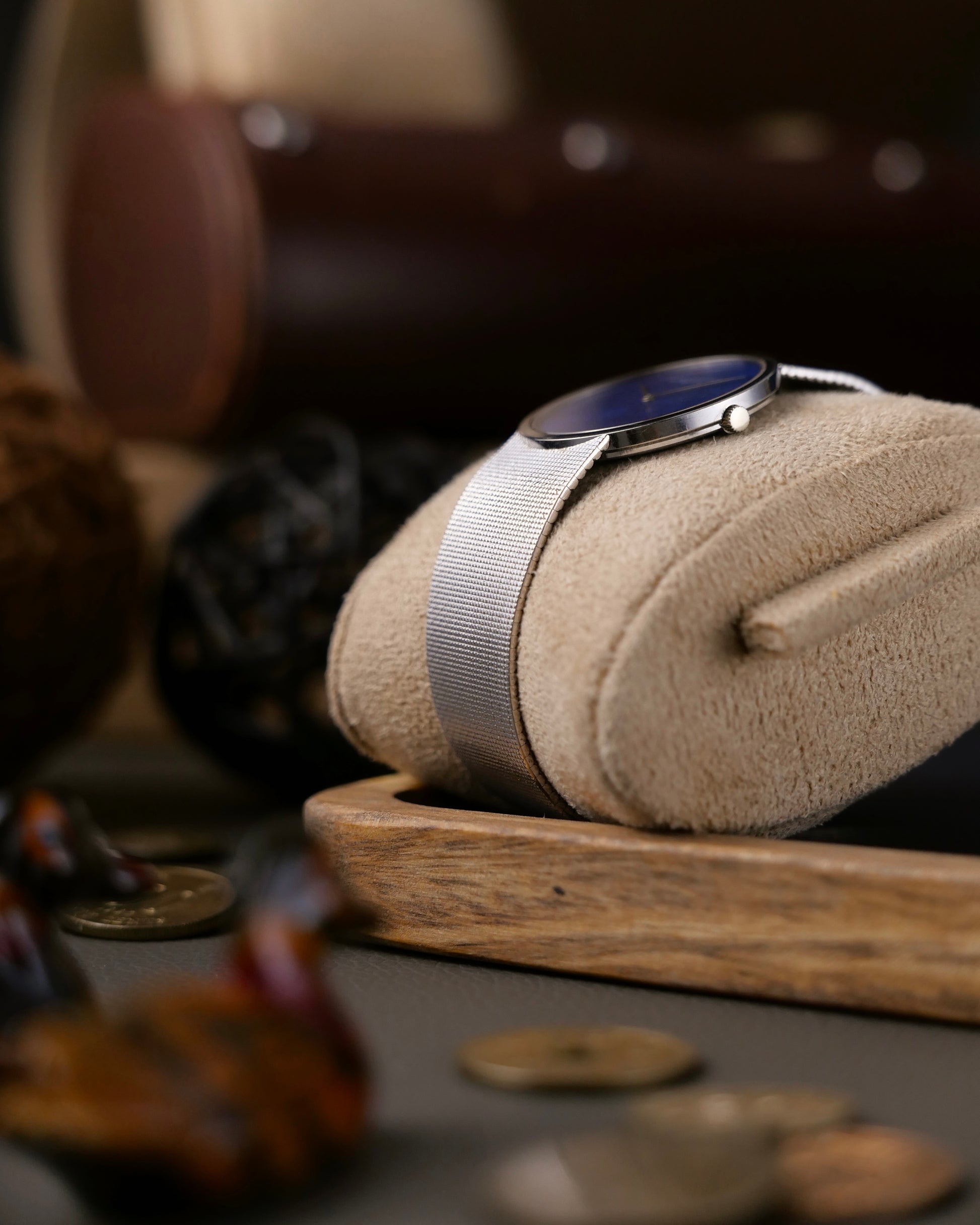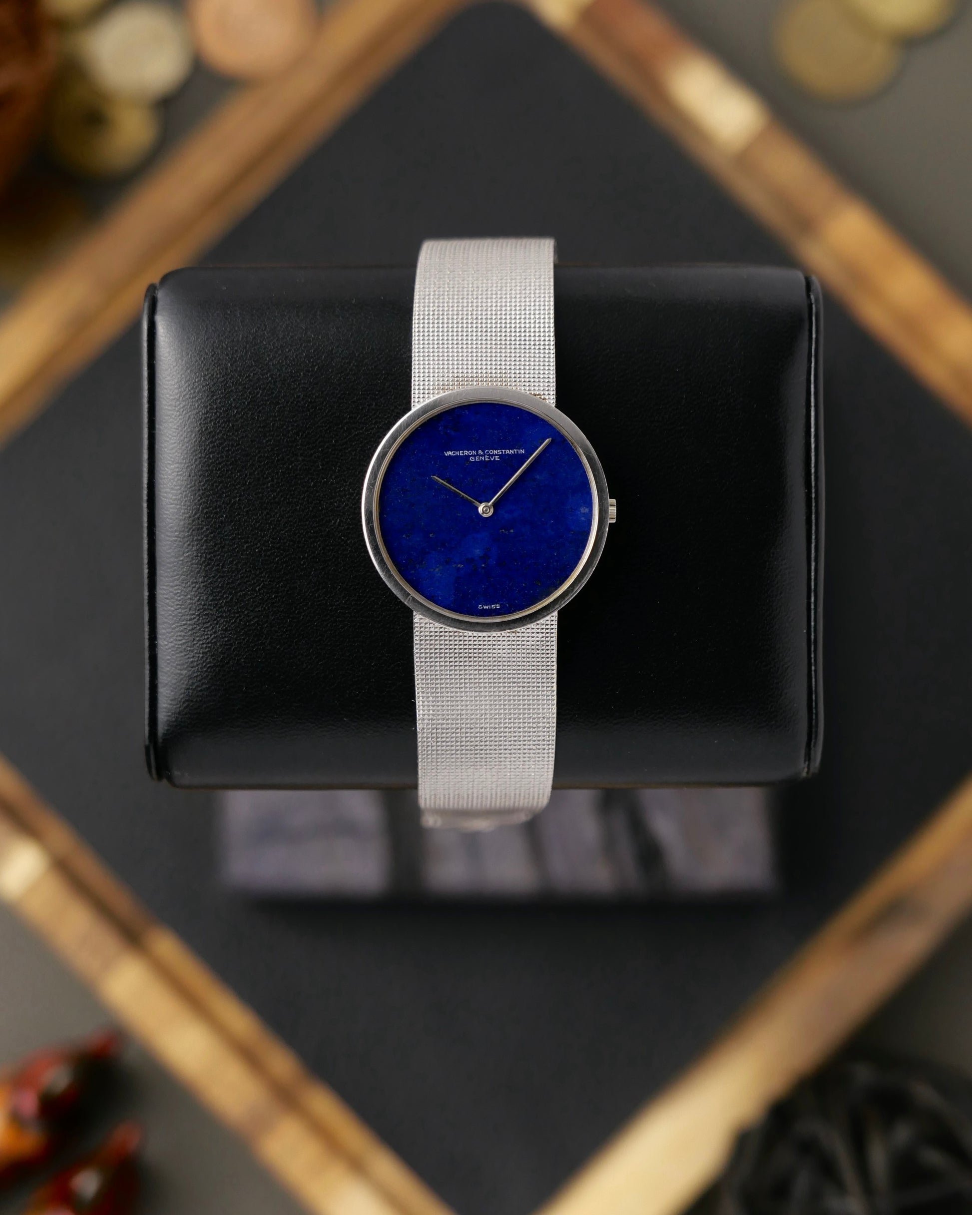 A stunning, ultra-thin, early 70s Holy Trinity piece. VC is one of the oldest haute horlogerie brands in the world with an uninterrupted history since 1755 and this watch is a time capsule of some of its last dials signed “Vacheron & Constantin” for the Vacheron family x François Constantin partnership (the ampersand would be dropped forever soon after). 18K white gold case, supple integrated “clous de paris” white gold bracelet, and that spectacularly rich blue lapis lazuli stone dial. Within this 4.5mm-thin watch is the impossibly wafer-like 1.64mm, Geneva Hallmarked Calibre 1003 which was proudly reissued by the brand in 2015 and remains one of the thinnest in the world still. This is one of those pieces where discussions of mere beauty can never overshadow the inimitable feel of something truly special on the wrist. Probably the lowest-priced in the world and not to be missed (ask us for pricing comps!).