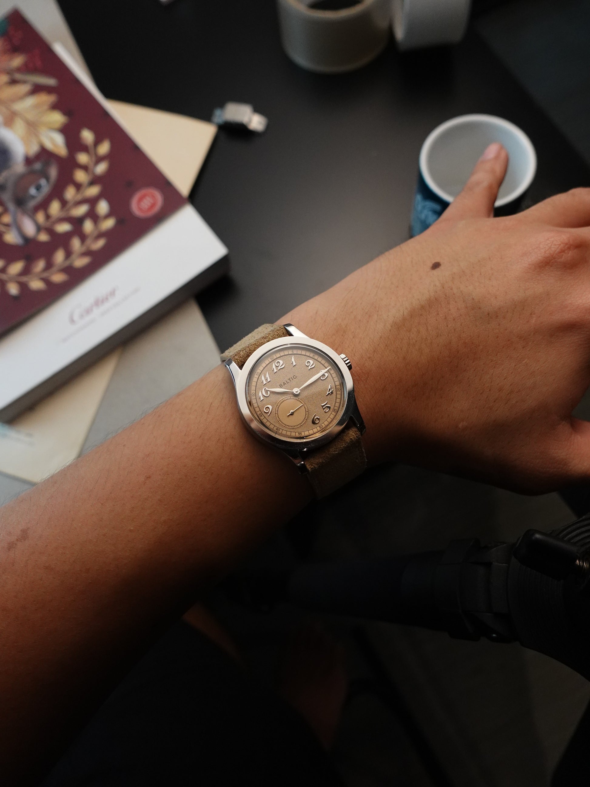 A microbrand which comes with arabic numerals and a subsecond dial on the 7 o'clock of the watch. comes with both a strap and a Bead of Rice bracelet.