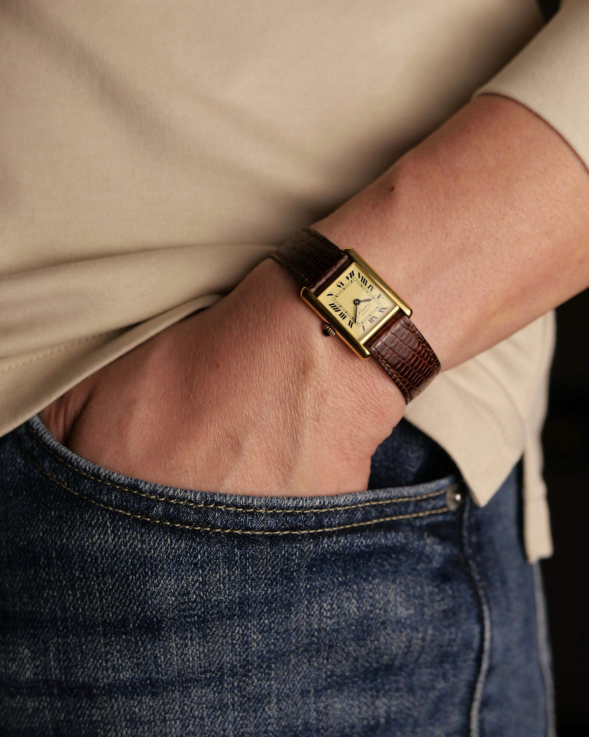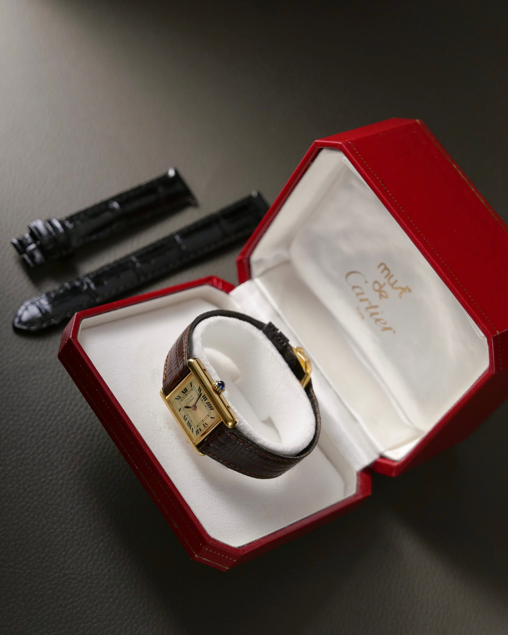 The importance of Must de Cartier Tanks is often overlooked. They were instrumental in saving Cartier 50 years ago when the economic boom of post-WWII France faded, and with it, demand for luxury. Further, cheap mass-produced quartz watches were flooding in from Asia. Cartier’s solution? Make accessible versions of the (otherwise full-gold) iconic Tank LC but in gold-plated silver (so still fully precious metal), and fitting them with Swiss quartz calibres. This took the market by storm and kept Cartier’s watch business afloat, unlike much of their European counterparts. This historical piece is in the small size, with a “lemon Roman” dial, black sword hands, and signature chemin de fer track. Over 90% were quartz, but this one is manual. Comes with original box, strap, buckle. Classy, classic and oh-so-demure!