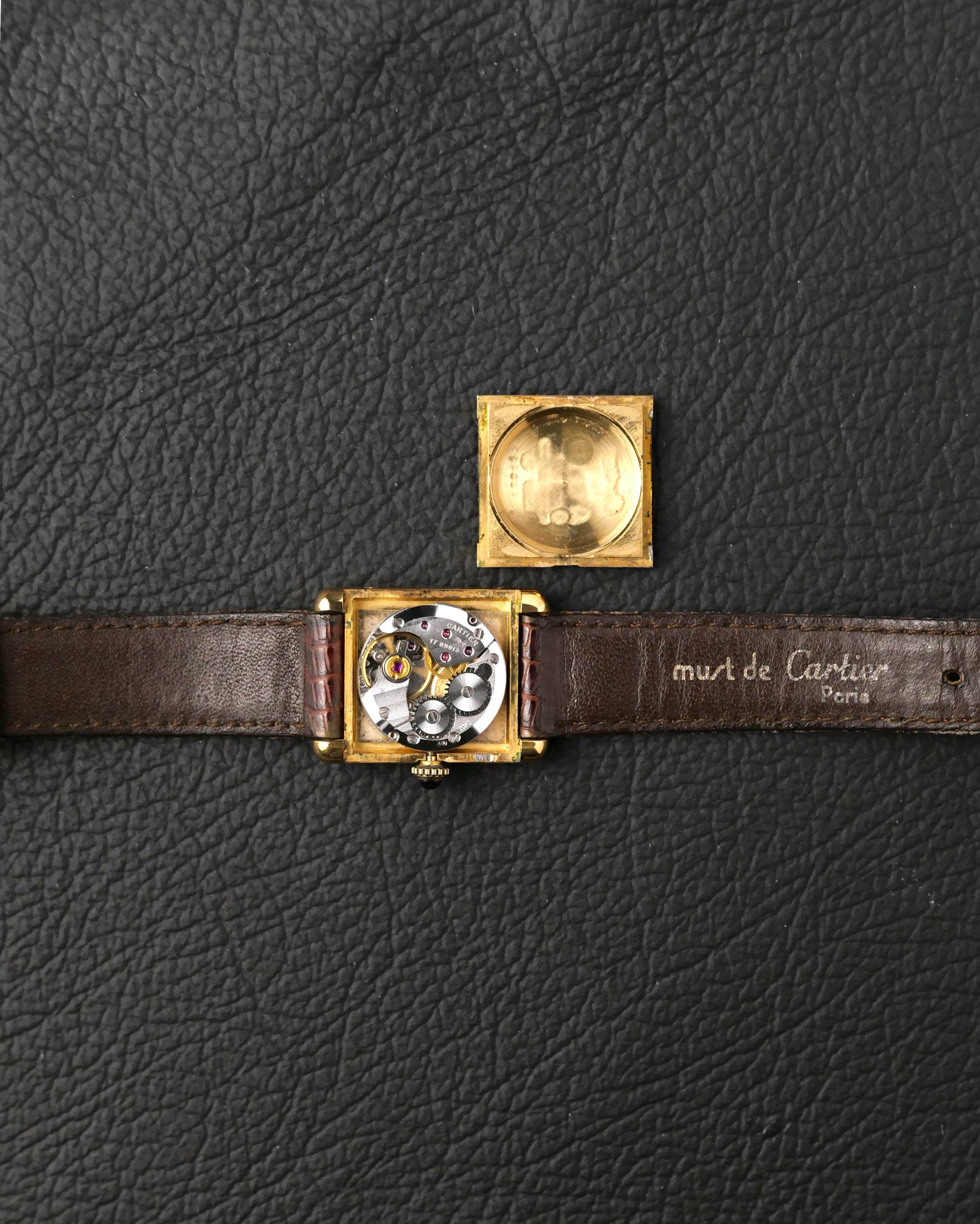9/10, with minimal light hairlines. Crystal has a few tiny marks visible only under a loupe. Hands clean. Lacquer dial has subtle spidering, a lot less than normal for the age and indicate unreplaced originality. Caseback engravings/hallmarks deep and crisp. Original Cartier strap in usable used condition. Original Cartier buckle has light hairlines. Movement in very good health with above-spec power reserve, strong amplitude, low beat error and accuracy ±10 secs/day averaged from 6 timegrapher positions.