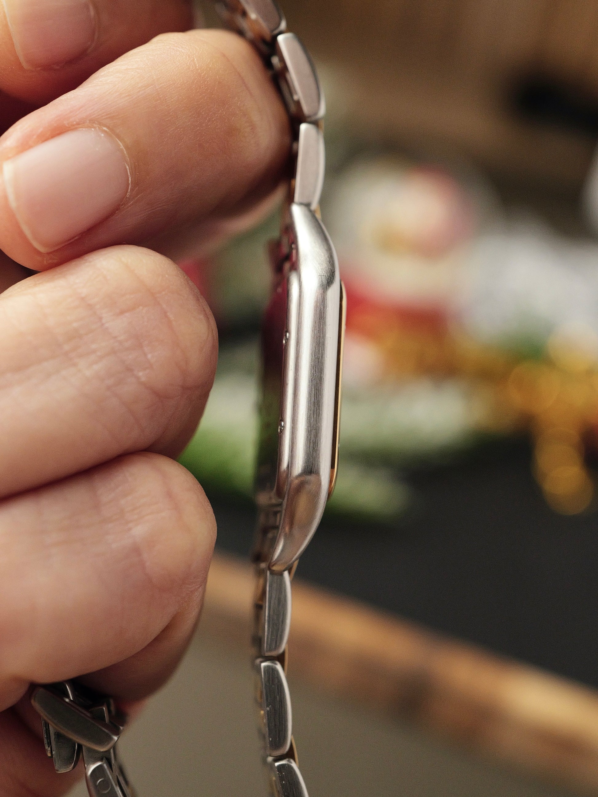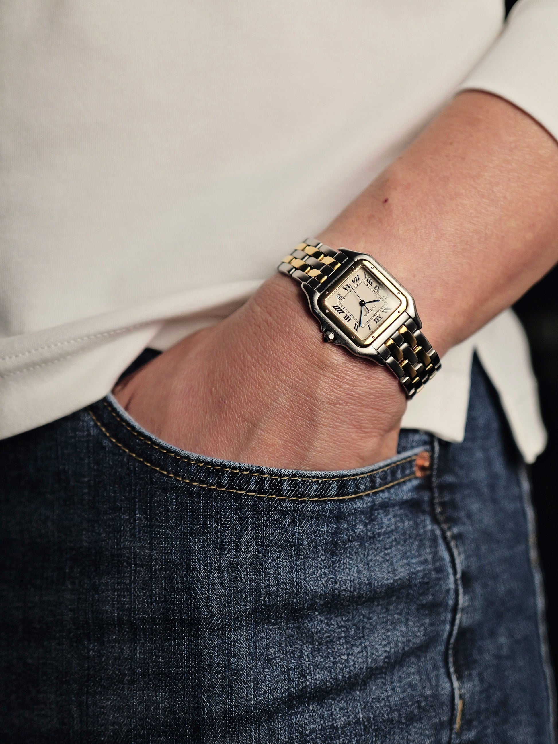 Cartier’s relationship with panthers goes back 112 years to 1913; a recurring source of inspiration originally symbolising grace, power and beauty for strong women of society. It is believed Louis Cartier called Jeanne Toussant (lover and later Cartier creative director) his “petite pantheré”. Pantheres started with one watch, and later became a line of jewellery, before coming back as watches in 1983 (for both women and men), and continues today as both watches and jewellery. The unisex Medium version here is an early version, with the strength of a square dial and bezel, the grace of rounded edges and corners, and the feline suppleness of a multi-link bracelet. With a lovely creamy grained dial and iridescent blued hands. Striking a deft balance between the understatement and versatility of satinized steel, with the luxury and dressiness of polished 18k gold. In great condition and comes with full set (Panthere box, not generic Cartier box, and warranty papers/literature). A full and authentic 80s experience of a romantic smash-hit Cartier.