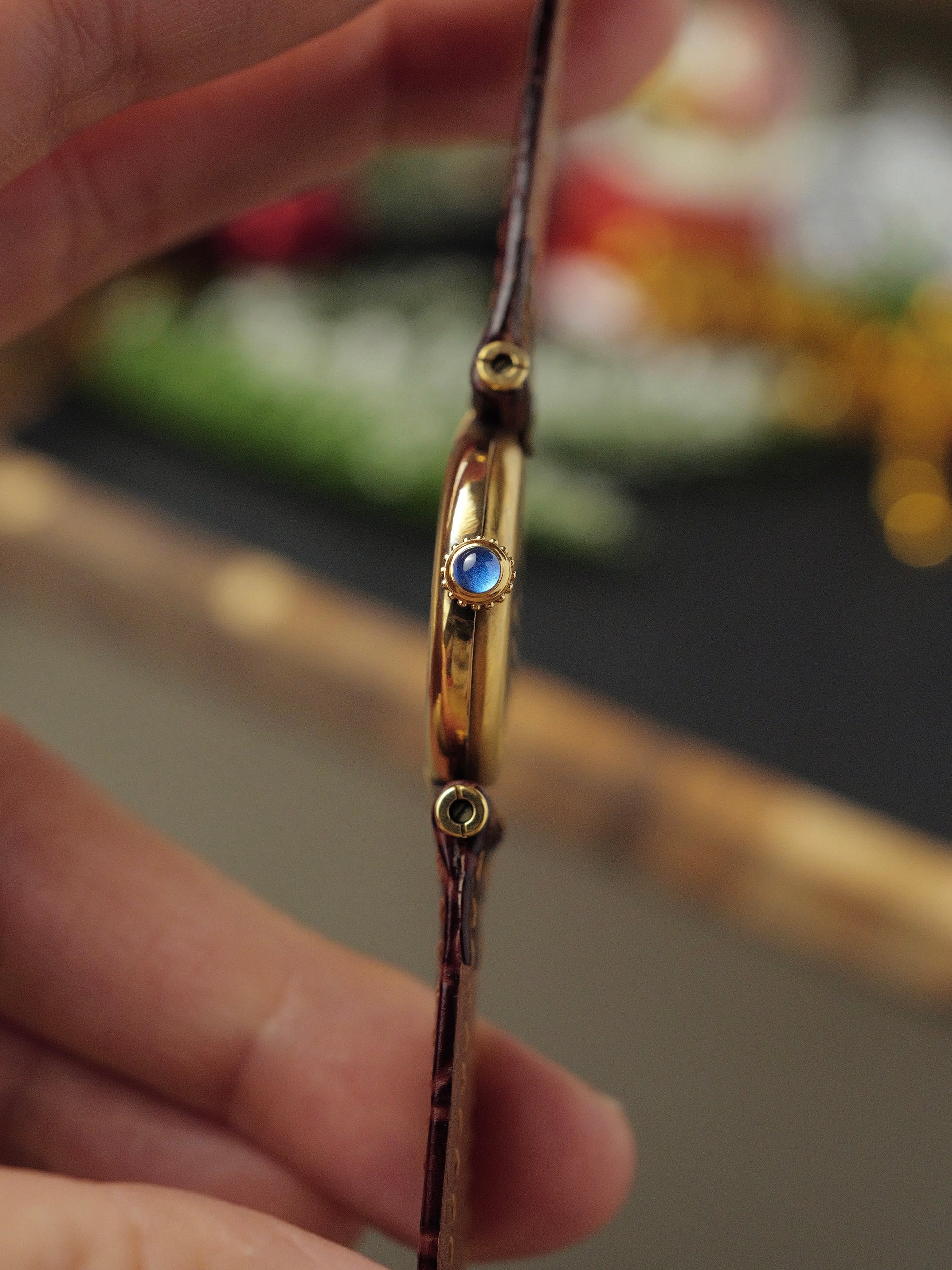 9.5/10 with only very small signs of wear. Crystal, dial, hands and cabochon are clean. Caseback has crisp and deep engravings and hallmarks. Aftermarket strap is new and original Cartier buckle is excellent. Movement in excellent health, and quartz-accurate.