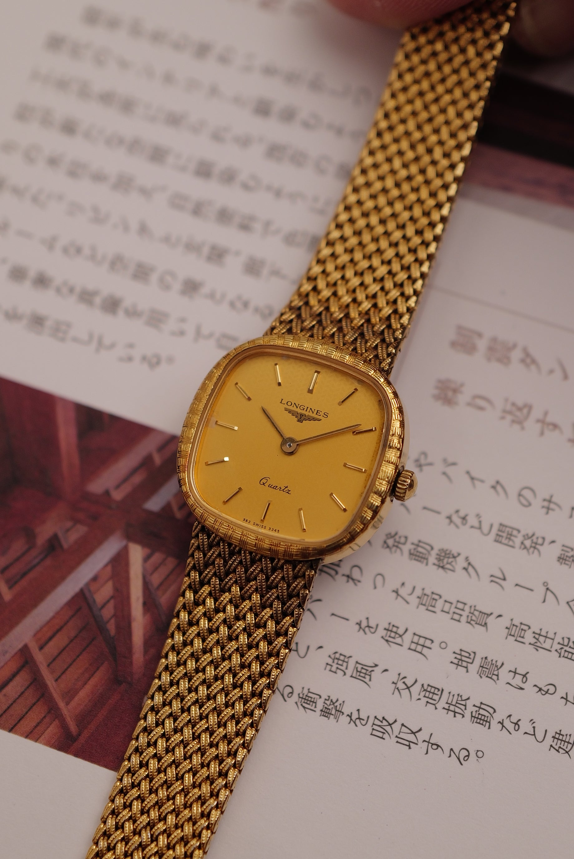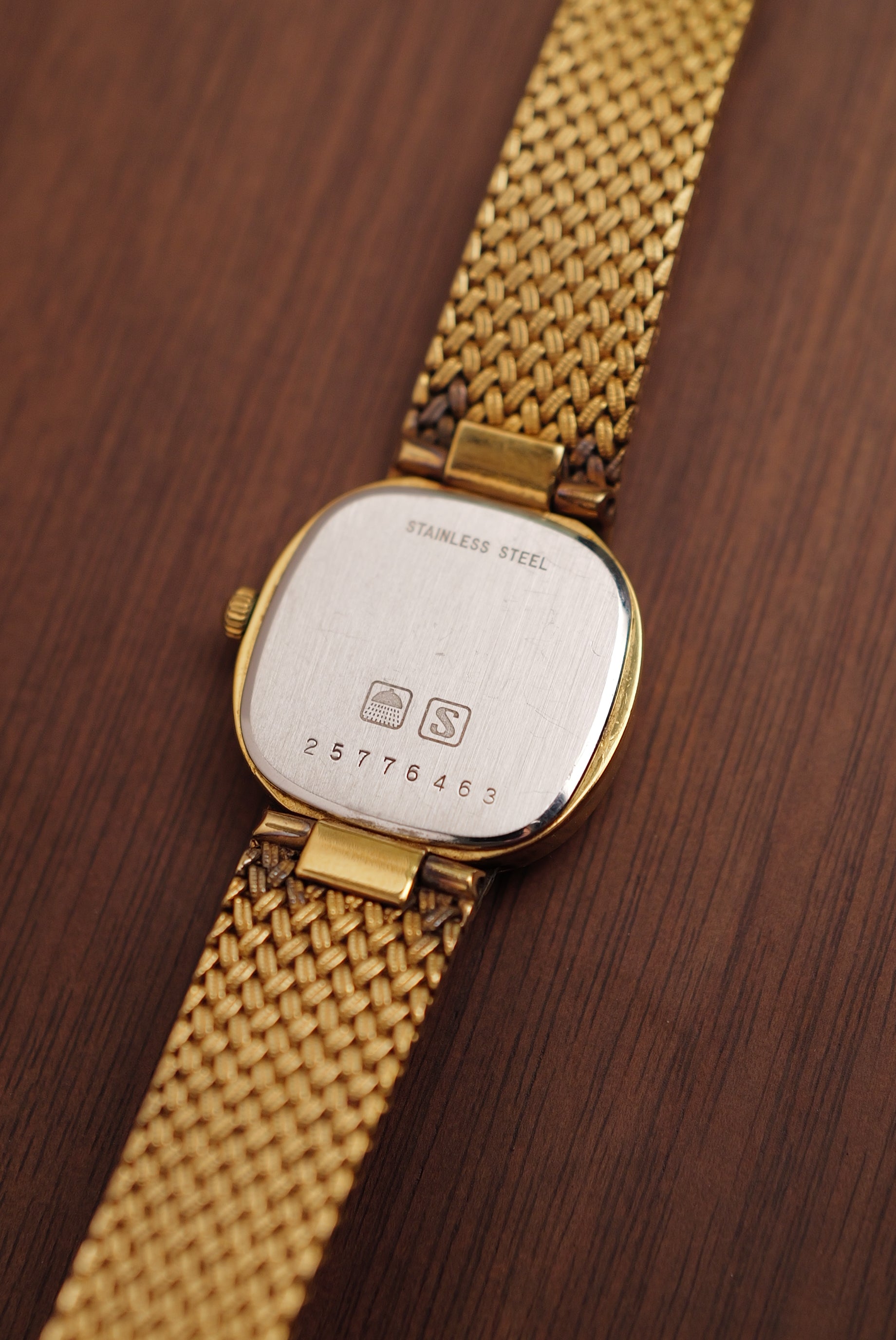 | Watch Summary | This watch immediately catches my eye with its gold-flecked textured dial which gives the piece a uniquely elegant shimmer without being overpowering. The case itself features an square shape with soft edges and a minimalist layout , not to mention the most striking aspect of this piece is the woven gold-tone integrated bracelet, |