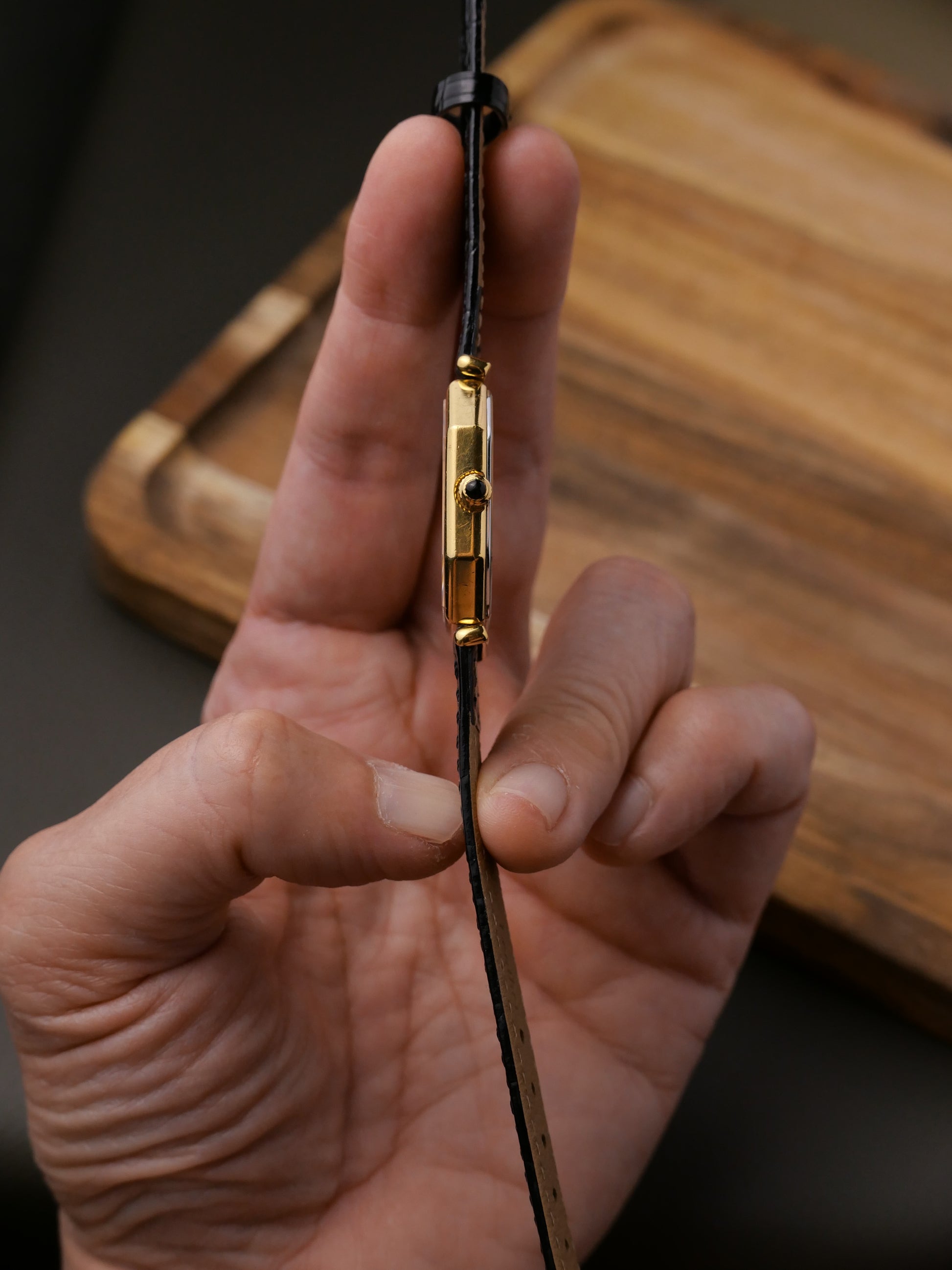 We had a 5097 Octagon two weeks ago which we’ve rescheduled for servicing. At first glance this is the same watch with a black gilt dial, but other than coming from the same desirable line, it’s quite different! Firstly this isn’t a square-octagon, but more a rectangular octagon. It’s narrower, but wears bigger. 17mm strap, not 14. The hands are feuille, not spade. Lugs are a fusion of hooded/crab claw rather than wire. The crown has a cabochon. And in superb condition, with original buckle. An uncommon find indeed. Run, don’t walk!