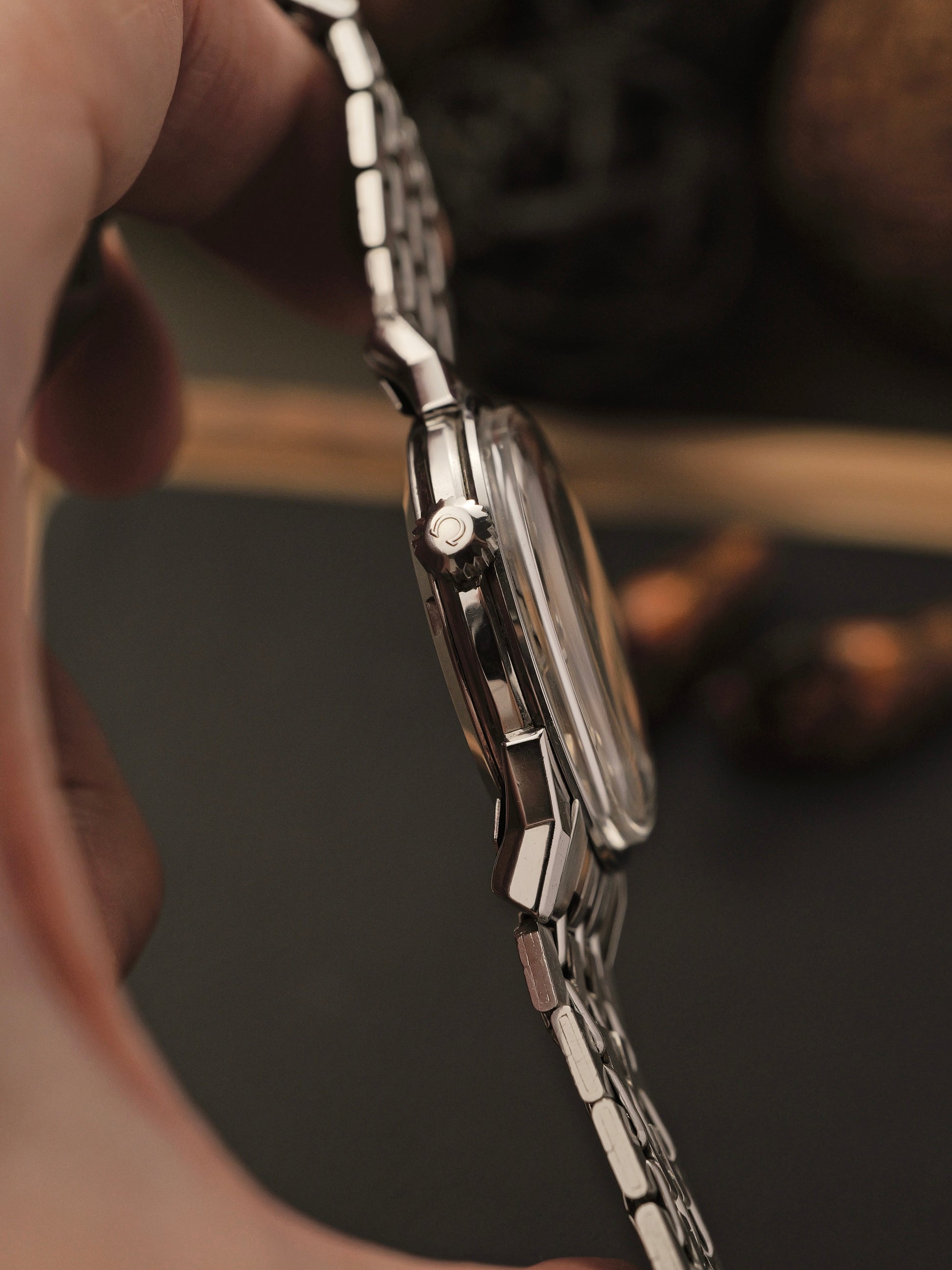 8.5/10, with light hairlines and a few tiny nicks. Sharp case lines, bevels and edges. Original signed crystal has fine marks barely visible. Signed crown is original Omega but a replacement item; a common practicality due to scarcity. Dial has some mild age spots. Hands, indices and dial text super clean. Aftermarket bracelet has notable stretch but remains in perfectly usable condition. Movement in excellent health with near-spec power reserve, high amplitude, low beat error, and accurate to ±5 secs/day averaged from 6 timegrapher positions.