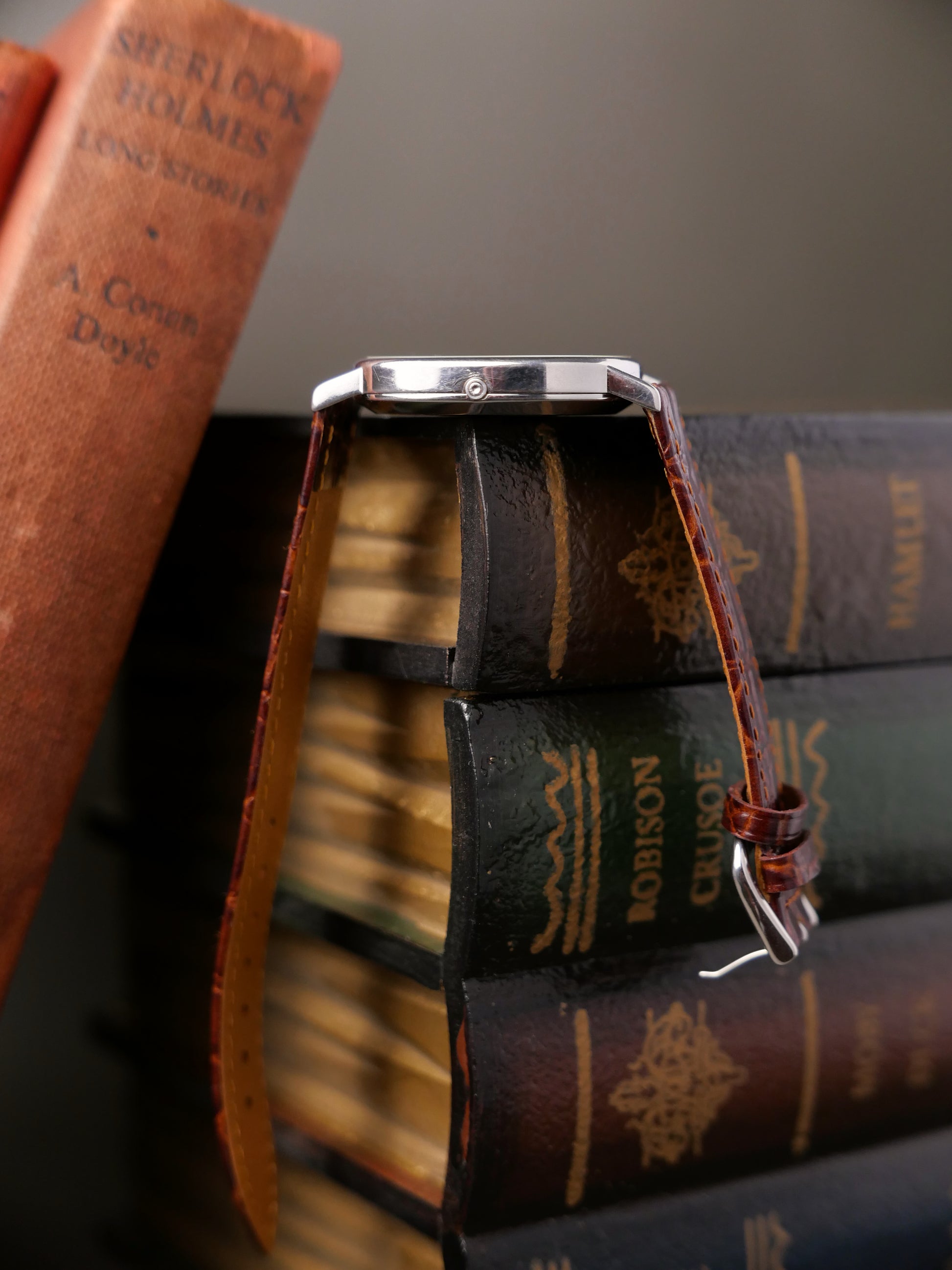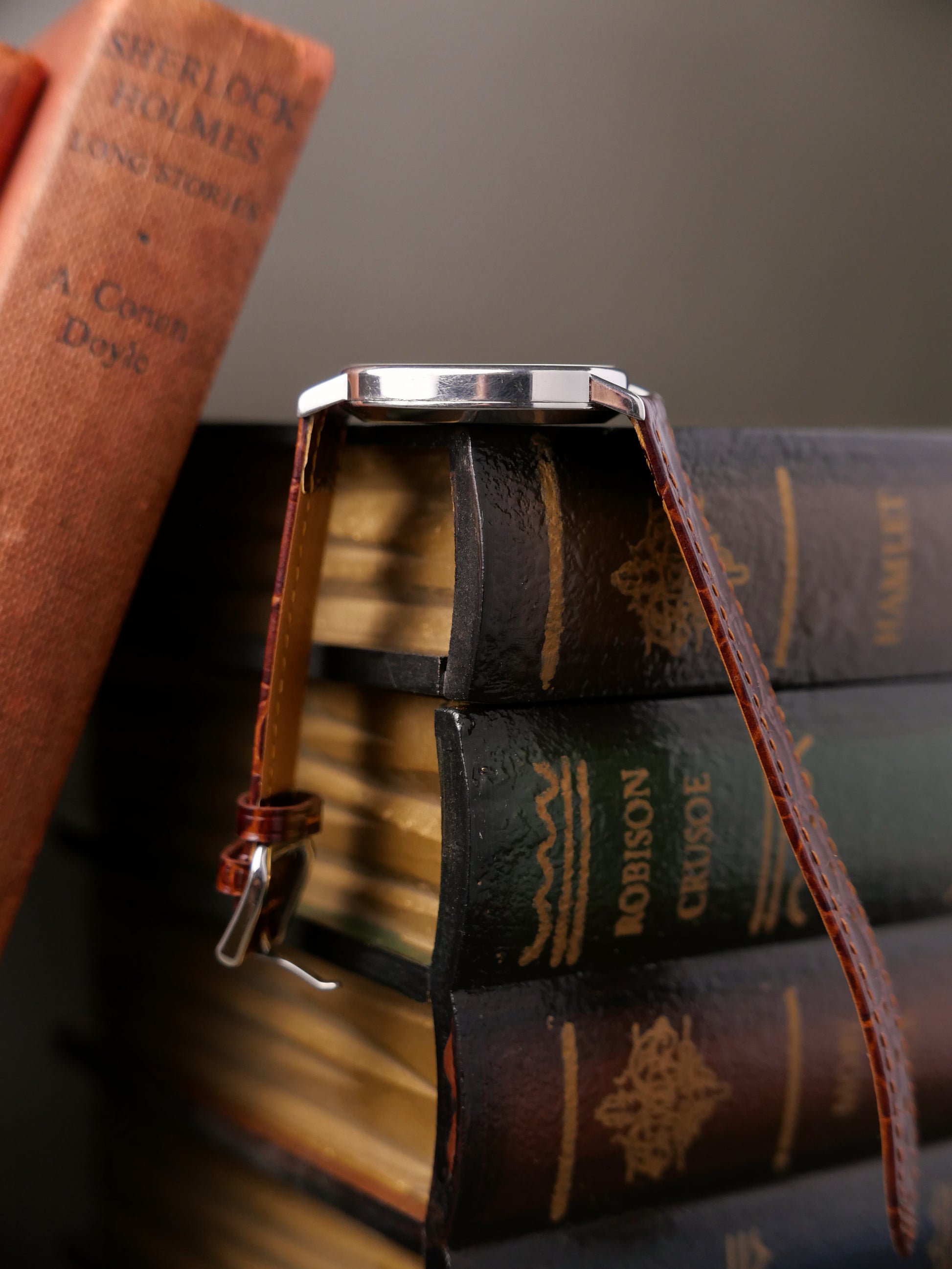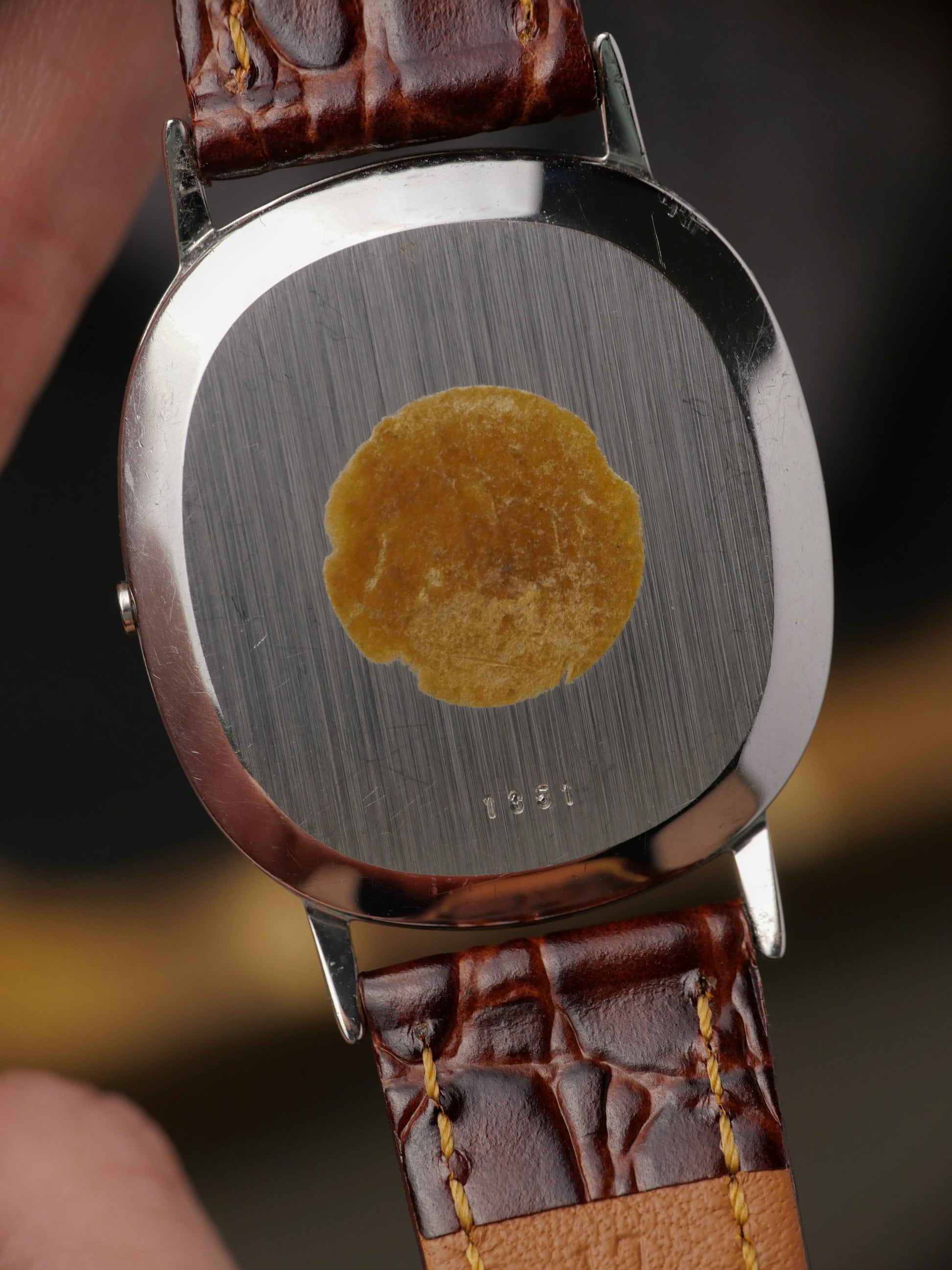 A lovely ellipse-shaped Omega with a wide-open minimalist ivory dial and equally minimalist baton markers and pencil hands. In very practical stainless steel and a ready-whenever-you-are quartz movement. Overall, perhaps the most understated and daily-able of ellipses ever. Easily dressed up or down with a change of straps. Proportions are exquisite and again sit right within that overlap between dress watch and elegant daily too. There’s no crown (just a single pusher), an Omega statement on accuracy and lack of need for frequent adjustment. At this price, who could ask for more?