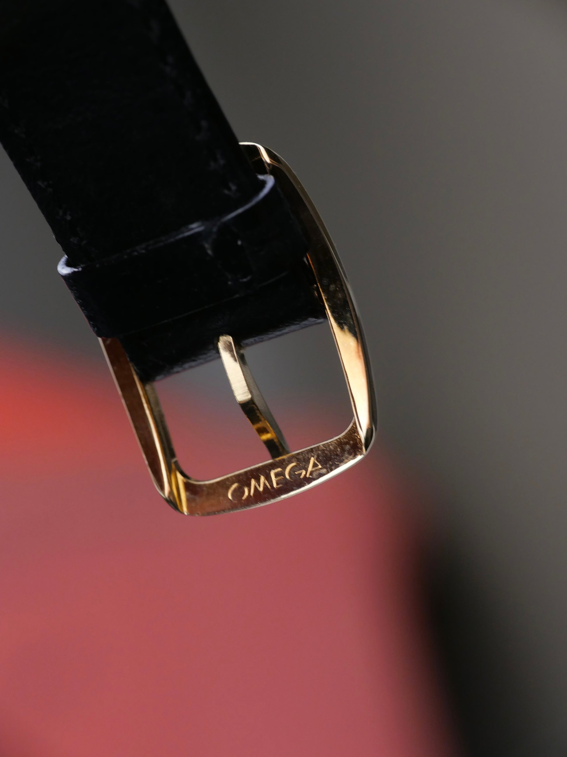 STRAP: Original Omega grained semi-gloss black leather, original Omega gold-plated pin buckle (14mm)