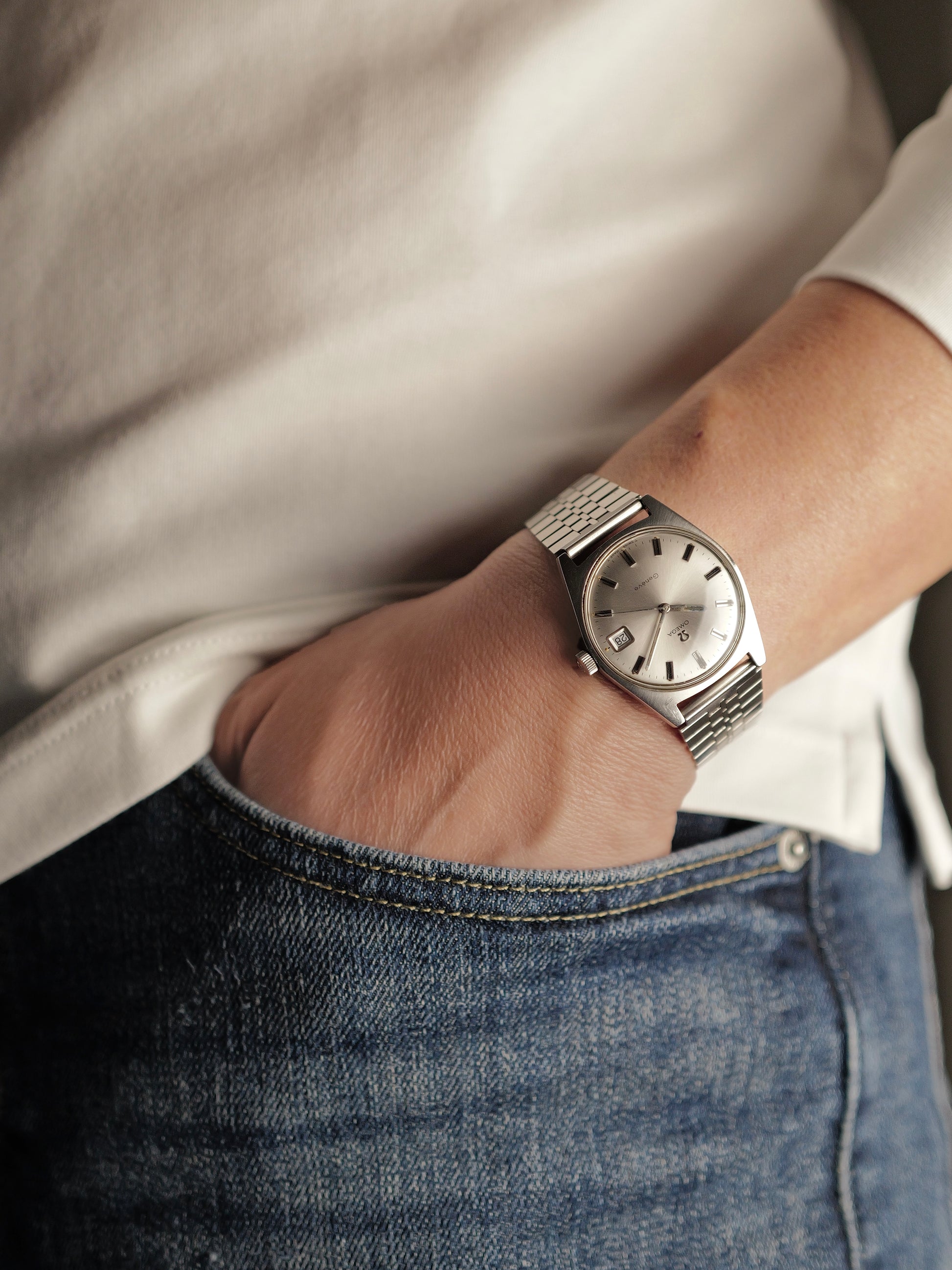 Genève models are some of the best value Omegas. Initially a flagship dress line in the 50s, Genèves took a backseat in the 60s as Speedmasters/Seamasters rose to fame. But Omega kept refining the collection, bringing affordability through simpler cases without compromising mechanical quality. By the late 60s–70s, they experimented with bold shapes, so this one is relatively tame with its wide-appeal hybrid cushion-tonneau shape we sometimes see in vintage skin divers. Love the expansive, gently domed silver sunburst dial with those broad indices featuring onyx black inlays for legibility. Equipped with a respected, solid, robust and serviceable Omega Cal. 613 from the 6xx series. Dripping with classic vintage charm, with a somewhat toolwatch/elegance contrast and excellent wearability!