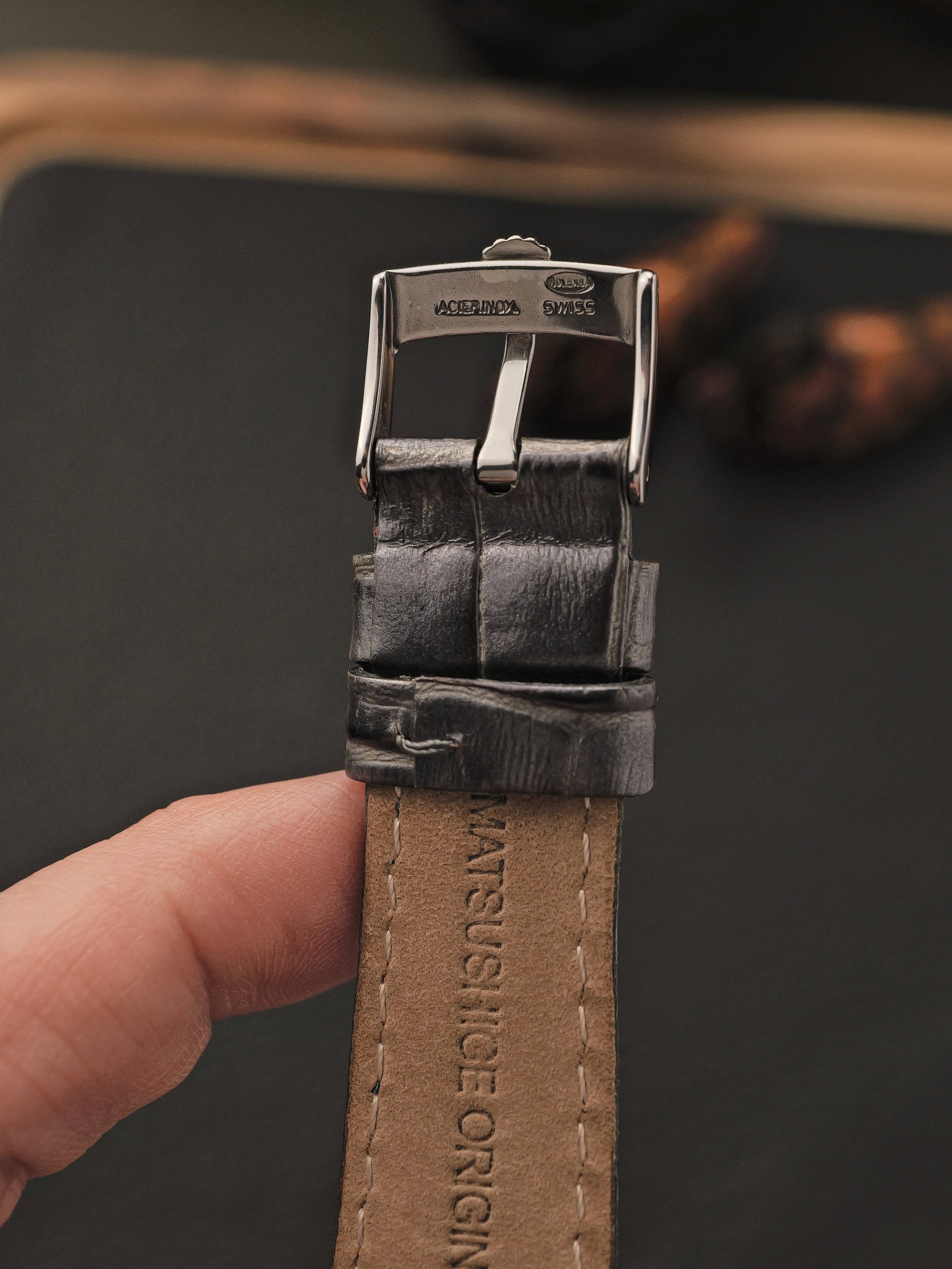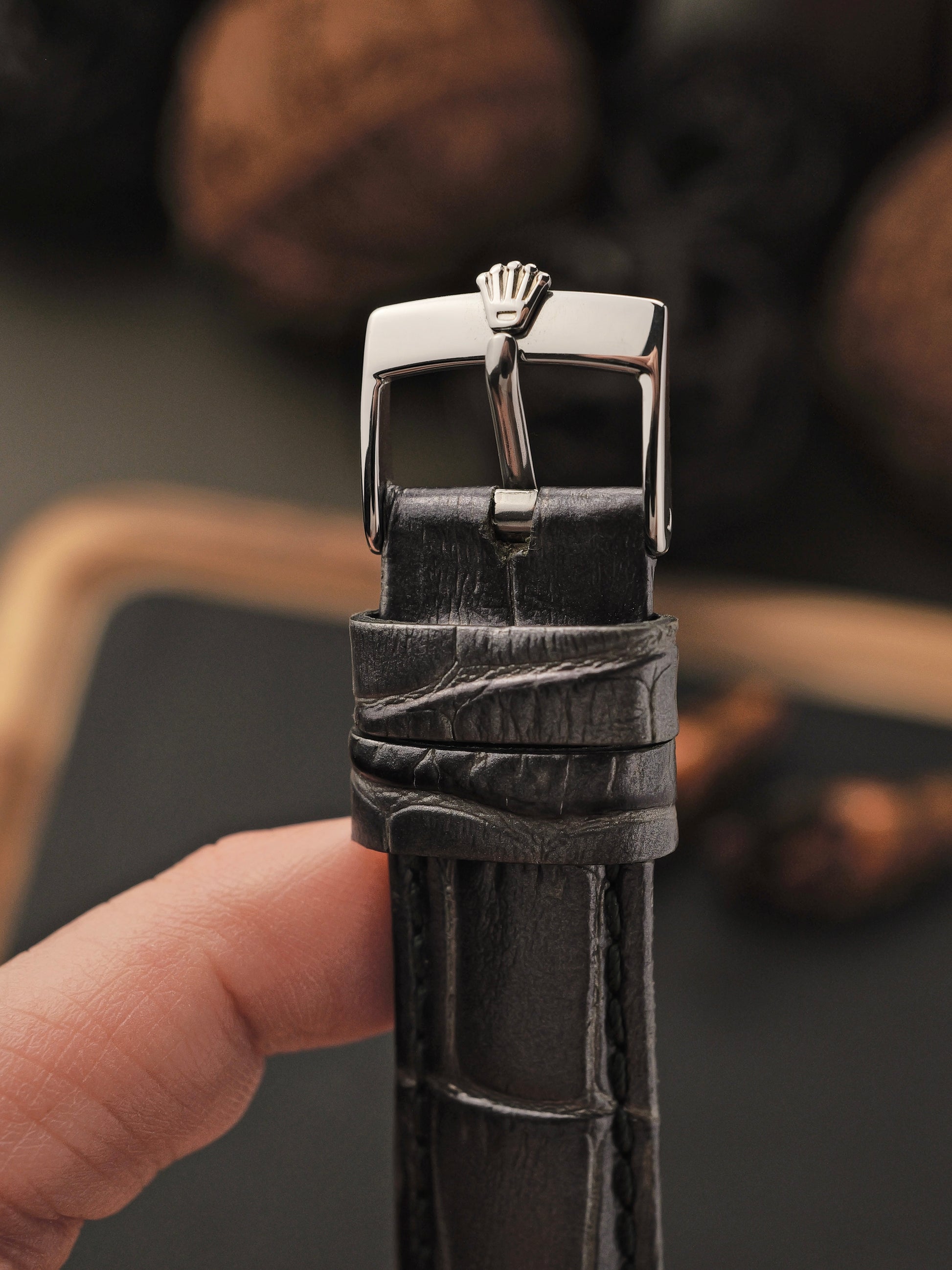 New aftermarket silvery grey croc-embossed, used aftermarket black leather, Rolex-signed buckle and generic buckle (both 16mm)