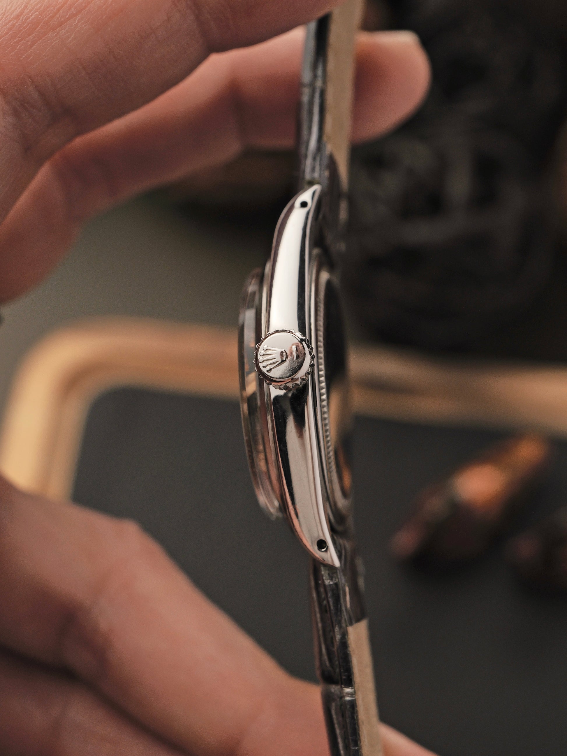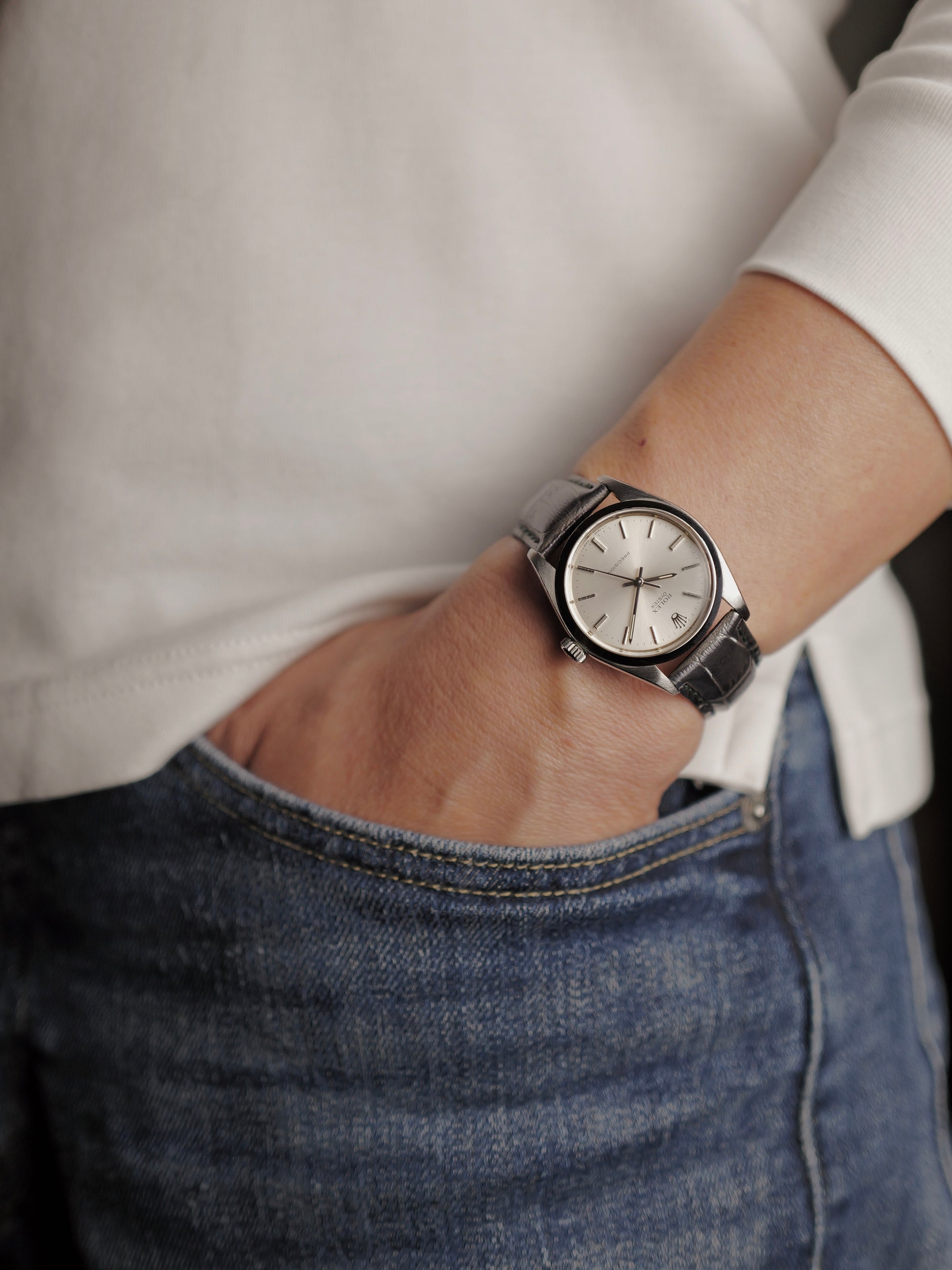 Probably my favourite vintage Rolex ever. Pretty much the same watch as the Oysterdate Precision 6694 (see our other listing in this drop) but without the date, no magnifying cyclops lens, a sleeker crystal profile and noticeably thinner overall. It doesn’t get better than this for a classic, no-nonsense, dependable, understated daily Rolex; capturing the purity of an era that forged the success of Rolex. Marketed as “34mm” (actually 35mm), traditionally considered the “men’s size” back when watches were more elegant and discreet. Absolutely exquisite on the wrist, with the versatility of that silver sunburst dial, perfect dial symmetry and dripping with understated vintage Rolex feels. Comes with box and booklet.