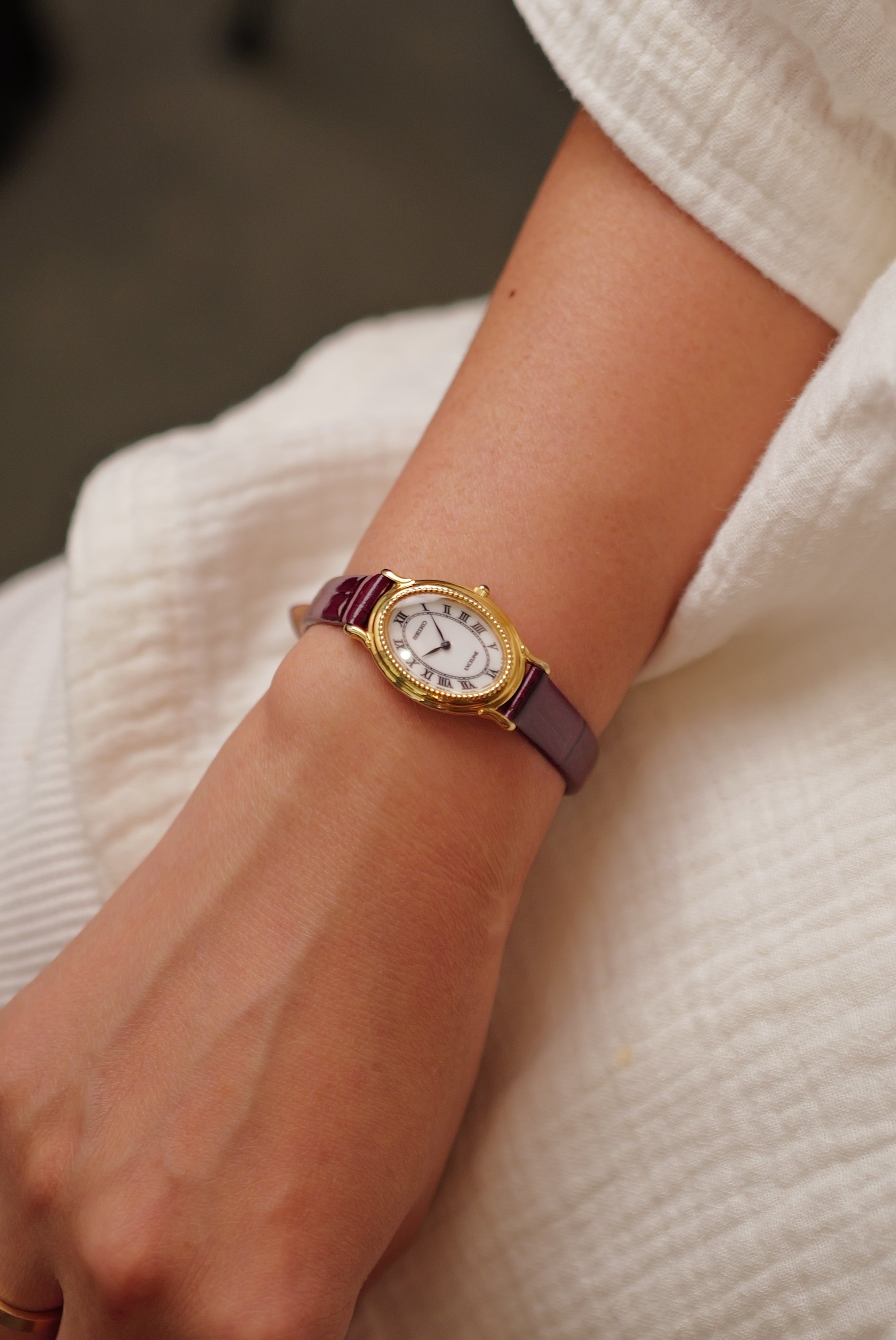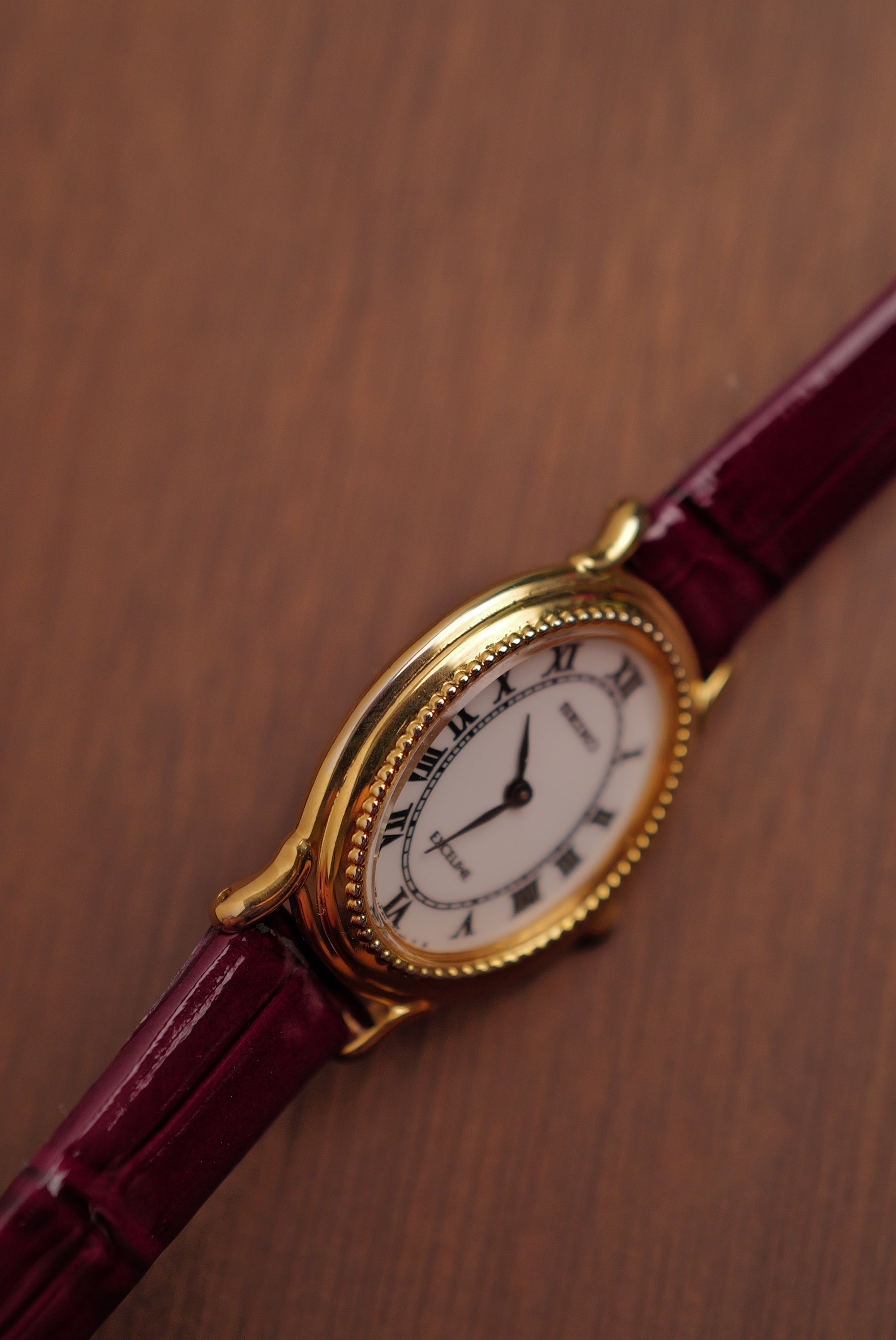 | Watch Summary | One of the most beautiful exceline for those who do not prefer the mother of pearl variation. The classical roman numerals and a beaded bezel deisgn. Tear-drop lugs with a convex glass completes the overall oval shape. Comes attached on a new aftermarket strap and buckle. |